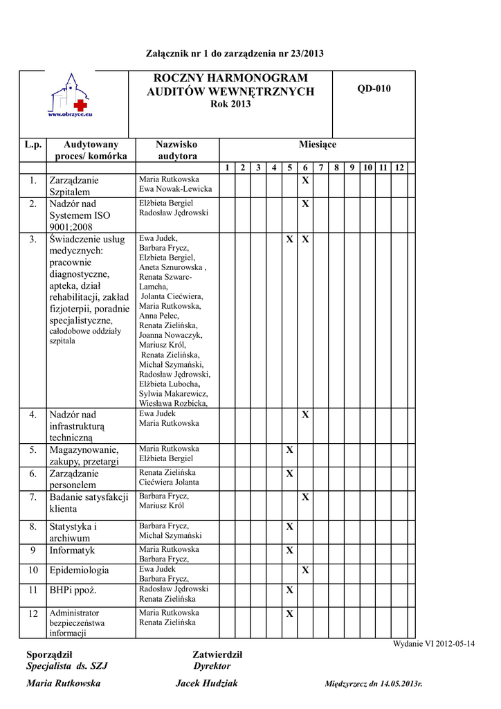 Załącznik nr 1 do zarządzenia nr 23/2013 ROCZNY HARMONOGRAM AUDITÓW WEWNĘTRZNYCH QD-010 Rok 2013 L.p. Audytowany proces/ komórka Nazwisko audytora Miesiące 1 1. 2. 3. Zarządzanie Szpitalem Nadzór nad Systemem ISO 9001;2008 Świadczenie usług medycznych: pracownie diagnostyczne, apteka, dział rehabilitacji, zakład fizjoterpii, poradnie specjalistyczne, całodobowe oddziały szpitala 4. 5. 6. 7. 8. Nadzór nad infrastrukturą techniczną Magazynowanie, zakupy, przetargi Zarządzanie personelem Badanie satysfakcji klienta 9 Statystyka i archiwum Informatyk 10 Epidemiologia 11 BHPi ppoż. 12 Administrator bezpieczeństwa informacji 2 3 4 5 6 Maria Rutkowska Ewa Nowak-Lewicka X Elżbieta Bergiel Radosław Jędrowski X Ewa Judek, Barbara Frycz, Elzbieta Bergiel, Aneta Sznurowska , Renata SzwarcLamcha, Jolanta Ciećwiera, Maria Rutkowska, Anna Pelec, Renata Zielińska, Joanna Nowaczyk, Mariusz Król, Renata Zielińska, Michał Szymański, Radosław Jędrowski, Elżbieta Lubocha, Sylwia Makarewicz, Wiesława Rozbicka, Ewa Judek Maria Rutkowska X X Maria Rutkowska Elżbieta Bergiel X Renata Zielińska Ciećwiera Jolanta X 7 8 9 10 11 12 X Barbara Frycz, Mariusz Król X Barbara Frycz, Michał Szymański X Maria Rutkowska Barbara Frycz, Ewa Judek Barbara Frycz, Radosław Jędrowski Renata Zielińska X Maria Rutkowska Renata Zielińska X X X Wydanie VI 2012-05-14 Sporządził Specjalista ds. SZJ Maria Rutkowska Zatwierdził Dyrektor Jacek Hudziak Międzyrzecz dn 14.05.2013r.