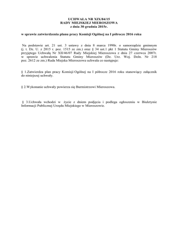 UCHWAŁA NR XIX/84/15 RADY MIEJSKIEJ MIEROSZOWA z dnia 30 grudnia 2015r. w sprawie zatwierdzenia planu pracy Komisji Ogólnej na I półrocze 2016 roku Na podstawie art. 21 ust. 3 ustawy z dnia 8 marca 1990r. o samorządzie gminnym (j. t. Dz. U. z 2015 r. poz. 1515 ze zm.) oraz § 34 ust.1 pkt 1 Statutu Gminy Mieroszów przyjętego Uchwałą Nr XII/46/07 Rady Miejskiej Mieroszowa z dnia 27 czerwca 2007r. w sprawie uchwalenia Statutu Gminy Mieroszów (Dz. Urz. Woj. Doln. Nr 218 poz. 2612 ze zm.) Rada Miejska Mieroszowa uchwala co następuje: § 1.Zatwierdza plan pracy Komisji Ogólnej na I półrocze 2016 roku stanowiący załącznik do niniejszej uchwały. § 2.Wykonanie uchwały powierza się Burmistrzowi Mieroszowa. § 3.Uchwała wchodzi w życie z dniem podjęcia i podlega ogłoszeniu w Biuletynie Informacji Publicznej Urzędu Miejskiego w Mieroszowie. Załącznik do Uchwały Nr XIX/84/15 Rady Miejskiej Mieroszowa z dnia 30 grudnia 2015r. PLAN PRACY Komisji Ogólnej na I półrocze 2016 r. L.p. Temat posiedzenia Data posiedzenia 1. 2. 3. 4. 1. STYCZEŃ 5. 6. Opiniowanie projektów uchwał. Sprawozdanie Komisji Ogólnej za 2015 r. Ocena inwestycji gminnych dokonanych w 2015 r. i przedstawienie planu inwestycji na rok 2016. Oświetlenie uliczne - koszt oświetlenia 2015 r. oraz planowane inwestycje związane z oświetleniem ulicznym w 2016 r. Omówienie kwestii związanej z wydaniem decyzji dla KSS Bartnica oraz informacja na temat stanu faktycznego związanego z wydaniem decyzji środowiskowej dla Spółki MURILLO. Stopień realizacji porozumienia zawartego Uchwałą Nr LIII/258/14Rady Miejskiej Mieroszowa w sprawie dofinansowania realizowanej przez Towarzystwo Budownictwa Społecznego „TBS” Spółka z o.o. z siedzibą w Kamiennej Górze inwestycji „Budowa budynku w Mieroszowie przy ul. Przelotnej z przeznaczeniem na cele mieszkalno- użytkowe”. 1. 2. 2. LUTY Opiniowanie projektów uchwał. Inwestycje planowane z ZIT w ramach Aglomeracji Wałbrzyskiej w latach 2015-2020 ( termomodernizacji i rewitalizacja ). 3. Analiza bieżących spraw oświatowych : -przedstawienie informacji w zakresie zatrudnienia nauczycieli w poszczególnych szkołach i w przedszkolu, -średnie płace nauczycieli w 2015 r. w rozbiciu na poszczególne stopnie awansu zawodowego, - przedstawienie kosztów ogólnych utrzymania każdej szkoły za 2015 r. 4. Turystyka i wypoczynek – analiza infrastruktury – potrzeby. 1. 2. 3. 4. 5. MARZEC KWIECIE Ń MAJ 3. 4. 5. 6. Wzmocnienie sygnału telewizyjnego i montaż stacji doświetlającej tzw. gapfillerów w lokalizacji TSR Mieroszów – wzgórze cmentarne. 1. 2. 3. Opiniowanie projektów uchwał. Zagadnienia współpracy z przedsiębiorcami z terenu gminy Mieroszów. Bilans finansowy Spółki ZGKiM Mieroszów za 2015 r. Przedstawienie kosztów poniesionych na zimowe utrzymanie w gminie w okresie zimowym 2015-2016. 4. 1. 2. 3. 4. 6. CZERWIEC Opiniowanie projektów uchwał. Koszty finansowe związane z utrzymaniem w gotowości jednostki OSP Mieroszów. Realizacji uchwał dotyczących gospodarki odpadami w 2015 r. Analiza ściągalności opłat za wodę, ścieki i czynsz w 2015 r. Koszty funkcjonowania MCK w 2015 r. w rozbiciu na działy : kultura, sport, biblioteki. 1. 2. 3. 4. 5. dróg Opiniowanie projektów uchwał. Stan bezpieczeństwa publicznego i ochrony przeciwpożarowej na terenie gminy Mieroszów. Sprawozdanie z działalności Gminnej Komisji Rozwiązywania Problemów Alkoholowych za 2015 r. Sprawozdanie Komisji Mieszkaniowej w zakresie przyznanych lokali mieszkalnych w 2015 r. i potrzeby w tym zakresie. Opiniowanie projektów uchwał. Ocena pracy Burmistrza przed udzieleniem absolutorium. Analiza realizacji budżetu gminy za 2015 r. – przyjęcie sprawozdania. Ocena funkcjonowania Urzędu Miejskiego, stan zatrudnienia w 2015r. Stopień zaawansowania wniosków przygotowanych z projektów unijnych z funduszy zewnętrznych.