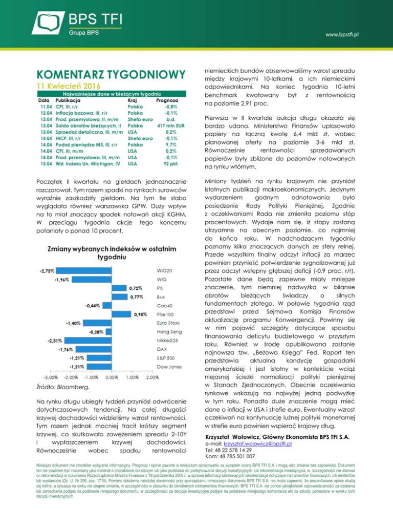 KOMENTARZ TYGODNIOWY 11 Kwiecień 2016 niemieckich bundów obserwowaliśmy wzrost spreadu między krajowymi 10-latkami, a ich niemieckimi odpowiednikami. Na koniec tygodnia 10-letni benchmark kwotowany był z rentownością na poziomie 2,91 proc. Pierwsza w II kwartale aukcja długu okazała się bardzo udana. Ministerstwo Finansów uplasowało papiery na łączną kwotę 6,4 mld zł, wobec planowanej oferty na poziomie 3-6 mld zł. Równocześnie rentowności sprzedawanych papierów były zbliżone do poziomów notowanych na rynku wtórnym. Początek II kwartału na giełdach jednoznacznie rozczarował. Tym razem spadki na rynkach surowców wyraźnie zaszkodziły giełdom. Na tym tle słabo wyglądała również warszawska GPW. Duży wpływ na to miał znaczący spadek notowań akcji KGHM. W przeciągu tygodnia akcje tego koncernu potaniały o ponad 10 procent. Źródło: Bloomberg. Na rynku długu ubiegły tydzień przyniósl odwrócenie dotychczasowych tendencji. Na całej długości krzywej dochodowści widzieliśmy wzrost rentowności. Tym razem jednak mocniej tracił krótszy segment krzywej, co skutkowało zawężeniem spreadu 2-10Y i wypłaszczeniem krzywej dochodowści. Równocześnie wobec spadku rentowności Miniony tydzień na rynku krajowym nie przyniósł istotnych publikacji makroekonomicznych. Jedynym wydarzeniem godnym odnotowania było posiedzenie Rady Polityki Pieniężnej. Zgodnie z oczekiwaniami Rada nie zmieniła poziomu stóp procentowych. Wydaje nam się, iż stopy zostaną utrzyamne na obecnym poziomie, co najmniej do końca roku. W nadchodzącym tygodniu poznamy kilka znaczących danych ze sfery relnej. Przede wszystkim finalny odczyt inflacji za marzec powinien przynieść potwierdzenie sygnalizowanej już przez odczyt wstępny głębszej deflcji (-0,9 proc. r/r). Pozostałe dane będą zapewne miały mniejsze znaczenie, tym niemniej nadwyżka w bilansie obrotów bieżących świadczy o silnych fundamentach złotego. W połowie tygodnia rząd przedstawi przed Sejmowa Komisja Finansów aktualizację programu Konwergencji. Powinny się w nim pojawić szczegóły dotyczące sposobu finansowania deficytu budżetowego w przyszłym roku. Również w środę opublikowana zostanie najnowsza tzw. „Beżowa Księga” Fed. Raport ten przedstawia aktualną kondycję gospodarki amerykańskiej i jest istotny w kontekście wciąż niejasnej ścieżki normalizacji polityki pieniężnej w Stanach Zjednoczonych. Obecnie oczekiwania rynkowe wskazują na najwyżej jedną podwyżkę w tym roku. Ponadto duże znaczenie mogą mieć dane o inflacji w USA i strefie euro. Ewentualny wzrost oczekiwań na kontynuację luźnej polityki monetarnej w strefie euro powinien wspierać krajowy dług. Krzysztof Wołowicz, Główny Ekonomista BPS TFI S.A. e-mail: [email protected] Tel: 48 22 578 14 29 Kom: 48 785 501 007 Niniejszy dokument ma charakter wyłącznie informacyjny. Prognozy i opinie zawarte w niniejszym opracowaniu są wyrazem oceny BPS TFI S.A. i mogą ulec zmianie bez zapowiedzi. Dokument ten nie powinien być rozumiany jako materiał o charakterze doradczym lub jako podstawa do podejmowania decyzji inwestycyjnych lub rekomendacja inwestycyjna, w szczególności nie stanowi on rekomendacji w rozumieniu Rozporządzenia Ministra Finansów z 19 października 2005 r. w sprawie informacji stanowiących rekomendacje dotyczące instrumentów finansowych, ich emitentów lub wystawców (Dz. U. Nr 206, poz. 1715). Pomimo dołożenia należytej staranności przy sporządzaniu niniejszego dokumentu BPS TFI S.A. nie może zapewnić, że prezentowane opinie okażą się trafne, a sytuacja na rynku nie ulegnie zmianie, w szczególności w stosunku do określonych instrumentów finansowych. BPS TFI S.A. nie ponosi jakiejkolwiek odpowiedzialności za działania lub zaniechania podjęte na podstawie niniejszego dokumentu, w szczególności za decyzje inwestycyjne podjęte na podstawie niniejszego komentarza ani za szkody poniesione w wyniku tych decyzji inwestycyjnych.