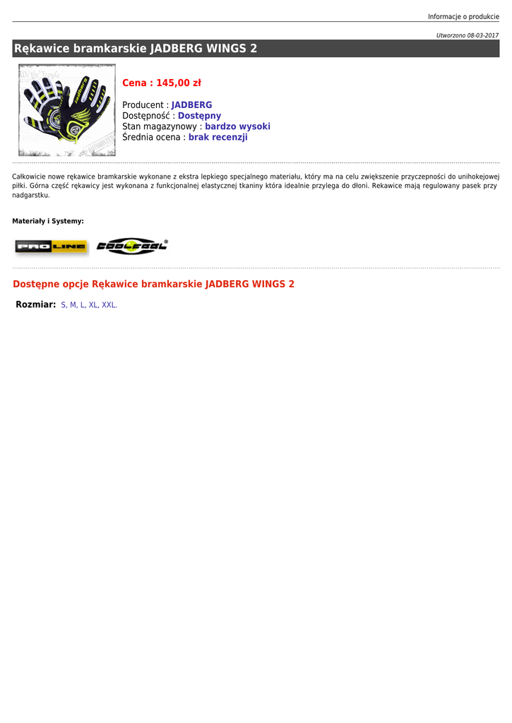 Informacje o produkcie Utworzono 08-03-2017 Rękawice bramkarskie JADBERG WINGS 2 Cena : 145,00 zł Producent : JADBERG Dostępność : Dostępny Stan magazynowy : bardzo wysoki Średnia ocena : brak recenzji Całkowicie nowe rękawice bramkarskie wykonane z ekstra lepkiego specjalnego materiału, który ma na celu zwiększenie przyczepności do unihokejowej piłki. Górna część rękawicy jest wykonana z funkcjonalnej elastycznej tkaniny która idealnie przylega do dłoni. Rekawice mają regulowany pasek przy nadgarstku. Materiały i Systemy: Dostępne opcje Rękawice bramkarskie JADBERG WINGS 2 Rozmiar: S, M, L, XL, XXL.
