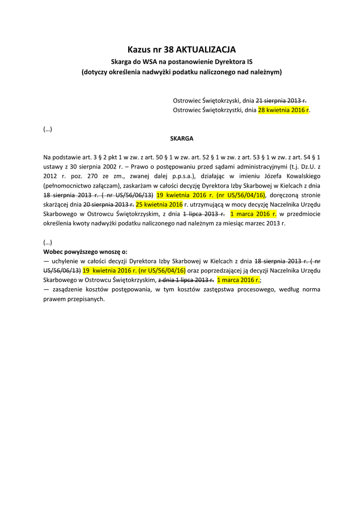 Kazus nr 38 AKTUALIZACJA Skarga do WSA na postanowienie Dyrektora IS (dotyczy określenia nadwyżki podatku naliczonego nad należnym) Ostrowiec Świętokrzyski, dnia 21 sierpnia 2013 r. Ostrowiec Świętokrzystki, dnia 28 kwietnia 2016 r. (…) SKARGA Na podstawie art. 3 § 2 pkt 1 w zw. z art. 50 § 1 w zw. art. 52 § 1 w zw. z art. 53 § 1 w zw. z art. 54 § 1 ustawy z 30 sierpnia 2002 r. – Prawo o postępowaniu przed sądami administracyjnymi (t.j. Dz.U. z 2012 r. poz. 270 ze zm., zwanej dalej p.p.s.a.), działając w imieniu Józefa Kowalskiego (pełnomocnictwo załączam), zaskarżam w całości decyzję Dyrektora Izby Skarbowej w Kielcach z dnia 18 sierpnia 2013 r. ( nr US/56/06/13) 19 kwietnia 2016 r. (nr US/56/04/16), doręczoną stronie skarżącej dnia 20 sierpnia 2013 r. 25 kwietnia 2016 r. utrzymującą w mocy decyzję Naczelnika Urzędu Skarbowego w Ostrowcu Świętokrzyskim, z dnia 1 lipca 2013 r. 1 marca 2016 r. w przedmiocie określenia kwoty nadwyżki podatku naliczonego nad należnym za miesiąc marzec 2013 r. (…) Wobec powyższego wnoszę o: — uchylenie w całości decyzji Dyrektora Izby Skarbowej w Kielcach z dnia 18 sierpnia 2013 r. ( nr US/56/06/13) 19 kwietnia 2016 r. (nr US/56/04/16) oraz poprzedzającej ją decyzji Naczelnika Urzędu Skarbowego w Ostrowcu Świętokrzyskim, z dnia 1 lipca 2013 r. 1 marca 2016 r.; — zasądzenie kosztów postępowania, w tym kosztów zastępstwa procesowego, według norma prawem przepisanych.