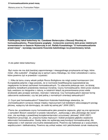 O homoseksualizmie przed mszą Wpisany przez ks. Przemysław Pabjan Publikujemy tekst katechezy ks. Czesława Stolarczyka z Diecezji Płockiej nt. homoseksualizmu. Prezentowane poglądy - krytycznie ocenione dziś przez niektórych komentatorów w Gazecie Wyborczej w art. Rafała Kowalskiego "O homoseksualizmie przed mszą" - wyrażają nauczanie Koscioła katolickiego na prezentowany temat. A oto pełen tekst ketechezy: Być może nie ma dziś bardziej zapomnianego i niewygodnego przykazania od tego, które mówi: „Nie cudzołóż”. Znajduje się w samym sercu Dekalogu, bo mówi człowiekowi o sercu, które powinno żyć w prawdzie i czystości. 1. Kilka lat temu znany włoski polityk Rocco Buttiglione nie mógł zostać komisarzem Unii Europejskiej jedynie z tego powodu, że w rozmowie kwalifikacyjnej wypowiedział się negatywnie na temat zachowań homoseksualnych. To zdarzenie pokazuje nam, że dzisiaj jesteśmy świadkami prawdziwej rewolucji moralnej. Czyny homoseksualne, które przez stulecia były uważane za niezgodne z naturą, w ostatnich latach są prezentowane przez wiele środowisk jako przejaw wolności, równości i tolerancji. Czy homoseksualizm stanowi formę zaburzenia osobowości, czy też jest jedną z normalnych orientacji seksualnych? 2. Czym jest homoseksualizm? Katechizm Kościoła Katolickiego stwierdza, że „homoseksualizm oznacza relacje między mężczyznami lub kobietami odczuwającymi pociąg płciowy, wyłączny lub dominujący, do osób tej samej płci” (KKK 2357). Pismo św. przedstawia czyny homoseksualne jako poważne zepsucie, gdyż są one sprzeczne z zamysłem Bożym zawartym w prawie naturalnym, „wykluczają z aktu płciowego dar życia” oraz „nie wynikają z prawdziwej komplementarności uczuciowej i płciowej” (KKK 2357). Katechizm przyznaje, że „znaczna liczba mężczyzn i kobiet przejawia głęboko osadzone skłonności homoseksualne. Osoby takie nie wybierają swej kondycji homoseksualnej; dla większości z nich stanowi ona trudne doświadczenie. Powinno się traktować je z szacunkiem, współczuciem i delikatnością. Powinno się unikać wobec nich jakichkolwiek oznak niesłusznej 1/2 O homoseksualizmie przed mszą Wpisany przez ks. Przemysław Pabjan dyskryminacji”. Sama skłonność homoseksualna bez czynów nie jest grzechem, lecz trudnym doświadczeniem, które przez terapię należy przezwyciężyć i żyć w czystości, do której jest wezwany każdy chrześcijanin (por. KKK 2358). 3. Czyny homoseksualne są z natury grzechem ciężkim i należy je potępić. W Księdze Rodzaju czytamy: „skarga na Sodomę i Gomorę głośno się rozlega, bo występki ich mieszkańców są bardzo ciężkie” (Rdz 18, 20). Z tych występków dowiadujemy się właściwie tylko o jednym, właśnie o homoseksualizmie. Gdy Lot gości dwóch obcych, pod jego dom podchodzą mieszkańcy Sodomy i mówią do niego: „Wyprowadź ich do nas, abyśmy mogli z nimi poswawolić!” (Rdz 19, 5). Na jego błagania odpowiadają groźbami i przemocą. Na drugi dzień Sodoma i Gomora zostają unicestwione, ocalony zostaje tylko sprawiedliwy - Lot i jego rodzina. Stary Testament określa homoseksualizm jako obrzydliwość i za jego praktykowanie przewiduje karę śmierci (por. Kpł 20,13). Taka sama jest ocena aktów homoseksualnych w Nowym Testamencie: św. Paweł w Liście do Koryntian napisał: „Nie łudźcie się! Ani rozpustnicy, ani bałwochwalcy, ani cudzołożnicy, ani rozwięźli, ani mężczyźni współżyjący z sobą (…) nie odziedziczą królestwa Bożego” (1 Kor 6,9). Homoseksualiści nie są dziś prześladowani; mają swoje kluby, organizacje, pisma, tworzą lobby o silnym wpływie na politykę i kulturę. Zagrożone są natomiast rodziny, małżeństwa, dzieci i młodzież. Po ogłoszeniu rezolucji Parlamentu Europejskiego na temat homoseksualizmu sługa Boży Jan Paweł II przypomniał niezmienne stanowisko Kościoła w tej sprawie. „Moralnie niedopuszczalne jest nadawanie sankcji prawnej praktyce homoseksualnej. Rezolucja Parlamentu Europejskiego – powiedział Ojciec Święty – domaga się prawnego uznania nieładu moralnego. Parlament w sposób nieuprawniony nadał walor prawny zachowaniom dewiacyjnym, niezgodnym z zamysłem Bożym”. Czy odczuwasz niepokój słysząc o coraz większych prawach dla zboczenia, które jest zagrożeniem dla rodziny, zawierania nowych małżeństw i wychowania dzieci? Czy dbasz o cnotę czystości w swojej rodzinie, środowisku pracy i rekreacji? 4. Zapamiętajmy: Kościół z troską pochyla się, by doprowadzić do zbawienia tych, którzy błądzą w grzechu homoseksualizmu. Ludziom, którzy mają skłonności homoseksualne, Kościół ze współczuciem i delikatnością pragnie pomóc w terapii. Czynny homoseksualizm jest natomiast obcy Ewangelii, jest nie do pogodzenia z chrześcijaństwem, jest postawą, obrażającą Boga Stwórcę i niszczy samego człowieka. 2/2