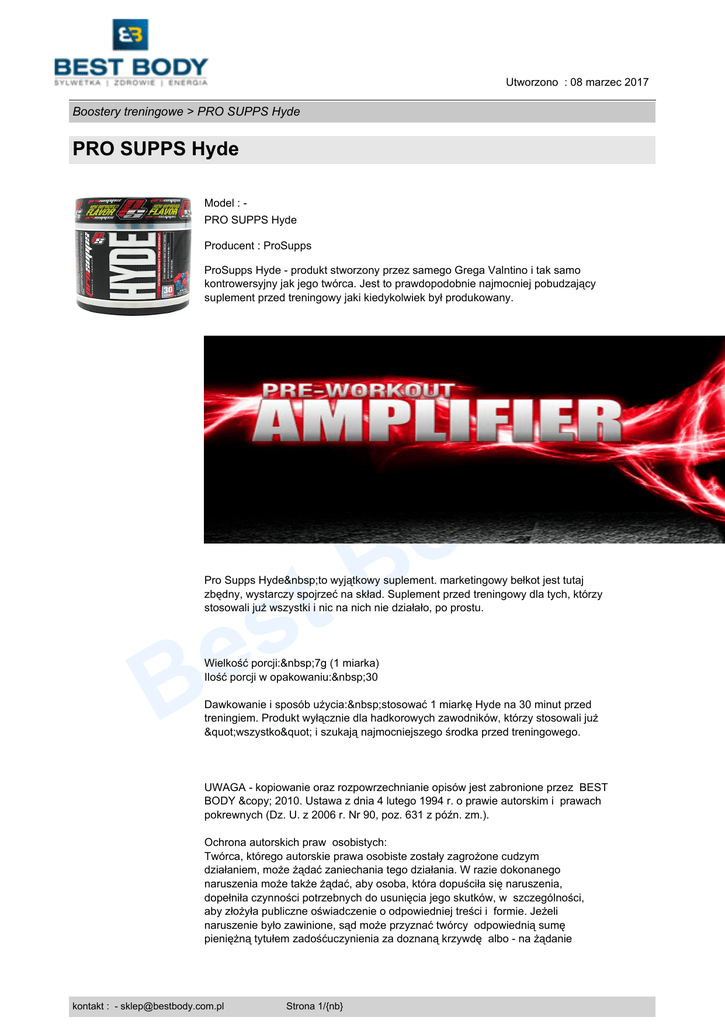 Utworzono : 08 marzec 2017 Boostery treningowe > PRO SUPPS Hyde PRO SUPPS Hyde Model : PRO SUPPS Hyde Producent : ProSupps ProSupps Hyde - produkt stworzony przez samego Grega Valntino i tak samo kontrowersyjny jak jego twórca. Jest to prawdopodobnie najmocniej pobudzający suplement przed treningowy jaki kiedykolwiek był produkowany. t s e B y d o B Pro Supps Hyde to wyjątkowy suplement. marketingowy bełkot jest tutaj zbędny, wystarczy spojrzeć na skład. Suplement przed treningowy dla tych, którzy stosowali już wszystki i nic na nich nie działało, po prostu. Wielkość porcji: 7g (1 miarka) Ilość porcji w opakowaniu: 30 Dawkowanie i sposób użycia: stosować 1 miarkę Hyde na 30 minut przed treningiem. Produkt wyłącznie dla hadkorowych zawodników, którzy stosowali już "wszystko" i szukają najmocniejszego środka przed treningowego. UWAGA - kopiowanie oraz rozpowrzechnianie opisów jest zabronione przez BEST BODY © 2010. Ustawa z dnia 4 lutego 1994 r. o prawie autorskim i prawach pokrewnych (Dz. U. z 2006 r. Nr 90, poz. 631 z późn. zm.). Ochrona autorskich praw osobistych: Twórca, którego autorskie prawa osobiste zostały zagrożone cudzym działaniem, może żądać zaniechania tego działania. W razie dokonanego naruszenia może także żądać, aby osoba, która dopuściła się naruszenia, dopełniła czynności potrzebnych do usunięcia jego skutków, w szczególności, aby złożyła publiczne oświadczenie o odpowiedniej treści i formie. Jeżeli naruszenie było zawinione, sąd może przyznać twórcy odpowiednią sumę pieniężną tytułem zadośćuczynienia za doznaną krzywdę albo - na żądanie kontakt : - [email protected] Strona 1/{nb} Utworzono : 08 marzec 2017 Boostery treningowe > PRO SUPPS Hyde PRO SUPPS Hyde twórcy - zobowiązać sprawcę, aby uiścił odpowiednią sumę pieniężną na wskazany przez twórcę cel społeczny. Cena : 199,00 zł Brutto ( 185,98 zł Netto) Dostępność: Produkt dostępny w naszym sklepie od 07 lipiec 2013 t s e B kontakt : - [email protected] Strona 2/{nb} o B y d