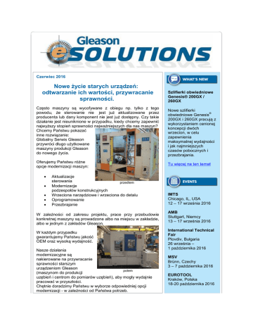 Czerwiec 2016 Nowe życie starych urządzeń: odtwarzanie ich wartości, przywracanie sprawności. Często maszyny są wycofywane z obiegu np. tylko z tego powodu, że sterowanie nie jest już aktualizowane przez producenta lub dany komponent nie jest już dostępny. Czy takie działanie jest nieuniknione w przypadku, kiedy chcemy zapewnić najwyższy stopień sprawności najważniejszych dla nas maszyn? Chcemy Państwu pokazać inne rozwiązanie: Globalny Serwis Gleason przywróci długo użytkowane maszyny produkcji Gleason do nowego życia. Oferujemy Państwu różne opcje modernizacji maszyn: Aktualizacje sterowania przedtem Modernizacje podzespołów konstrukcyjnych Wrzeciona narzędziowe i wrzeciona do detalu Oprogramowanie Przezbrajanie Szlifierki obwiedniowe Genesis® 200GX / 260GX Nowe szlifierki ® obwiedniowe Genesis 200GX i 260GX pracują z wykorzystaniem cenionej koncepcji dwóch wrzecion, w celu zapewnienia maksymalnej wydajności i jak najmniejszych czasów pobocznych i przezbrajania. Tu więcej na ten temat IMTS Chicago, IL, USA 12 – 17 września 2016 W zależności od zakresu projektu, prace przy przebudowie konkretnej maszyny są prowadzone albo na miejscu w zakładzie, albo w jednym z zakładów Gleason. AMB Stuttgart, Niemcy 13 – 17 września 2016 W każdym przypadku gwarantujemy Państwu jakość OEM oraz wysoką wydajność. International Technical Fair Plovdiv, Bułgaria 26 września – 1 października 2016 Nasze działania modernizacyjne są nakierowane na przywracanie sprawności starszym urządzeniom Gleason potem (maszynom do produkcji uzębień i centrom do pomiarów uzębień), aby mogły wydajnie pracować w przyszłości. Chętnie doradzimy Państwu w wyborze odpowiedniej opcji modernizacji - w zależności od Państwa potrzeb. MSV Brünn, Czechy 3 – 7 października 2016 EUROTOOL Kraków, Polska 18-20 października 2016 Prosimy o kontakt w tej sprawie z naszym przedstawicielem handlowym – firmą EUROTEC. JIMTOF Tokio, Japonia 17 – 22 listopada 2016 Najnowsze seminarium internetowe: Koncepcje przyrządów mocujących do detali dla dużych kół zębatych Gleason jest obecny na następujących portalach internetowych: Tim Zenoski, osoba odpowiedzialna w Gleason za rozwój produktów w zakresie przyrządów mocujących, w najnowszej prezentacji internetowej ukazuje koncepcję przyrządów mocujących dla uzębień o dużych średnicach. Przedstawia w niej mocowania z systemami szybkiej wymiany detali, jak również mocowania mechaniczne i hydrauliczne i pokazuje, w jaki sposób te rozwiązania mogą być wykorzystywane w konkretnym obszarze zastosowania. Link do prezentacji Titan® 2000H – frezarka obwiedniowa do dużych kół zębatych Frezarka Titan®2000H wyznacza standardy frezowania dużych kół zębatych pod względem wydajności, łatwości obsługi i mocy. Jest przeznaczona do obróbki wałów i kół zębatych, jak również uzębień wewnętrznych. Za pomocą frezarki 2000H można obrabiać prawie wszystkie profile cylindryczne i prawie wszystkie kształty zębów, stosując metodę frezowania obwiedniowego lub metodę podziałową. Tu więcej na ten temat Wyłączny przedstawiciel Gleason w Polsce EUROPEAN TECHNOLOGY Sp. z o.o., Sp. k. ul. Libijska 10 03 – 977 Warszawa http://www.eurotec.pl Osoby kontaktowe: Obrabiarki, maszyny pomiarowe: Szymon Ratajczak [email protected] Serwis, części zamienne: Beata Czarnecka [email protected] Narzędzia, systemy mocowań: Iwona Brzostek [email protected] Tel. (22) 617 46 41 Fax (22) 616 31 09 [email protected] | Gleason Corporation, 1000 University Ave, Rochester, NY 14692 Copyright © 2016. All Rights Reserved.