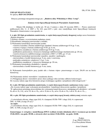 Ełk, 07.06. 2010r. URZĄD MIASTA EŁKU Nr sprawy BZP-341/29/2010 Dotyczy przetargu nieograniczonego pn.: „Budowa ulicy Wileńskiej w Ełku- I etap”. Zmiana treści Specyfikacji Istotnych Warunków Zamówienia Miasto Ełk działając w trybie art. 38 ust. 4 ustawy z dnia 29 stycznia 2004 r. – Prawo zamówień publicznych (Dz. U. Z 2007 r. Nr 223, poz.1655 z póź. zm.) modyfikuje treść Specyfikacji Istotnych Warunków Zamówienia w ten sposób, że I. w pkt. III Opis przedmiotu zamówienia, w części dotyczącej branży drogowej nadaje nowe brzmienie: „Branża drogowa: 1) Roboty ziemne z wywiezieniem nadmiaru ziemi, 2) Rozebranie istniejącej nawierzchni z trelinki, 3) Wykonanie konstrukcji nawierzchni jezdni; - warstwa ścieralna z betonu asfaltowego standard i betonu asfaltowego 0/16 gr. 5 cm, - warstwa wiążąca z betonu asfaltowego 0/20, gr. 6 cm, - podbudowa zasadnicza z betonu asfaltowego 0/25 gr. 8 cm, - podbudowa pomocnicza z kruszywa łamanego stabilizowanego mechanicznie gr. 20 cm, - warstwa kruszywa stabilizowanego cementem o RM=1,5 MPa, gr. 15 cm 4) Wykonanie konstrukcji nawierzchni wjazdów, zjazdów i parkingów, - nawierzchnia z kostki betonowej gr. 8 cm, szary i czerwony, - podsypka cementowo- piaskowa 1:4 gr. 3 cm, - podbudowa zasadnicza z kruszywa łamanego gr. 20 cm, 5) Wykonanie konstrukcja chodników i opasek; - nawierzchnia z kostki betonowej gr. 6 cm, szara, 8) Wykonanie krawężników przy jezdni ulic z betonu wipro- prasowanego o wym. 20x30 cm na ławie betonowej. 10) Wykonanie zieleni- trawników i zasadzenie drzew, 11) Pielęgnacja drzew i trawników przez okres jednego roku (od daty odbioru końcowego). Do wyceny należy ująć dwa betonowe progi zwalniające zgodnie z projektem robót drogowych.” II. w pkt. III Opis przedmiotu zamówienia, w części dotyczącej branży sanitarnej dodaje zapis: „Do wyceny należy ująć wykonanie przykanalików kanalizacji deszczowej zgodnie z projektem. W ogłoszonym przetargu przewidziano do wykonania kanał deszczowy następujących odcinków:: od studni D47 do st. D12 i K2, od st. D1 do st. D24, od st. D3 do st. Di2, od st. D5 do st. D23 i od st. D11 do st. D15 „ III. w pkt. III Opis przedmiotu zamówienia, w części dotyczącej branży elektrycznej zmienia zapis: „1) oświetlenie uliczne, słupy typu SAL-8 z lampami OUSb-70W i słupy SAL-6 z oprawami OPC- S-70W, (I-etap 29 szt.)” na zapis: „1) oświetlenie uliczne, słupy typu SAL-8 z lampami OUSb-70W i słupy SAL-6 z oprawami OPC- S-70W, (I-etap 26 szt.)” Zamawiający w związku z modyfikacją SIWZ wydłuża termin składania ofert i wyznacza go na dzień 15.06.2010 r. na godz. 09:00, a otwarcie ofert na dzień 15.06.2010r. na godz. 10:00. Podpis Z up. PREZYDENTA Z-ca Prezydenta Miasta Artur Urbański