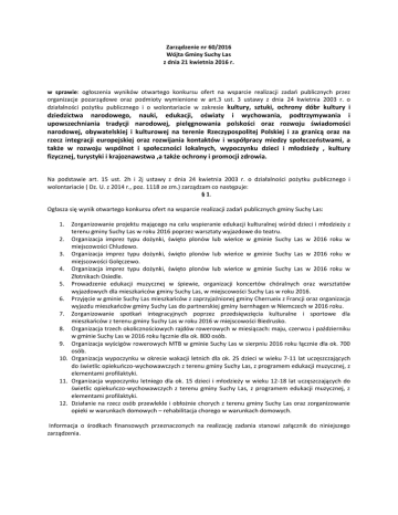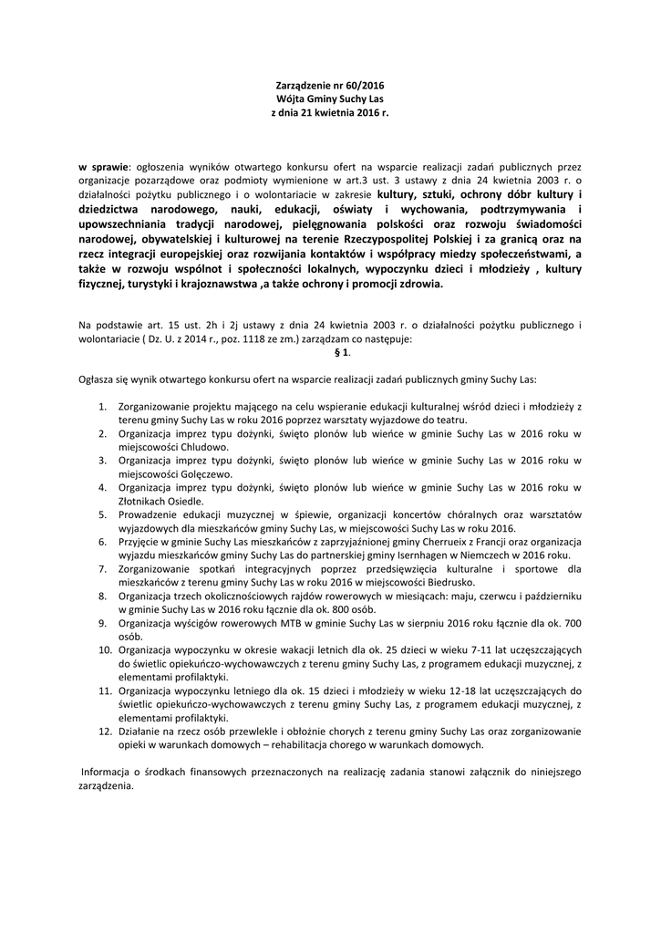 Zarządzenie nr 60/2016 Wójta Gminy Suchy Las z dnia 21 kwietnia 2016 r. w sprawie: ogłoszenia wyników otwartego konkursu ofert na wsparcie realizacji zadań publicznych przez organizacje pozarządowe oraz podmioty wymienione w art.3 ust. 3 ustawy z dnia 24 kwietnia 2003 r. o działalności pożytku publicznego i o wolontariacie w zakresie kultury, sztuki, ochrony dóbr kultury i dziedzictwa narodowego, nauki, edukacji, oświaty i wychowania, podtrzymywania i upowszechniania tradycji narodowej, pielęgnowania polskości oraz rozwoju świadomości narodowej, obywatelskiej i kulturowej na terenie Rzeczypospolitej Polskiej i za granicą oraz na rzecz integracji europejskiej oraz rozwijania kontaktów i współpracy miedzy społeczeństwami, a także w rozwoju wspólnot i społeczności lokalnych, wypoczynku dzieci i młodzieży , kultury fizycznej, turystyki i krajoznawstwa ,a także ochrony i promocji zdrowia. Na podstawie art. 15 ust. 2h i 2j ustawy z dnia 24 kwietnia 2003 r. o działalności pożytku publicznego i wolontariacie ( Dz. U. z 2014 r., poz. 1118 ze zm.) zarządzam co następuje: § 1. Ogłasza się wynik otwartego konkursu ofert na wsparcie realizacji zadań publicznych gminy Suchy Las: 1. Zorganizowanie projektu mającego na celu wspieranie edukacji kulturalnej wśród dzieci i młodzieży z terenu gminy Suchy Las w roku 2016 poprzez warsztaty wyjazdowe do teatru. 2. Organizacja imprez typu dożynki, święto plonów lub wieńce w gminie Suchy Las w 2016 roku w miejscowości Chludowo. 3. Organizacja imprez typu dożynki, święto plonów lub wieńce w gminie Suchy Las w 2016 roku w miejscowości Golęczewo. 4. Organizacja imprez typu dożynki, święto plonów lub wieńce w gminie Suchy Las w 2016 roku w Złotnikach Osiedle. 5. Prowadzenie edukacji muzycznej w śpiewie, organizacji koncertów chóralnych oraz warsztatów wyjazdowych dla mieszkańców gminy Suchy Las, w miejscowości Suchy Las w roku 2016. 6. Przyjęcie w gminie Suchy Las mieszkańców z zaprzyjaźnionej gminy Cherrueix z Francji oraz organizacja wyjazdu mieszkańców gminy Suchy Las do partnerskiej gminy Isernhagen w Niemczech w 2016 roku. 7. Zorganizowanie spotkań integracyjnych poprzez przedsięwzięcia kulturalne i sportowe dla mieszkańców z terenu gminy Suchy Las w roku 2016 w miejscowości Biedrusko. 8. Organizacja trzech okolicznościowych rajdów rowerowych w miesiącach: maju, czerwcu i październiku w gminie Suchy Las w 2016 roku łącznie dla ok. 800 osób. 9. Organizacja wyścigów rowerowych MTB w gminie Suchy Las w sierpniu 2016 roku łącznie dla ok. 700 osób. 10. Organizacja wypoczynku w okresie wakacji letnich dla ok. 25 dzieci w wieku 7-11 lat uczęszczających do świetlic opiekuńczo-wychowawczych z terenu gminy Suchy Las, z programem edukacji muzycznej, z elementami profilaktyki. 11. Organizacja wypoczynku letniego dla ok. 15 dzieci i młodzieży w wieku 12-18 lat uczęszczających do świetlic opiekuńczo-wychowawczych z terenu gminy Suchy Las, z programem edukacji muzycznej, z elementami profilaktyki. 12. Działanie na rzecz osób przewlekle i obłożnie chorych z terenu gminy Suchy Las oraz zorganizowanie opieki w warunkach domowych – rehabilitacja chorego w warunkach domowych. Informacja o środkach finansowych przeznaczonych na realizację zadania stanowi załącznik do niniejszego zarządzenia. § 2. Wykonanie zarządzenia powierza się pracownikowi zatrudnionemu na stanowisku ds. społecznych w Wydziale Organizacyjno-Gospodarczym Urzędu Gminy w Suchym Lesie. § 3. Zarządzenie wchodzi w życie z dniem podpisania.