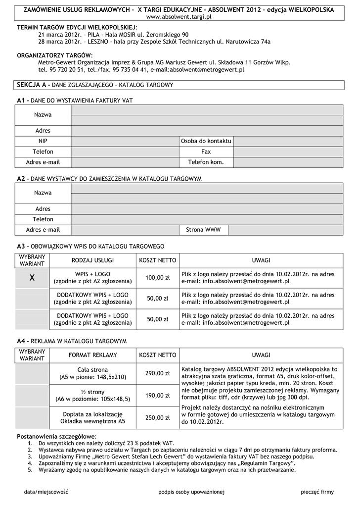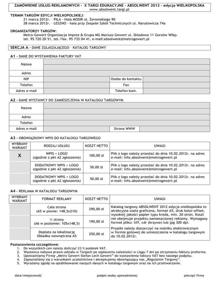 ZAMÓWIENIE USŁUG REKLAMOWYCH - X TARGI EDUKACYJNE - ABSOLWENT 2012 – edycja WIELKOPOLSKA www.absolwent.targi.pl TERMIN TARGÓW EDYCJI WIELKOPOLSKIEJ: 21 marca 2012r. – PIŁA - Hala MOSIR ul. śeromskiego 90 28 marca 2012r. – LESZNO - hala przy Zespole Szkół Technicznych ul. Narutowicza 74a ORGANIZATORZY TARGÓW: Metro-Gewert Organizacja Imprez & Grupa MG Mariusz Gewert ul. Składowa 11 Gorzów Wlkp. tel. 95 720 20 51, tel./fax. 95 735 04 41, e-mail:[email protected] SEKCJA A – DANE ZGŁASZAJĄCEGO – KATALOG TARGOWY A1 - DANE DO WYSTAWIENIA FAKTURY VAT Nazwa Adres NIP Osoba do kontaktu Telefon Fax Adres e-mail Telefon kom. A2 - DANE WYSTAWCY DO ZAMIESZCZENIA W KATALOGU TARGOWYM Nazwa Adres Telefon Adres e-mail Strona WWW A3 – OBOWIĄZKOWY WPIS DO KATALOGU TARGOWEGO WYBRANY WARIANT RODZAJ USŁUGI KOSZT NETTO X WPIS + LOGO (zgodnie z pkt A2 zgłoszenia) 100,00 zł Plik z logo naleŜy przesłać do dnia 10.02.2012r. na adres e-mail: [email protected] DODATKOWY WPIS + LOGO (zgodnie z pkt A2 zgłoszenia) 50,00 zł Plik z logo naleŜy przesłać do dnia 10.02.2012r. na adres e-mail: [email protected] DODATKOWY WPIS + LOGO (zgodnie z pkt A2 zgłoszenia) 50,00 zł Plik z logo naleŜy przesłać do dnia 10.02.2012r. na adres e-mail: [email protected] UWAGI A4 – REKLAMA W KATALOGU TARGOWYM WYBRANY WARIANT FORMAT REKLAMY KOSZT NETTO Cała strona (A5 w pionie: 148,5x210) 290,00 zł ½ strony (A6 w poziomie: 105x148,5) 190,00 zł Dopłata za lokalizację Okładka wewnętrzna A5 250,00 zł UWAGI Katalog targowy ABSOLWENT 2012 edycja wielkopolska to atrakcyjna szata graficzna, format A5, druk kolor-offset, wysokiej jakości papier typu kreda, min. 20 stron. Koszt nie obejmuje projektu zamieszczonej reklamy. Wymagany format pliku: tiff, cdr (krzywe) lub jpg 300 dpi. Projekt naleŜy dostarczyć na nośniku elektronicznym w formie gotowej do umieszczenia w katalogu targowym do 10.02.2012r. Postanowienia szczegółowe: 1. Do wszystkich cen naleŜy doliczyć 23 % podatek VAT. 2. Wystawca nabywa prawo udziału w Targach po zapłaceniu naleŜności w ciągu 7 dni po otrzymaniu faktury proforma. 3. UpowaŜniamy Firmę „Metro Gewert Stefan Lech Gewert” do wystawienia faktury VAT bez naszego podpisu. 4. Zapoznaliśmy się z warunkami uczestnictwa i akceptujemy obowiązujący nas „Regulamin Targowy”. 5. WyraŜamy zgodę na opublikowanie naszych danych w katalogu targowym oraz na ich przetwarzanie. data/miejscowość podpis osoby upowaŜnionej pieczęć firmy ZAMÓWIENIE USŁUG REKLAMOWYCH - X TARGI EDUKACYJNE - ABSOLWENT 2012 – edycja WIELKOPOLSKA www.absolwent.targi.pl SEKCJA B – USŁUGI REKLAMOWE – PIŁA – 21 marca 2012r. PIŁA – B1 – USŁUGI REKLAMOWE WYBRANY WARIANT RODZAJ USŁUGI KolportaŜ materiałów reklamowych 180 zł KolportaŜ poprzez punkt informacyjny oraz za pośrednictwem hostess organizatora i punkt info Hostessa ………… os. x 220 zł 220 zł Zadania: wyłączny kolportaŜ materiałów reklamowych, obsługa stoiska, inne – wg uzgodnień Ustawienie urządzenia reklamowego PIŁA – UWAGI KOSZT NETTO Koszt ustawienia urządzenia reklamowego: stend, roll-up, itp. wg indywidualnych uzgodnień – ceny od 90 zł B2 – EMISJA REKLAMY RADIOWEJ W HALI TARGOWEJ WYBRANY WARIANT LICZBA EMISJI ŁĄCZNIE KOSZT NETTO UWAGI 10 emisji spotu reklamowego w radio 120 zł Gotowy spot reklamowy w formacie dźwiękowym (max 30 sekund) lub tekst maszynopisu (max 60 słów) naleŜy przesłać na nośniku elektronicznym do dnia 01.03.2012r. 20 emisji spotu reklamowego w radio 190 zł W razie dodatkowych pytań prosimy o kontakt tel. 696 008 886 Dodatkowe emisje spotu ………… emisji x 5,0 zł KaŜda następna dodatkowa emisja – 5 zł netto. SEKCJA C – USŁUGI REKLAMOWE – LESZNO – 28 marca 2012r. LESZNO – C1 – USŁUGI REKLAMOWE WYBRANY WARIANT RODZAJ USŁUGI KOSZT NETTO UWAGI KolportaŜ materiałów reklamowych 180 zł KolportaŜ poprzez punkt informacyjny oraz za pośrednictwem hostess organizatora i punkt info Hostessa ………… os. x 220 zł 220 zł Zadania: wyłączny kolportaŜ materiałów reklamowych, obsługa stoiska, inne – wg uzgodnień Ustawienie urządzenia reklamowego Koszt ustawienia urządzenia reklamowego: stend, roll-up, itp. wg indywidualnych uzgodnień – ceny od 90 zł LESZNO – C2 – EMISJA REKLAMY RADIOWEJ W HALI TARGOWEJ WYBRANY WARIANT LICZBA EMISJI ŁĄCZNIE KOSZT NETTO UWAGI 10 emisji spotu reklamowego w radio 120 zł Gotowy spot reklamowy w formacie dźwiękowym (max 30 sekund) lub tekst maszynopisu (max 60 słów) naleŜy przesłać na nośniku elektronicznym do dnia 01.03.2012r. 20 emisji spotu reklamowego w radio 190 zł W razie dodatkowych pytań prosimy o kontakt tel. 696 008 886 Dodatkowe emisje spotu ………… emisji x 5,0 zł data/miejscowość KaŜda następna dodatkowa emisja – 5 zł netto. podpis osoby upowaŜnionej pieczęć firmy