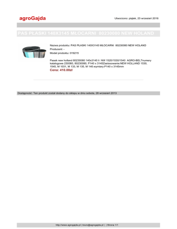 agroGajda Utworzono: piątek, 23 wrzesień 2016 PAS PŁASKI 140X3145 MŁOCARNI 80230080 NEW HOLAND Nazwa produktu: PAS PŁASKI 140X3145 MŁOCARNI 80230080 NEW HOLAND Producent: Model produktu: 019215 Pasek new holland 80230080 140x3145 li NW 1520/1530/1540 AGRO-BELTnumery katalogowe 230080, 80230080, P140 x 3145Zastosowanie:NEW HOLLAND 1530, 1545, M 1031, M 133, M 135, M 140.wymiary:P140 x 3145mm Cena: 410.00zł Dostępność: Ten produkt został dodany do sklepu w dniu sobota, 28 wrzesień 2013 http://www.agrogajda.pl | [email protected] | | Strona 1/1