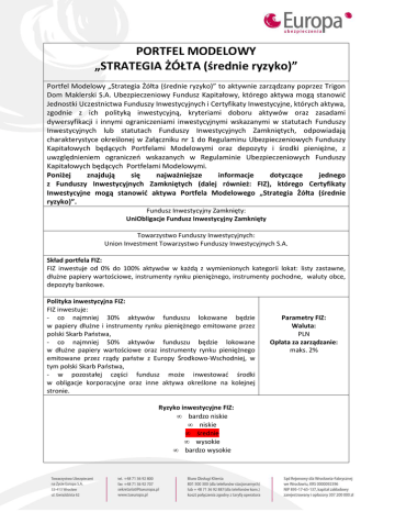 PORTFEL MODELOWY „STRATEGIA ŻÓŁTA (średnie ryzyko)” Portfel Modelowy „Strategia Żółta (średnie ryzyko)” to aktywnie zarządzany poprzez Trigon Dom Maklerski S.A. Ubezpieczeniowy Fundusz Kapitałowy, którego aktywa mogą stanowić Jednostki Uczestnictwa Funduszy Inwestycyjnych i Certyfikaty Inwestycyjne, których aktywa, zgodnie z ich polityką inwestycyjną, kryteriami doboru aktywów oraz zasadami dywersyfikacji i innymi ograniczeniami inwestycyjnymi wskazanymi w statutach Funduszy Inwestycyjnych lub statutach Funduszy Inwestycyjnych Zamkniętych, odpowiadają charakterystyce określonej w Załączniku nr 1 do Regulaminu Ubezpieczeniowych Funduszy Kapitałowych będących Portfelami Modelowymi oraz depozyty i środki pieniężne, z uwzględnieniem ograniczeń wskazanych w Regulaminie Ubezpieczeniowych Funduszy Kapitałowych będących Portfelami Modelowymi. Poniżej znajdują się najważniejsze informacje dotyczące jednego z Funduszy Inwestycyjnych Zamkniętych (dalej również: FIZ), którego Certyfikaty Inwestycyjne mogą stanowić aktywa Portfela Modelowego „Strategia Żółta (średnie ryzyko)”. Fundusz Inwestycyjny Zamknięty: UniObligacje Fundusz Inwestycyjny Zamknięty Towarzystwo Funduszy Inwestycyjnych: Union Investment Towarzystwo Funduszy Inwestycyjnych S.A. Skład portfela FIZ: FIZ inwestuje od 0% do 100% aktywów w każdą z wymienionych kategorii lokat: listy zastawne, dłużne papiery wartościowe, instrumenty rynku pieniężnego, instrumenty pochodne, waluty obce, depozyty bankowe. Polityka inwestycyjna FIZ: FIZ inwestuje: - co najmniej 30% aktywów funduszu lokowane będzie w papiery dłużne i instrumenty rynku pieniężnego emitowane przez polski Skarb Państwa, - co najmniej 50% aktywów funduszu będzie lokowane w dłużne papiery wartościowe oraz instrumenty rynku pieniężnego emitowane przez rządy państw z Europy Środkowo-Wschodniej, w tym polski Skarb Państwa, - w pozostałej części fundusz może inwestować środki w obligacje korporacyjne oraz inne aktywa określone na kolejnej stronie. Ryzyko inwestycyjne FIZ: • bardzo niskie • niskie • średnie • wysokie • bardzo wysokie Parametry FIZ: Waluta: PLN Opłata za zarządzanie: maks. 2% Dane Union Investment TFI: Union Investment Towarzystwo Funduszy Inwestycyjnych S.A. ul. Polna 11 00-633 Warszawa Cel FIZ: Celem inwestycyjnym FIZ jest długoterminowy wzrost wartości aktywów FIZ w wyniku wzrostu wartości lokat. FIZ nie gwarantuje osiągnięcia celu inwestycyjnego. FIZ może lokować swoje aktywa w następujące kategorie lokat: - listy zastawne, dłużne papiery wartościowe oraz instrumenty rynku pieniężnego (są to papiery wartościowe i instrumenty rynku pieniężnego emitowane przez podmioty z siedzibą na terytorium Rzeczypospolitej Polskiej, w państwach członkowskich Unii Europejskiej i w państwach należących do OECD innych niż Rzeczpospolita Polska i państwo członkowskie Unii Europejskiej oraz w następujących państwach nienależących do OECD: Serbia i Chorwacja), - instrumenty pochodne, w tym niewystandaryzowane instrumenty pochodne (kontrakty terminowe lub opcje gdzie instrumentem bazowym może być indeks giełdowy, papiery wartościowe, instrumenty rynku pieniężnego, kursy walut oraz stopa procentowa; transakcje wymiany walut, papierów wartościowych, instrumentów rynku pieniężnego i indeksów giełdowych) – pod warunkiem że są zbywalne, - waluty obce, - depozyty bankowe (depozyty w bankach krajowych, instytucjach kredytowych, a także w bankach zagranicznych, o terminie zapadalności nie dłuższym niż rok płatne na każde żądanie lub które można wycofać przed terminem zapadalności. Alokacja środków FIZ w poszczególne kategorie lokat: FIZ może inwestować środki w każdą ze wskazanych powyżej kategorii lokat z zastrzeżeniem ograniczeń wynikających ze Statutu FIZ oraz Ustawy o funduszach inwestycyjnych z dnia 27 maja 2014 r. (Dz. U. z 2004 r. Nr 146, poz. 1546 ze zm.): - papiery wartościowe lub instrumenty rynku pieniężnego wyemitowane przez jeden podmiot, a także udziały w tym podmiocie i wierzytelności wobec tego podmiotu oraz wartość ryzyka kontrahenta wynikająca z transakcji, których przedmiotem są niewystandaryzowane instrumenty pochodne, zawartych z tym podmiotem, nie mogą stanowić łącznie więcej niż 20% wartości aktywów FIZ (powyższego ograniczenia nie stosuje się do papierów wartościowych emitowanych, gwarantowanych lub poręczanych przez: Skarb Państwa, Narodowy Bank Polski, państwo należące do OECD albo międzynarodową instytucję finansową, której członkiem jest Rzeczpospolita Polska lub co najmniej jedno z państw należących do OECD), natomiast listy zastawne wyemitowane przez jeden bank hipoteczny nie mogą stanowić więcej niż 25% wartości aktywów FIZ, przy czym łączna wartość lokat w listy zastawne nie może przekraczać 50% wartości aktywów FIZ, - waluty obce nie mogą stanowić więcej niż 20% wartości aktywów FIZ w odniesieniu do waluty obcej jednego państwa lub euro, - depozyty w jednym banku krajowym, banku zagranicznym lub instytucji kredytowej nie mogą stanowić więcej niż 20% wartości aktywów FIZ, - FIZ utrzymuje, wyłącznie w zakresie niezbędnym do zaspokojenia zobowiązań FIZ, część aktywów na rachunkach bankowych. Ogólne kryteria doboru lokat: Podstawowym kryterium doboru lokat przez FIZ jest maksymalizacja wzrostu wartości aktywów FIZ w długim horyzoncie inwestycyjnym przy zachowaniu założonej płynności. Co najmniej 50% aktywów FIZ będzie lokowane w dłużne papiery wartościowe oraz instrumenty rynku pieniężnego emitowane przez rządy państw z Europy Środkowo-Wschodniej (Litwa, Łotwa, Estonia, Polska, Czechy, Słowacja, Węgry, Słowenia, Cypr, Malta, Bułgaria, Rumunia, Turcja, Serbia, Chorwacja), w tym polski Skarb Państwa. Co najmniej 30% Aktywów FIZ lokowane będzie w papiery dłużne i instrumenty rynku pieniężn
