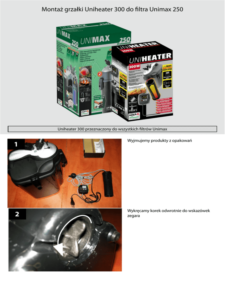 Montaż grzałki Uniheater 300 do filtra Unimax 250 Uniheater 300 przeznaczony do wszystkich filtrów Unimax 1 Wyjmujemy produkty z opakowań 2 Wykręcamy korek odwrotnie do wskazówek zegara 3 Grzałka ma już w sobie uszczelkę (oring). Wkładamy w miejsce korka grzałkę. 4 Wkładamy w miejsce korka grzałkę. Teraz wpychamy grzałkę do środka pojemnika i zaczynamy kręcić grzałką zgodnie ze wskazówkami zegara 5 Po wkręceniu powinna być w tym miejscu. 6 Korek pojemnika nie jest już potrzebny. 7