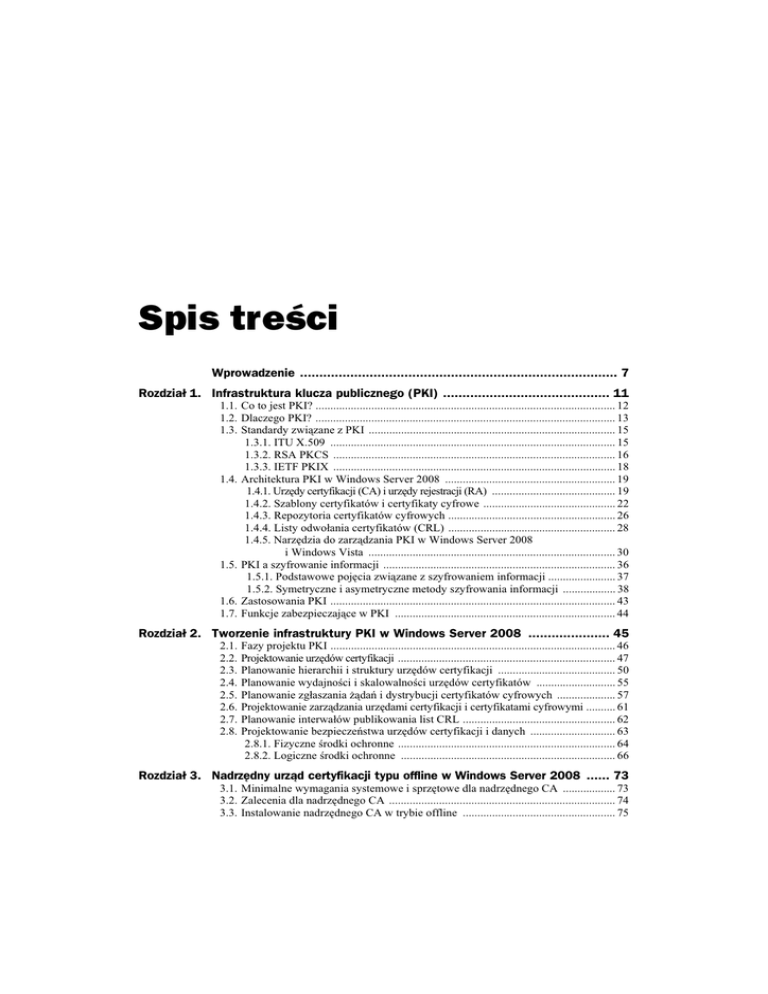 Spis tre!ci Wprowadzenie .................................................................................. 7 Rozdzia! 1. Infrastruktura klucza publicznego (PKI) ........................................... 11 1.1. Co to jest PKI? ...................................................................................................... 12 1.2. Dlaczego PKI? ...................................................................................................... 13 1.3. Standardy zwi$zane z PKI .................................................................................... 15 1.3.1. ITU X.509 ................................................................................................. 15 1.3.2. RSA PKCS ................................................................................................ 16 1.3.3. IETF PKIX ................................................................................................ 18 1.4. Architektura PKI w Windows Server 2008 .......................................................... 19 1.4.1. Urz%dy certyfikacji (CA) i urz%dy rejestracji (RA) .......................................... 19 1.4.2. Szablony certyfikatów i certyfikaty cyfrowe ............................................. 22 1.4.3. Repozytoria certyfikatów cyfrowych ......................................................... 26 1.4.4. Listy odwo"ania certyfikatów (CRL) ......................................................... 28 1.4.5. Narz%dzia do zarz$dzania PKI w Windows Server 2008 i Windows Vista .................................................................................... 30 1.5. PKI a szyfrowanie informacji ............................................................................... 36 1.5.1. Podstawowe poj%cia zwi$zane z szyfrowaniem informacji ....................... 37 1.5.2. Symetryczne i asymetryczne metody szyfrowania informacji .................. 38 1.6. Zastosowania PKI ................................................................................................. 43 1.7. Funkcje zabezpieczaj$ce w PKI ........................................................................... 44 Rozdzia! 2. Tworzenie infrastruktury PKI w Windows Server 2008 ..................... 45 2.1. 2.2. 2.3. 2.4. 2.5. 2.6. 2.7. 2.8. Fazy projektu PKI ................................................................................................. 46 Projektowanie urz%dów certyfikacji .......................................................................... 47 Planowanie hierarchii i struktury urz%dów certyfikacji ........................................ 50 Planowanie wydajno#ci i skalowalno#ci urz%dów certyfikatów ........................... 55 Planowanie zg"aszania !$da' i dystrybucji certyfikatów cyfrowych .................... 57 Projektowanie zarz$dzania urz%dami certyfikacji i certyfikatami cyfrowymi .......... 61 Planowanie interwa"ów publikowania list CRL .................................................... 62 Projektowanie bezpiecze'stwa urz%dów certyfikacji i danych ............................. 63 2.8.1. Fizyczne #rodki ochronne .......................................................................... 64 2.8.2. Logiczne #rodki ochronne ......................................................................... 66 Rozdzia! 3. Nadrz"dny urz#d certyfikacji typu offline w Windows Server 2008 ...... 73 3.1. Minimalne wymagania systemowe i sprz%towe dla nadrz%dnego CA .................. 73 3.2. Zalecenia dla nadrz%dnego CA ............................................................................. 74 3.3. Instalowanie nadrz%dnego CA w trybie offline .................................................... 75 4 Windows Server 2008. Infrastruktura klucza publicznego (PKI) 3.4. Konfigurowanie okresu wa!no#ci certyfikatów cyfrowych wystawianych przez nadrz%dny CA .................................................................. 85 3.5. Konfigurowanie punktu dystrybucji listy CRL (CDP) i dost%pu do informacji o urz%dach (AIA) ........................................................ 86 3.6. Publikowanie listy odwo"ania certyfikatów (CRL) ............................................... 90 3.7. Eksportowanie certyfikatu nadrz%dnego CA i listy CRL ...................................... 91 Rozdzia! 4. Podrz"dny urz#d certyfikacji typu online w Windows Server 2008 ...... 93 4.1. Minimalne wymagania systemowe i sprz%towe dla podrz%dnego CA .................. 93 4.2. Zalecenia dla podrz%dnego CA ............................................................................. 94 4.3. Instalowanie podrz%dnego CA w trybie online ..................................................... 95 4.4. Uzyskiwanie certyfikatu cyfrowego z nadrz%dnego CA dla podrz%dnego CA ......... 104 4.5. Importowanie certyfikatu nadrz%dnego CA i listy CRL do podrz%dnego CA ........ 109 4.6. Uruchamianie us"ugi certyfikatów na podrz%dnym CA ...................................... 115 4.7. Konfigurowanie punktu dystrybucji listy CRL (CDP) i dost%pu do informacji o urz%dach (AIA) ...................................................... 119 4.8. Publikowanie certyfikatu cyfrowego nadrz%dnego CA w us"udze katalogowej Active Directory ........................................................ 121 Rozdzia! 5. Szablony certyfikatów cyfrowych w Windows Server 2008 ............. 123 5.1. Domy#lne uprawnienia szablonów certyfikatów cyfrowych .............................. 124 5.1.1. Szablon certyfikatu cyfrowego typu „Kontroler domeny” ...................... 125 5.1.2. Szablon certyfikatu cyfrowego typu „Logowanie kart$ inteligentn$” ..... 126 5.1.3. Szablon certyfikatu cyfrowego typu „Administrator” ............................. 126 5.2. Instalowanie certyfikatu cyfrowego typu „Kontroler domeny” na kontrolerze domeny .................................................................................... 127 5.3. W"$czanie szablonu certyfikatu cyfrowego typu „Logowanie kart$ inteligentn$” na podrz%dnym CA ..................