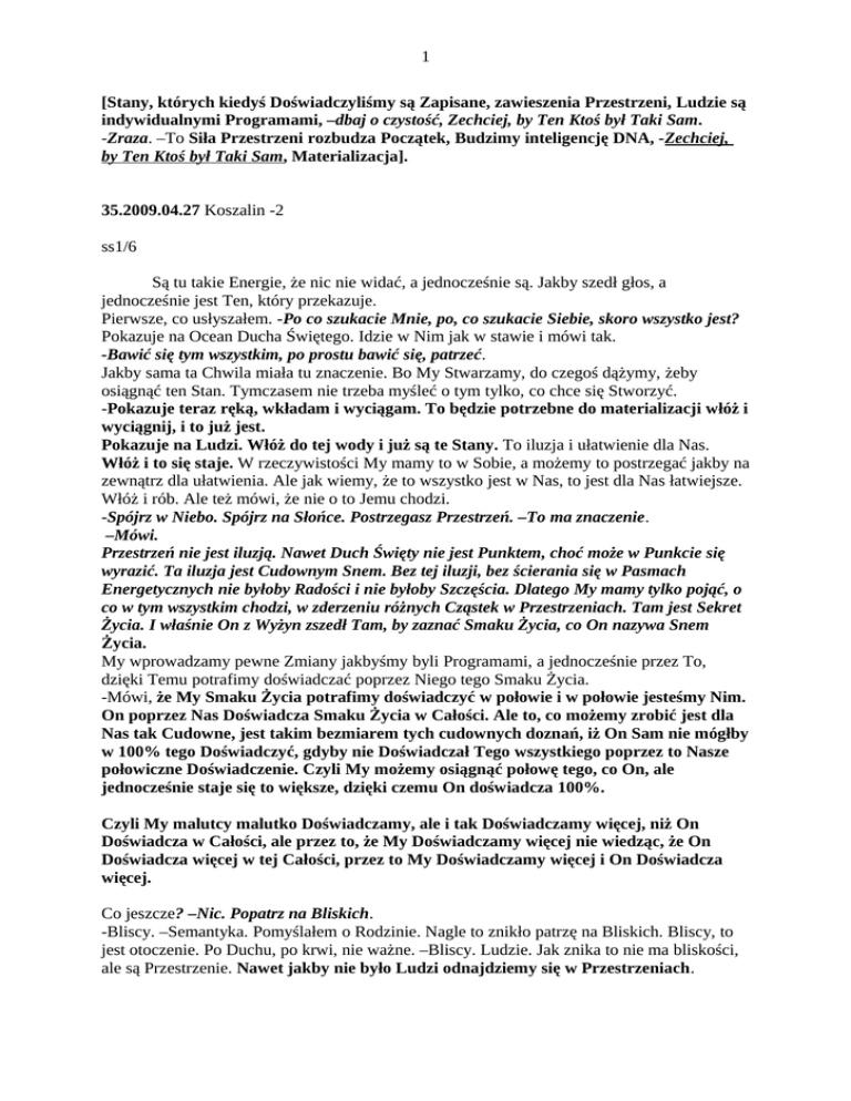 1 [Stany, których kiedyś Doświadczyliśmy są Zapisane, zawieszenia Przestrzeni, Ludzie są indywidualnymi Programami, –dbaj o czystość, Zechciej, by Ten Ktoś był Taki Sam. -Zraza. –To Siła Przestrzeni rozbudza Początek, Budzimy inteligencję DNA, -Zechciej, by Ten Ktoś był Taki Sam, Materializacja]. 35.2009.04.27 Koszalin -2 ss1/6 Są tu takie Energie, że nic nie widać, a jednocześnie są. Jakby szedł głos, a jednocześnie jest Ten, który przekazuje. Pierwsze, co usłyszałem. -Po co szukacie Mnie, po, co szukacie Siebie, skoro wszystko jest? Pokazuje na Ocean Ducha Świętego. Idzie w Nim jak w stawie i mówi tak. -Bawić się tym wszystkim, po prostu bawić się, patrzeć. Jakby sama ta Chwila miała tu znaczenie. Bo My Stwarzamy, do czegoś dążymy, żeby osiągnąć ten Stan. Tymczasem nie trzeba myśleć o tym tylko, co chce się Stworzyć. -Pokazuje teraz ręką, wkładam i wyciągam. To będzie potrzebne do materializacji włóż i wyciągnij, i to już jest. Pokazuje na Ludzi. Włóż do tej wody i już są te Stany. To iluzja i ułatwienie dla Nas. Włóż i to się staje. W rzeczywistości My mamy to w Sobie, a możemy to postrzegać jakby na zewnątrz dla ułatwienia. Ale jak wiemy, że to wszystko jest w Nas, to jest dla Nas łatwiejsze. Włóż i rób. Ale też mówi, że nie o to Jemu chodzi. -Spójrz w Niebo. Spójrz na Słońce. Postrzegasz Przestrzeń. –To ma znaczenie. –Mówi. Przestrzeń nie jest iluzją. Nawet Duch Święty nie jest Punktem, choć może w Punkcie się wyrazić. Ta iluzja jest Cudownym Snem. Bez tej iluzji, bez ścierania się w Pasmach Energetycznych nie byłoby Radości i nie byłoby Szczęścia. Dlatego My mamy tylko pojąć, o co w tym wszystkim chodzi, w zderzeniu różnych Cząstek w Przestrzeniach. Tam jest Sekret Życia. I właśnie On z Wyżyn zszedł Tam, by zaznać Smaku Życia, co On nazywa Snem Życia. My wprowadzamy pewne Zmiany jakbyśmy byli Programami, a jednocześnie przez To, dzięki Temu potrafimy doświadczać poprzez Niego tego Smaku Życia. -Mówi, że My Smaku Życia potrafimy doświadczyć w połowie i w połowie jesteśmy Nim. On poprzez Nas Doświadcza Smaku Życia w Całości. Ale to, co możemy zrobić jest dla Nas tak Cudowne, jest takim bezmiarem tych cudownych doznań, iż On Sam nie mógłby w 100% tego Doświadczyć, gdyby nie Doświadczał Tego wszystkiego poprzez to Nasze połowiczne Doświadczenie. Czyli My możemy osiągnąć połowę tego, co On, ale jednocześnie staje się to większe, dzięki czemu On doświadcza 100%. Czyli My malutcy malutko Doświadczamy, ale i tak Doświadczamy więcej, niż On Doświadcza w Całości, ale przez to, że My Doświadczamy więcej nie wiedząc, że On Doświadcza więcej w tej Całości, przez to My Doświadczamy więcej i On Doświadcza więcej. Co jeszcze? –Nic. Popatrz na Bliskich. -Bliscy. –Semantyka. Pomyślałem o Rodzinie. Nagle to znikło patrzę na Bliskich. Bliscy, to jest otoczenie. Po Duchu, po krwi, nie ważne. –Bliscy. Ludzie. Jak znika to nie ma bliskości, ale są Przestrzenie. Nawet jakby nie było Ludzi odnajdziemy się w Przestrzeniach. 2 Zwraca uwagę na Dom. On też Istnieje. To są Planety, Siły Przyrody i jakieś inne Istnienia. My doskonalimy się, bo każdy Człowiek jest jakimś Programem. Poprzez wymianę pewnych Energii między tymi Programami można zapanować nad drugim Programem, można wykasować pewne Działania Energetyczne. To jest możliwe przez odnalezienie samego Programu. My Programów w całości nie widzimy, dlatego, że są zabrudzone przez inne programy. Natomiast sam Program jest czysty i można tę Jego Naturę poznać i zmienić jego interakcję z otoczeniem. -Mówi, że trzeba popatrzeć na ten cały Świat. Tu są też Przestrzenie i cudowne… -mówi o jakiejś symultanie. Ale nie rozumiem. Podsunął mi jakieś obrazy, ale nie zrozumiałem. Chwycił mi głowę i teraz patrzę na coś. Na zachód Słońca. -Czego doznajesz? –Feerii barw. –Dobrze. Ale pokazuje, że z tego Słońca, skąd płyną pewne doznania, pewne Energie, pewne zapisy. -Pogania mnie. -Dalej, dalej, dalej. -Pewne zawieszenia. -Zawieszenia! Innymi słowy, kiedy się ścieramy z Programami, czy z Przestrzeniami, to są Zapisy pewnych Stanów. Nie trzeba czegoś na okrętkę czegoś robić, by te Stany odtworzyć i wtedy jest Człowiek w Radości. -Mówi; -w Radości Przestrzeni. -Pokazuje na Nas. W Nas jest Przestrzeń. Czyli te wszystkie Stany, których kiedyś Doświadczyliśmy są Zapisane. Teraz rozumiem. Mówią o namiętności, przyjaźni, miłości Tu, żeby było Spełnienie. Bo możemy odtworzyć Stan idealny. Ten, który był. To samo z przywracaniem systemu. Paradygmat czystości. Możemy przywrócić to, co było, czyli musimy osiągnąć raz coś na maximum, żeby zawsze móc tego Doświadczyć. -Mówi tak. –Wyczyść Program, wyczyść Przestrzeń, odtwórz Stan i to się Stanie. Czyli np. doświadczam przyjaźni, miłości, namiętności z Kimś. Zapisuję ten Stan. -Przenoszę się do Kogoś Innego. Wyczyszczam Kogoś Innego. Odtwarzam ten Stan. I jest to samo. -Mówi tak. –Patrzysz na zachód Słońca. Jesteś na dachu wieżowca. Zapisujesz Stan. Idziesz do domu i odtwarzasz ten Stan. I choć Słońca nie ma doznajesz tej samej rozkoszy. Tej samej rozkoszy można doznać z drugim Człowiekiem. -Wejdź raz w coś. Najlepiej w Czystość samego Siebie. Bo tam jest Duch Święty, bo tam jestem Ja. Bo tam jest to coś, co dzisiaj już poznaliśmy. -Przy odtworzeniu tej Czystości w Nas jest Zapis Doskonałości i ten Zapis możemy odtworzyć w Drugim Człowieku. Wystarczy Go tylko wyczyścić. Dlatego musimy być czyści jak Jezus, wtedy dotykając Kogoś odtwarzamy samych Siebie w Nim. W tej pewnej indywidualnej inności. Na logikę. Skoro wszystko jest w Nas, jak dotykam i jak chcę, to mogę Go doprowadzić do takiego samego Poziomu we wszystkim. Kiedyś pokazywałem w jaki sposób w kimś rozbudzić uczu