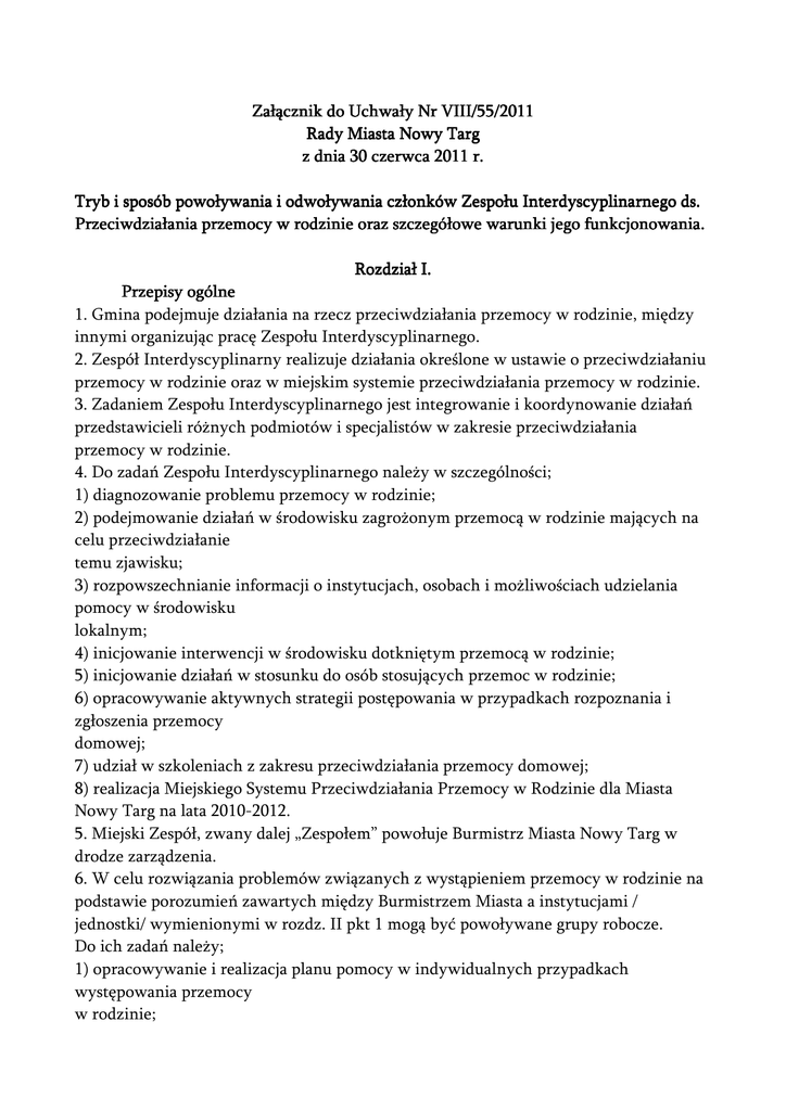 Załą Załącznik do Uchwały Nr VIII/55/2011 Rady Miasta Nowy Targ z dnia 30 czerwca 2011 r. Tryb i sposób powoływania i odwoływania członków Zespołu Interdyscyplinarnego ds. Przeciwdziałania przemocy w rodzinie oraz szczegółowe warunki jego funkcjonowania. Rozdział I. Przepisy ogólne 1. Gmina podejmuje działania na rzecz przeciwdziałania przemocy w rodzinie, między innymi organizując pracę Zespołu Interdyscyplinarnego. 2. Zespół Interdyscyplinarny realizuje działania określone w ustawie o przeciwdziałaniu przemocy w rodzinie oraz w miejskim systemie przeciwdziałania przemocy w rodzinie. 3. Zadaniem Zespołu Interdyscyplinarnego jest integrowanie i koordynowanie działań przedstawicieli różnych podmiotów i specjalistów w zakresie przeciwdziałania przemocy w rodzinie. 4. Do zadań Zespołu Interdyscyplinarnego należy w szczególności; 1) diagnozowanie problemu przemocy w rodzinie; 2) podejmowanie działań w środowisku zagrożonym przemocą w rodzinie mających na celu przeciwdziałanie temu zjawisku; 3) rozpowszechnianie informacji o instytucjach, osobach i możliwościach udzielania pomocy w środowisku lokalnym; 4) inicjowanie interwencji w środowisku dotkniętym przemocą w rodzinie; 5) inicjowanie działań w stosunku do osób stosujących przemoc w rodzinie; 6) opracowywanie aktywnych strategii postępowania w przypadkach rozpoznania i zgłoszenia przemocy domowej; 7) udział w szkoleniach z zakresu przeciwdziałania przemocy domowej; 8) realizacja Miejskiego Systemu Przeciwdziałania Przemocy w Rodzinie dla Miasta Nowy Targ na lata 2010-2012. 5. Miejski Zespół, zwany dalej „Zespołem” powołuje Burmistrz Miasta Nowy Targ w drodze zarządzenia. 6. W celu rozwiązania problemów związanych z wystąpieniem przemocy w rodzinie na podstawie porozumień zawartych między Burmistrzem Miasta a instytucjami / jednostki/ wymienionymi w rozdz. II pkt 1 mogą być powoływane grupy robocze. Do ich zadań należy; 1) opracowywanie i realizacja planu pomocy w indywidualnych przypadkach występowania przemocy w rodzinie; 2) monitorowanie sytuacji rodzin , w których, dochodzi do przemocy oraz rodzin zagrożonych występowaniem przemocą ; 3) dokumentowanie działań podejmowanych wobec rodzin oraz efektów tych działań. Rozdział II. Tryb i sposób powoływania i odwoływania członków Zespołu Interdyscyplinarnego 1. Członków Zespołu Interdyscyplinarnego ds. przeciwdziałania przemocy w rodzinie powołuje i odwołuje Burmistrz Miasta Nowego Targu w drodze zarządzenia. 2. W skład Zespołu Interdyscyplinarnego wchodzą przedstawiciele następujących instytucji, organizacji i jednostek organizacyjnych: 1) Ośrodka Pomocy Społecznej w Nowym Targu 2) Komendy Powiatowej Policji w Nowym Targu 3) Pełnomocnik Burmistrza Miasta ds. Profilaktyki i Przeciwdziałania Uzależnieniom 4) Wydziału Oświaty UM 5) Polskiego Komitetu Pomocy Społecznej w Nowym Targu 6) Nowotarskiego Klubu Abstynentów „Rodzina” 7) Kuratorów Sądowych 8) Pielęgniarek 9) psycholog 10) pedagog – terapeuta 11) adwokat 3. W skład Zespołu mogą wchodzić przedstawiciele: 1) Prokuratury Rejonowej w Nowym Targu 2) Sądu w Nowym Targu 3) Straży Miejskiej UM 4. Powoływanie i odwoływanie członków Zespołu Interdyscyplinarnego: 1) Przedstawiciele poszczególnych instytucji, organizacji zostają wskazani imiennie przez osoby kierujące instytucjami. Osoby prowadzące indywidualną działalność, wyrażają zgodę i chęć na udział w pracach Zespołu. 2) Skład Zespołu Interdyscyplinarnego zostaje powołany zarządzeniem Burmistrza Miasta Nowego Targu. 3) Każdy członek Zespołu Interdyscyplinarnego przed udziałem w pierwszym posiedzeniu składa pisemne oświadczenie o zachowaniu poufności wszelkich informacji i danych uzyskanych przy realizacji zadań w ramach pracy Zespołu. 4) Członek Zespołu Interdyscyplinarnego może zostać odwołany w trybie natychmiastowym, w przypadku uzasadnionego podejrzenia naruszenie zasad poufności i informacji uzyskanych w ramach działania w Zespole Interdyscyplinarnym mocą Zarządzenia Burmistrza Miasta Nowy Targ. 5) Członek Zespołu Interdyscyplinarnego może zostać odwołany gdy instytucja /organizacja/ wyznaczy imiennie innego przedstawiciela. 5. Powoływanie i odwoływanie przewodniczącego Zespołu Interdyscyplinarnego. 1) Przewodniczący Zespołu Interdyscyplinarnego zostaje wybrany na pierwszym posiedzeniu w głosowaniu jawnym, zwykłą większością głosów przy udziale co najmniej połowy członków. 2) Przewodniczący zostaje wybrany na okres 3 lat. 3) O wyborze Przewodniczącego Zespołu Interdyscyplinarnego zostaje pisemnie powiadomiony Burmistrz Miasta Nowy Targ. 4) Przewodniczący może zostać odwołany na podstawie; a) uzasadnionego pisemnego wniosku któregokolwiek z członków Zespołu Interdyscyplinarnego. Odwołanie następuje w wyniku głosowania jawnego, zwykłą większością głosów przy udziale co najmniej połowy członków. b) pisemnej rezygnacji Przewodniczącego. c) uzasadnionego, pisemnego wniosku Burmistrza Miasta Nowy Targ. 5) Odwołanie Przewodniczącego skutkuje koniecznością powołania nowego Przewodniczącego, zgodniez zapisem pkt.1 , w trybie określonym w ust.3 pkt.1 Rozdział III. Szczegółowe warunki funkcjonowania funkcjonowania Zespołu Interdyscyplinarnego 1. Kadencja Zespołu trwa 3 lata. 2. Zespół Interdyscyplinarny działa na podstawie porozumień zawartych pomiędzy Burmistrzem Miasta, a podmiotami, których przedstawiciele wchodzą w jego skład, w przypadku pracowników samorządowych wskazanych przez Burmistrza Miasta Nowego Targu, a w przypadku osób prowadzących odrębną działalność, na podstawie wyrażonej przez nich zgody na udział w posiedzeniach Zespołu. 3. Członkowie Zespołu Interdyscyplinarnego wykonują zadania w ramach obowiązków służbowych lub zawodowych. 4. Za obsługę techniczno-organizacyjną Zespołu Interdyscyplinarnego odpowiedzialny jest Ośr