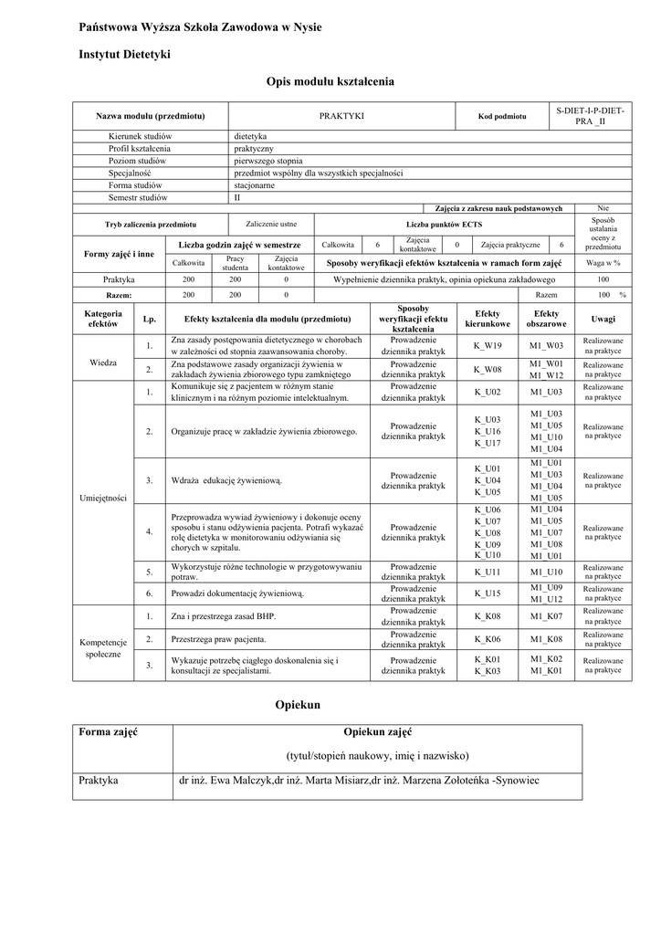 Państwowa WyŜsza Szkoła Zawodowa w Nysie Instytut Dietetyki Opis modułu kształcenia PRAKTYKI Nazwa modułu (przedmiotu) Kierunek studiów Profil kształcenia Poziom studiów Specjalność Forma studiów Semestr studiów S-DIET-I-P-DIETPRA _II Kod podmiotu dietetyka praktyczny pierwszego stopnia przedmiot wspólny dla wszystkich specjalności stacjonarne II Zajęcia z zakresu nauk podstawowych Nie 6 Sposób ustalania oceny z przedmiotu Całkowita Pracy studenta Zajęcia kontaktowe Sposoby weryfikacji efektów kształcenia w ramach form zajęć Waga w % Praktyka 200 200 0 Wypełnienie dziennika praktyk, opinia opiekuna zakładowego 100 Razem: 200 200 0 Razem 100 Efekty kierunkowe Efekty obszarowe Uwagi K_W19 M1_W03 Realizowane na praktyce K_W08 M1_W01 M1_W12 Realizowane na praktyce K_U02 M1_U03 Realizowane na praktyce Organizuje pracę w zakładzie Ŝywienia zbiorowego. Prowadzenie dziennika praktyk K_U03 K_U16 K_U17 M1_U03 M1_U05 M1_U10 M1_U04 Realizowane na praktyce 3. WdraŜa edukację Ŝywieniową. Prowadzenie dziennika praktyk K_U01 K_U04 K_U05 4. Przeprowadza wywiad Ŝywieniowy i dokonuje oceny sposobu i stanu odŜywienia pacjenta. Potrafi wykazać rolę dietetyka w monitorowaniu odŜywiania się chorych w szpitalu. Prowadzenie dziennika praktyk K_U06 K_U07 K_U08 K_U09 K_U10 M1_U01 M1_U03 M1_U04 M1_U05 M1_U04 M1_U05 M1_U07 M1_U08 M1_U01 5. Wykorzystuje róŜne technologie w przygotowywaniu potraw. K_U11 M1_U10 Realizowane na praktyce 6. Prowadzi dokumentację Ŝywieniową. K_U15 M1_U09 M1_U12 Realizowane na praktyce 1. Zna i przestrzega zasad BHP. K_K08 M1_K07 Realizowane na praktyce 2. Przestrzega praw pacjenta. K_K06 M1_K08 Realizowane na praktyce 3. Wykazuje potrzebę ciągłego doskonalenia się i konsultacji ze specjalistami. K_K01 K_K03 M1_K02 M1_K01 Realizowane na praktyce Zaliczenie ustne Tryb zaliczenia przedmiotu Liczba godzin zajęć w semestrze Formy zajęć i inne Kategoria efektów Lp. 1. Wiedza 2. 1. 2. Liczba punktów ECTS Całkowita Efekty kształcenia dla modułu (przedmiotu) Zna zasady postępowania dietetycznego w chorobach w zaleŜności od stopnia zaawansowania choroby. Zna podstawowe zasady organizacji Ŝywienia w zakładach Ŝywienia zbiorowego typu zamkniętego Komunikuje się z pacjentem w róŜnym stanie klinicznym i na róŜnym poziomie intelektualnym. 6 Zajęcia kontaktowe Sposoby weryfikacji efektu kształcenia Prowadzenie dziennika praktyk Prowadzenie dziennika praktyk Prowadzenie dziennika praktyk 0 Zajęcia praktyczne Umiejętności Kompetencje społeczne Prowadzenie dziennika praktyk Prowadzenie dziennika praktyk Prowadzenie dziennika praktyk Prowadzenie dziennika praktyk Prowadzenie dziennika praktyk Opiekun Forma zajęć Opiekun zajęć (tytuł/stopień naukowy, imię i nazwisko) Praktyka dr inŜ. Ewa Malczyk,dr inŜ. Marta Misiarz,dr inŜ. Marzena Zołoteńka -Synowiec % Realizowane na praktyce Realizowane na praktyce RAMOWY HARMONOGRAM PRAKTYK NA II SEMESTRZE STUDIÓW Wstępna praktyka w szpitalu Cel praktyki Placówki Czas trwania praktyki Miejsce odbywania praktyk blok Ŝywieniowy szpitala, kuchnia ogólna, dział Ŝywienia, oddział szpitalny Zapoznanie studenta z organizacją i funkcjonowaniem bloku Ŝywienia w szpitalu, oraz z zadaniami dietetyka uczestniczącego w realizacji prawidłowego Ŝywienia pacjentów. Zdobycie podstawowych praktycznych umiejętności wykonywania posiłków dla pacjentów. Miejscem odbywania praktyk są wybrane przez studenta instytucje, w których istnieje moŜliwość wykonywania zadań wynikających z niniejszego programu praktyk, w tym w szczególności: szpitale gminne, powiatowe, miejskie, wojewódzkie, kliniczne, placówki ochrony zdrowia, zakłady opieki zdrowotnej. 120 godz. (15 dni roboczych) L.p. Zadania szczegółowe do realizacji w ramach praktyki 1. Zapoznanie sie z przepisami BHP i regulaminem pracy obowiązującym w szpitalu. 2. Poznanie struktury organizacyjnej placówki z uwzględnieniem kompetencji poszczególnych oddziałów. 3. Poznanie zasad przyjmowania pacjentów na oddział szpitalny. 4. Poznanie organizacji Ŝywienia pacjentów: zaopatrzenie, magazynowanie Ŝywności, produkcja posiłków, ich wydawanie i rozdział, rodzaje stosowanych diet. 5. Pomoc w Ŝywieniu chorych. 6. Zapoznanie sie z podstawami prawnymi funkcjonowania oraz elementami jawnej dokumentacji regulującej działalność placówki, zapoznanie studentów z obiegiem tych dokumentów. 7. Zapoznanie z systemem kontroli i zarządzania jakością (laboratoria kontrolne). Praktyka w dziale Ŝywienia w szpitalu Cel praktyki Zapoznanie studenta z funkcjonowaniem działu Ŝywienia w szpitalu oraz z jego rolą i zadaniami. Zapoznanie z działalnością poradni dietetycznej. Nabycie praktycznych umiejętności z zakresu działania tych jednostek. Miejscem odbywania praktyk są wybrane przez studenta instytucje, w których istnieje moŜliwość wykonywania zadań wynikających z niniejszego programu praktyk, w tym w szczególności: szpitale gminne, powiatowe, miejskie, wojewódzkie, kliniczne Placówki Czas trwania praktyki 80 godz. (10 dni roboczych) Miejsce odbywania praktyk dział Ŝywienia w szpitalach o róŜnym profilu Zadania szczegółowe do realizacji w ramach praktyki L.p. 1. Poznanie struktury organizacyjnej działu Ŝywienia. 2. Zapoznanie z rodzajem diet stosowanych w Ŝywieniu szpitalnym. 3. Sporządzanie i wypełnianie dokumentacji Ŝywieniowej. 4. Planowanie jadłospisów dekadowych diet stosowanych w Ŝywieniu szpitalnym. Poznanie zasad przechowywania poszczególnych grup artykułów spoŜywczych oraz ocena warunków ich przechowywania. 5. ............................................................ ………………………………… Koordynator modułu (przedmiotu) Dyrektor Instytutu podpis pieczęć i podpis