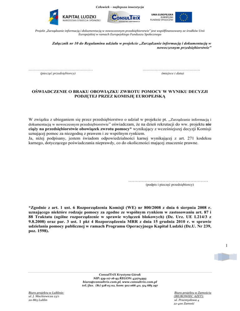 Człowiek – najlepsza inwestycja Projekt „Zarządzanie informacją i dokumentacją w nowoczesnym przedsiębiorstwie” jest współfinansowany ze środków Unii Europejskiej w ramach Europejskiego Funduszu Społecznego Załącznik nr 10 do Regulaminu udziału w projekcie „Zarządzanie informacją i dokumentacją w nowoczesnym przedsiębiorstwie” ………………………………………… ……………………………………. (pieczęć przedsiębiorcy) (miejsce i data) OŚWIADCZENIE O BRAKU OBOWIĄZKU ZWROTU POMOCY W WYNIKU DECYZJI PODJĘTEJ PRZEZ KOMISJĘ EUROPEJSKĄ W związku z ubieganiem się przez przedsiębiorstwo o udział w projekcie pt. „ Zarządzanie informacją i dokumentacją w nowoczesnym przedsiębiorstwie” oświadczam, że na dzień rekrutacji do ww. projektu nie ciąży na przedsiębiorstwie obowiązek zwrotu pomocy* wynikający z wcześniejszej decyzji Komisji uznającej pomoc za niezgodną z prawem i ze wspólnym rynkiem. Ja, niżej podpisany, jestem świadom odpowiedzialności karnej wynikającej z art. 271 kodeksu karnego, dotyczącego poświadczania nieprawdy, co do okoliczności mającej znaczenie prawne. ……………………………………………… (podpis i pieczęć przedsiębiorcy) *Zgodnie z art. 1 ust. 6 Rozporządzenia Komisji (WE) nr 800/2008 z dnia 6 sierpnia 2008 r. uznającego niektóre rodzaje pomocy za zgodne ze wspólnym rynkiem w zastosowaniu art. 87 i 88 Traktatu (ogólne rozporządzenie w sprawie wyłączeń blokowych) (Dz. Urz. UE L214/3 z 9.8.2008) oraz par. 3 ust. 1 pkt 4 Rozporządzenia MRR z dnia 15 grudnia 2010 r. w sprawie udzielania pomocy publicznej w ramach Programu Operacyjnego Kapitał Ludzki (Dz.U. Nr 239, poz. 1598). 1 ConsulTriX Krystyna Górak NIP: 539-117-16-93 REGON: 432714593 [email protected], www.consultrix.com.pl tel./fax. (81) 528 03 02, kom: 502 066 411, 514 685 297 Biuro projektu w Lublinie: ul. J. Mackiewicza 23/1 20-865 Lublin Biuro projektu w Zamościu (BIUROWIEC AZET): ul. Przemysłowa 4 22-400 Zamość