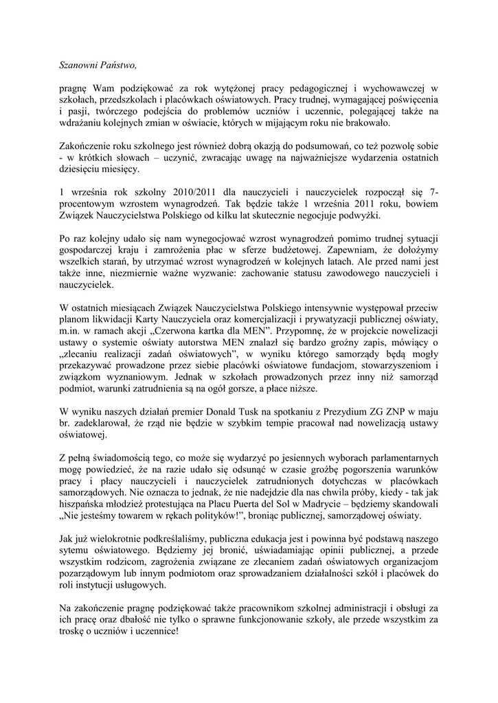 Szanowni Państwo, pragnę Wam podziękować za rok wytężonej pracy pedagogicznej i wychowawczej w szkołach, przedszkolach i placówkach oświatowych. Pracy trudnej, wymagającej poświęcenia i pasji, twórczego podejścia do problemów uczniów i uczennic, polegającej także na wdrażaniu kolejnych zmian w oświacie, których w mijającym roku nie brakowało. Zakończenie roku szkolnego jest również dobrą okazją do podsumowań, co też pozwolę sobie - w krótkich słowach – uczynić, zwracając uwagę na najważniejsze wydarzenia ostatnich dziesięciu miesięcy. 1 września rok szkolny 2010/2011 dla nauczycieli i nauczycielek rozpoczął się 7procentowym wzrostem wynagrodzeń. Tak będzie także 1 września 2011 roku, bowiem Związek Nauczycielstwa Polskiego od kilku lat skutecznie negocjuje podwyżki. Po raz kolejny udało się nam wynegocjować wzrost wynagrodzeń pomimo trudnej sytuacji gospodarczej kraju i zamrożenia płac w sferze budżetowej. Zapewniam, że dołożymy wszelkich starań, by utrzymać wzrost wynagrodzeń w kolejnych latach. Ale przed nami jest także inne, niezmiernie ważne wyzwanie: zachowanie statusu zawodowego nauczycieli i nauczycielek. W ostatnich miesiącach Związek Nauczycielstwa Polskiego intensywnie występował przeciw planom likwidacji Karty Nauczyciela oraz komercjalizacji i prywatyzacji publicznej oświaty, m.in. w ramach akcji „Czerwona kartka dla MEN”. Przypomnę, że w projekcie nowelizacji ustawy o systemie oświaty autorstwa MEN znalazł się bardzo groźny zapis, mówiący o „zlecaniu realizacji zadań oświatowych”, w wyniku którego samorządy będą mogły przekazywać prowadzone przez siebie placówki oświatowe fundacjom, stowarzyszeniom i związkom wyznaniowym. Jednak w szkołach prowadzonych przez inny niż samorząd podmiot, warunki zatrudnienia są na ogół gorsze, a płace niższe. W wyniku naszych działań premier Donald Tusk na spotkaniu z Prezydium ZG ZNP w maju br. zadeklarował, że rząd nie będzie w szybkim tempie pracował nad nowelizacją ustawy oświatowej. Z pełną świadomością tego, co może się wydarzyć po jesiennych wyborach parlamentarnych mogę powiedzieć, że na razie udało się odsunąć w czasie groźbę pogorszenia warunków pracy i płacy nauczycieli i nauczycielek zatrudnionych dotychczas w placówkach samorządowych. Nie oznacza to jednak, że nie nadejdzie dla nas chwila próby, kiedy - tak jak hiszpańska młodzież protestująca na Placu Puerta del Sol w Madrycie – będziemy skandowali „Nie jesteśmy towarem w rękach polityków!”, broniąc publicznej, samorządowej oświaty. Jak już wielokrotnie podkreślaliśmy, publiczna edukacja jest i powinna być podstawą naszego sytemu oświatowego. Będziemy jej bronić, uświadamiając opinii publicznej, a przede wszystkim rodzicom, zagrożenia związane ze zlecaniem zadań oświatowych organizacjom pozarządowym lub innym podmiotom oraz sprowadzaniem działalności szkół i placówek do roli instytucji usługowych. Na zakończenie pragnę podziękować także pracownikom szkolnej administracji i obsługi za ich pracę oraz dbałość nie tylko o sprawne funkcjonowanie szkoły, ale przede wszystkim za troskę o uczniów i uczennice! Wszystkim Pracownikom oświaty, Nauczycielom i Nauczycielkom oraz Uczniom i Uczennicom życzę długiego i udanego wypoczynku! Sławomir Broniarz /-/ Prezes ZNP