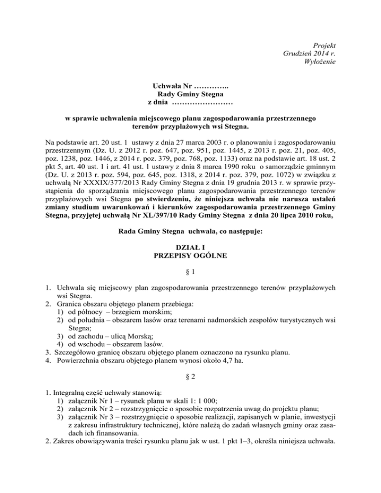 Projekt Grudzień 2014 r. WyłoŜenie Uchwała Nr ………….. Rady Gminy Stegna z dnia …………………… w sprawie uchwalenia miejscowego planu zagospodarowania przestrzennego terenów przyplaŜowych wsi Stegna. Na podstawie art. 20 ust. 1 ustawy z dnia 27 marca 2003 r. o planowaniu i zagospodarowaniu przestrzennym (Dz. U. z 2012 r. poz. 647, poz. 951, poz. 1445, z 2013 r. poz. 21, poz. 405, poz. 1238, poz. 1446, z 2014 r. poz. 379, poz. 768, poz. 1133) oraz na podstawie art. 18 ust. 2 pkt 5, art. 40 ust. 1 i art. 41 ust. 1 ustawy z dnia 8 marca 1990 roku o samorządzie gminnym (Dz. U. z 2013 r. poz. 594, poz. 645, poz. 1318, z 2014 r. poz. 379, poz. 1072) w związku z uchwałą Nr XXXIX/377/2013 Rady Gminy Stegna z dnia 19 grudnia 2013 r. w sprawie przystąpienia do sporządzania miejscowego planu zagospodarowania przestrzennego terenów przyplaŜowych wsi Stegna po stwierdzeniu, Ŝe niniejsza uchwała nie narusza ustaleń zmiany studium uwarunkowań i kierunków zagospodarowania przestrzennego Gminy Stegna, przyjętej uchwałą Nr XL/397/10 Rady Gminy Stegna z dnia 20 lipca 2010 roku, Rada Gminy Stegna uchwala, co następuje: DZIAŁ I PRZEPISY OGÓLNE §1 1. Uchwala się miejscowy plan zagospodarowania przestrzennego terenów przyplaŜowych wsi Stegna. 2. Granica obszaru objętego planem przebiega: 1) od północy – brzegiem morskim; 2) od południa – obszarem lasów oraz terenami nadmorskich zespołów turystycznych wsi Stegna; 3) od zachodu – ulicą Morską; 4) od wschodu – obszarem lasów. 3. Szczegółowo granicę obszaru objętego planem oznaczono na rysunku planu. 4. Powierzchnia obszaru objętego planem wynosi około 4,7 ha. §2 1. Integralną część uchwały stanowią: 1) załącznik Nr 1 – rysunek planu w skali 1: 1 000; 2) załącznik Nr 2 – rozstrzygnięcie o sposobie rozpatrzenia uwag do projektu planu; 3) załącznik Nr 3 – rozstrzygnięcie o sposobie realizacji, zapisanych w planie, inwestycji z zakresu infrastruktury technicznej, które naleŜą do zadań własnych gminy oraz zasadach ich finansowania. 2. Zakres obowiązywania treści rysunku planu jak w ust. 1 pkt 1–3, określa niniejsza uchwała. 2 §3 Celem ustaleń planu jest harmonijne zagospodarowanie terenów przyplaŜowych wsi Stegna ze szczególnym uwzględnieniem morskiej przystani rybackiej. §4 Ilekroć w dalszych przepisach niniejszej uchwały jest mowa o: 1) planie – naleŜy przez to rozumieć ustalenia objęte niniejszą uchwałą; 2) obszarze planu – naleŜy przez to rozumieć obszar w granicach określonych w § 1; 3) rysunku – naleŜy przez to rozumieć załącznik Nr 1; 4) symbolu – naleŜy przez to rozumieć oznaczenie literowe i oznaczenie literowe z cyfrą określające tereny o róŜnym przeznaczeniu i róŜnych zasadach zagospodarowania; 5) nieprzekraczalnej linii zabudowy – naleŜy przez to rozumieć linię poza którą wyklucza się lokalizację budynków; nieprzekraczalna linia zabudowy nie dotyczy takich elementów jak: balkon, okap, wykusz, schody zewnętrzne, ganek, podcień. DZIAŁ II USTALENIA DLA CAŁEGO OBSZARU PLANU ROZDZIAŁ 1 USTALENIA W ZAKRESIE URBANISTYKI §5 1. Zagospodarowanie terenów następuje zgodnie z ich przeznaczeniem z uwzględnieniem ustaleń działów II i III oraz wszystkich aktualnie obowiązujących przepisów szczególnych. 2. Plan nie ustala granic terenów wymagających scalenia gruntów. 3. Dopuszcza się realizację urządzeń budowlanych, zapewniających moŜliwość uŜytkowania obiektu budowlanego zgodnie z jego przeznaczeniem. §6 1. Tereny o ustalonym planem przeznaczeniu lub róŜnych zasadach zagospodarowania zawarte są pomiędzy liniami rozgraniczającymi oznaczonymi na rysunku liniami ciągłymi. 2. Ustala się nieprzekraczalne linie zabudowy oznaczone na rysunku: 1) na terenie zabudowy usługowej U1 – w odległości 8 m od krawędzi jezdni ulicy zbiorczej KDZ, będącej w ciągu drogi powiatowej nr 2325G; 2) na terenie morskiej przystani rybackiej MPR – od strony północnej i zachodniej na działce nr 1223/6. 3. Nieprzekraczalna linia zabudowy od strony zachodniej na terenie morskiej przystani rybackiej MPR na działce nr 1223/6, o której mowa w § 6 ust. 2 pkt – nie dotyczy budynku maszynowni wyciągarki dla jednostek rybackich. 4. Nieprzekraczalna linia zabudowa od strony zachodniej na terenie morskiej przystani rybackiej MPR na działce nr 1223/6, o której mowa w § 6 ust. 2 pkt 2 – będzie mogła być przesunięta w kierunku zachodnim – po zrealizowaniu kompleksowego systemu odprowadzenia wód opadowych dla terenu zabudowy usługowej U1. 5. Na terenie morskiej przystani rybackiej MPR na działce nr 1223/6 dopuszcza się sytuowanie budynku lub budynków: 3 6. 1) bezpośrednio przy wschodniej granicy działki nr 1223/6; 2) w odległości 1,5 m od południowej granicy działki nr 1223/6. Pozostałe nieprzekraczalne linie zabudowy w obszarze planu – obowiązują według aktualnych przepisów szczególnych. ROZDZIAŁ 2 USTALENIA W ZAKRESIE ARCHITEKTURY §7 1. Ustalenia szczegółowe kształtowania architektury określa dział III. 2. Przy uwzględnieniu ustaleń ust. 1 plan nie ogranicza swobody kształtowania architektury budynków. 3. Obiekty małej architektury mogą być sytuowane na terenach określonych w dalszej części niniejszej uchwały. 4. Ustala się zakaz lokalizacji wolno stojących urządzeń reklamowych. 5. Ustala się maksymalną wysokość do 1,8 m dla nowych ogrodzeń. 6. Ustala się zakaz realizacji Ŝelbetowych wypełnień nowych ogrodzeń. 7. Zakaz, o którym mowa w ust. 7 nie dotyczy elementów konstrukcyjnych nowego ogrodzenia, takich jak słupki i podmurówki. ROZDZIAŁ 3 USTALENIA W ZAKRESIE OCHRONY ŚRODOWISKA, PRZYRODY I KRAJOBRAZU §8 1. Obszar planu połoŜony jest w otulinie Parku Krajobrazowego „Mierzeja Wiślana”, która została wyznaczona w celu zabezpieczenia Parku przed zagroŜeniami zewnętrznymi wynikającymi z działalności człowieka. 2. Funkcjonowanie t