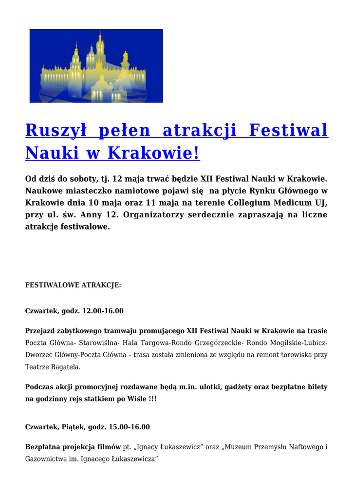 Ruszył pełen atrakcji Festiwal Nauki w Krakowie! Od dziś do soboty, tj. 12 maja trwać będzie XII Festiwal Nauki w Krakowie. Naukowe miasteczko namiotowe pojawi się na płycie Rynku Głównego w Krakowie dnia 10 maja oraz 11 maja na terenie Collegium Medicum UJ, przy ul. św. Anny 12. Organizatorzy serdecznie zapraszają na liczne atrakcje festiwalowe. FESTIWALOWE ATRAKCJE: Czwartek, godz. 12.00-16.00 Przejazd zabytkowego tramwaju promującego XII Festiwal Nauki w Krakowie na trasie Poczta Główna- Starowiślna- Hala Targowa-Rondo Grzegórzeckie- Rondo Mogilskie-LubiczDworzec Główny-Poczta Główna – trasa została zmieniona ze względu na remont torowiska przy Teatrze Bagatela. Podczas akcji promocyjnej rozdawane będą m.in. ulotki, gadżety oraz bezpłatne bilety na godzinny rejs statkiem po Wiśle !!! Czwartek, Piątek, godz. 15.00-16.00 Bezpłatna projekcja filmów pt. „Ignacy Łukaszewicz” oraz „Muzeum Przemysłu Naftowego i Gazownictwa im. Ignacego Łukaszewicza” Kino pod Baranami, Rynek Główny 27 (wejściówki dostępne w kasie Kina na godzinę przed każdym seansem) Sobota, godz. 13.00-14.00 Godzinny, bezpłatny rejs statkiem po Wiśle. Podczas rejsu uczestnicy otrzymają gadżety promujące XII Festiwal Nauki w Krakowie. Festiwal Nauki w Krakowie odbywa się w dniach od 9 do 12 maja 2012. SZCZEGÓŁOWY PROGRAM: WWW.FESTIWALNAUKI.KRAKOW.PL Już za tydzień XII Festiwal Nauki w Krakowie. Teoria – Poznanie – Doświadczenie to hasło tegorocznej edycji Festiwalu Nauki w Krakowie, który odbywać się będzie od 9 do 12 maja br. Patronem wydarzenia jest Jan Józef Ignacy Łukasiewicz. Głównym koordynatorem Festiwalu jest po raz kolejny Uniwersytet Rolniczy im. Hugona Kołłątaja w Krakowie. Panele dyskusyjne, prezentacje, warsztaty, wycieczki, występy, spektakle i wiele innych atrakcji czeka na wszystkich, którzy odwiedzą tegoroczny, dwunasty z kolei Festiwal Nauki w Krakowie. Centrum wydarzeń w postaci Festynu Nauki zlokalizowane będzie tradycyjnie na płycie Rynku Głównego w Krakowie oraz na terenie Collegium Medicum UJ, przy ul. Św. Anny 12. Festiwal Nauki tradycyjnie rozpocznie koncert inauguracyjny organizowany przez Akademię Muzyczną w Krakowie, a zakończy spektakl teatralny organizowany przez Państwową Wyższą Szkołę Teatralną. im. Ludwika Solskiego w Krakowie. Przez trzy dni, tj. od czwartku, 10 maja do soboty, 12 maja, Rynek Główny w Krakowie zamieni się w „naukowe miasteczko namiotowe”. Będzie można porozmawiać z naukowcami, studentami i innymi osobami zaangażowanymi w organizację Festiwalu. Odważniejsi będą mogli wykonać proste doświadczenia, eksperymenty lub pomiary. Planowany jest też darmowy pokaz kinowy filmów związanych z J. J. Ignacym Łukasiewiczem. Bezpłatnie będzie można też zwiedzić niektóre muzea, instytuty, albo wziąć udział w warsztatach. Ten rok obfitował będzie w liczne koncerty chóralne, m.in. w Filharmonii Krakowskiej planowany jest „maraton chóralny”, a na scenie odśpiewane mają zostać przeboje muzyki rozrywkowej. Wszyscy chcący zgłębić swoją wiedzę na temat biotechnologii powinni koniecznie wysłuchać debaty naukowej pt. „Biotechnologia na co dzień”. Podczas Festiwalu, na południowej fasadzie Sukiennic odbywać się będzie pokaz światła i dźwięku, tzw. mapping. Projekcja i obrazy do niej tworzone inspirowane będą plastycznym przetwarzaniem budynku. Uniwersytet Rolniczy w Krakowie w ramach Festiwalu Nauki przygotował konkurs filmowy dla młodzieży w wieku od 10 do 17 lat, który polega na nakręceniu amatorskiego filmu krótkometrażowego na temat „Nauka i Światło”. Pierwszy Festiwal Nauki w Krakowie zorganizował Uniwersytet Jagielloński w trakcie Jubileuszu 600-lecia uczelni. Po Uniwersytecie Jagiellońskim głównym organizatorem była Akademia Górniczo-Hutnicza (2005-2007), a po niej Politechnika Krakowska (2008– 2010). Od 2011 r. funkcję koordynatora objął Uniwersytet Rolniczy im. Hugona Kołłątaja w Krakowie. Wydarzenie co roku przyciąga tłumy odwiedzających. Wśród nich są zarówno mieszkańcy Krakowa jak i turyści. Współorganizatorami XII Festiwalu Nauki w Krakowie (obok Uniwersytetu Rolniczego w Krakowie) są: Akademia GórniczoHutnicza im. Stanisława Staszica w Krakowie, Akademia Muzyczna w Krakowie, Akademia Sztuk Pięknych im. Jana Matejki w Krakowie, Akademia Wychowania Fizycznego im. Bronisława Czecha w Krakowie, Instytut Fizyki Jądrowej im. Henryka Niewodniczańskiego PAN, Instytut Katalizy i Fizykochemii Powierzchni im. Jerzego Habera PAN, Krakowska Akademia im. Andrzeja Frycza Modrzewskiego, Państwowa Wyższa Szkoła Teatralna im. Ludwika Solskiego w Krakowie, Politechnika Krakowska im. Tadeusza Kościuszki, Uniwersytet Ekonomiczny w Krakowie, Uniwersytet Jagielloński w Krakowie, Uniwersytet Jagielloński Collegium Medicum w Krakowie, Uniwersytet Papieski Jana Pawła II w Krakowie, Uniwersytet Pedagogiczny im. Komisji Edukacji Narodowej w Krakowie oraz po raz pierwszy – Akademia Ignatianum w Krakowie. W Festiwalu udział wezmą także instytucje zaproszone: Muzeum Narodowe w Krakowie, Muzeum Inżynierii Miejskiej w Krakowie, Ogród Doświadczeń w Krakowie, Instytut Botaniki im. Władysława Szafera PAN, Austriacki Konsulat Generalny w Krakowie, Instytut Francuski w Krakowie, British Council, Włoski Instytut Kultury w Krakowie oraz Teatr Groteska. Patronat honorowy nad wydarzeniem objęła Minister Nauki i Szkolnictwa Wyższego, prof. dr hab. Barbara Kudrycka, a także: Wojewoda Województwa Małopolskiego Jerzy Miller, Marszałek Województwa Małopolskiego Marek Sowa, Prezydent Miasta Krakowa Jacek Majchrowski, Przewodniczący Sejmiku Woj. Małopolskiego Kazimierz Barczyk, Przewodniczący Rady Miasta Krakowa Bogusław Kośmider, Przewodniczący Kolegium Rektorów Szkół Wyższych Krakowa prof. dr hab. Karol Musioł, Małopolski Kurator Oświaty Aleksander Palczewski oraz Dyrektor Regionalnej Dyrekcji