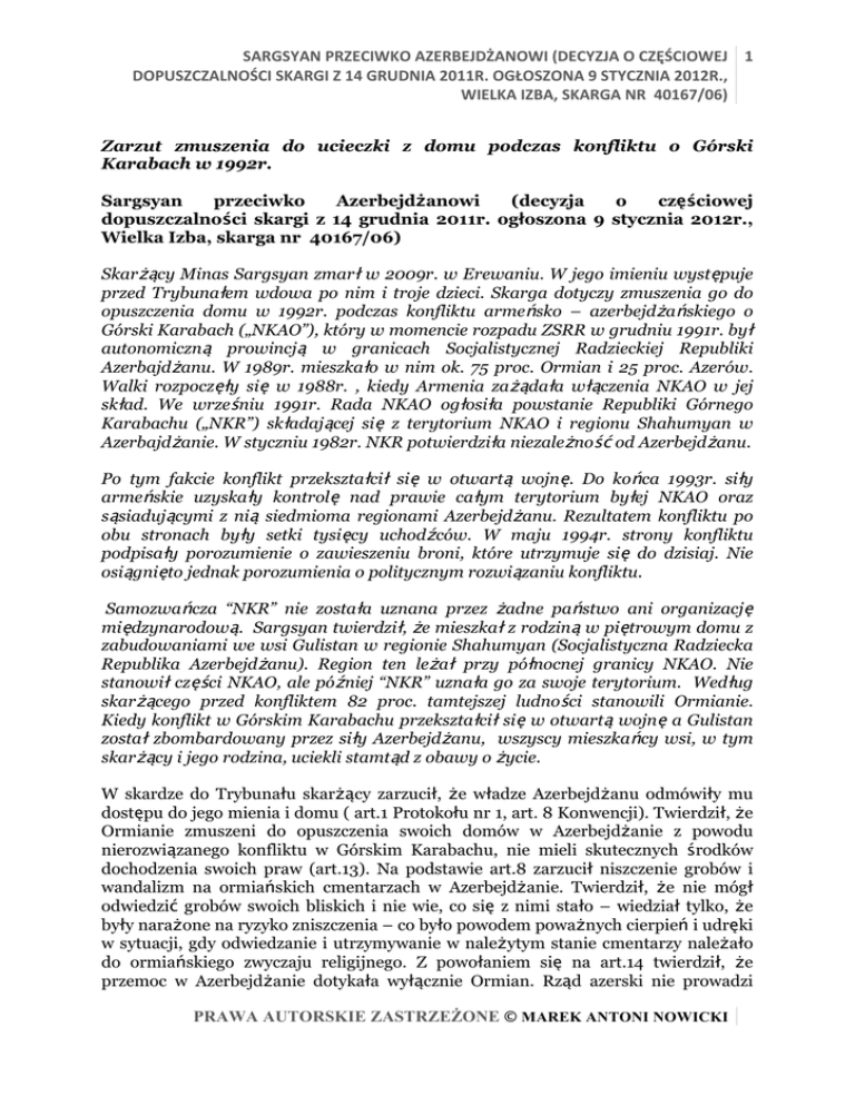 SARGSYAN PRZECIWKO AZERBEJDŻANOWI (DECYZJA O CZĘŚCIOWEJ 1 DOPUSZCZALNOŚCI SKARGI Z 14 GRUDNIA 2011R. OGŁOSZONA 9 STYCZNIA 2012R., WIELKA IZBA, SKARGA NR 40167/06) Zarzut zmuszenia do ucieczki z domu podczas konfliktu o Górski Karabach w 1992r. Sargsyan przeciwko Azerbejdżanowi (decyzja o częściowej dopuszczalności skargi z 14 grudnia 2011r. ogłoszona 9 stycznia 2012r., Wielka Izba, skarga nr 40167/06) Skarżący Minas Sargsyan zmarł w 2009r. w Erewaniu. W jego imieniu występuje przed Trybunałem wdowa po nim i troje dzieci. Skarga dotyczy zmuszenia go do opuszczenia domu w 1992r. podczas konfliktu armeńsko – azerbejdżańskiego o Górski Karabach („NKAO”), który w momencie rozpadu ZSRR w grudniu 1991r. był autonomiczną prowincją w granicach Socjalistycznej Radzieckiej Republiki Azerbajdżanu. W 1989r. mieszkało w nim ok. 75 proc. Ormian i 25 proc. Azerów. Walki rozpoczęły się w 1988r. , kiedy Armenia zażądała włączenia NKAO w jej skład. We wrześniu 1991r. Rada NKAO ogłosiła powstanie Republiki Górnego Karabachu („NKR”) składającej się z terytorium NKAO i regionu Shahumyan w Azerbajdżanie. W styczniu 1982r. NKR potwierdziła niezależność od Azerbejdżanu. Po tym fakcie konflikt przekształcił się w otwartą wojnę. Do końca 1993r. siły armeńskie uzyskały kontrolę nad prawie całym terytorium byłej NKAO oraz sąsiadującymi z nią siedmioma regionami Azerbejdżanu. Rezultatem konfliktu po obu stronach były setki tysięcy uchodźców. W maju 1994r. strony konfliktu podpisały porozumienie o zawieszeniu broni, które utrzymuje się do dzisiaj. Nie osiągnięto jednak porozumienia o politycznym rozwiązaniu konfliktu. Samozwańcza “NKR” nie została uznana przez żadne państwo ani organizację międzynarodową. Sargsyan twierdził, że mieszkał z rodziną w piętrowym domu z zabudowaniami we wsi Gulistan w regionie Shahumyan (Socjalistyczna Radziecka Republika Azerbejdżanu). Region ten leżał przy północnej granicy NKAO. Nie stanowił części NKAO, ale później “NKR” uznała go za swoje terytorium. Według skarżącego przed konfliktem 82 proc. tamtejszej ludności stanowili Ormianie. Kiedy konflikt w Górskim Karabachu przekształcił się w otwartą wojnę a Gulistan został zbombardowany przez siły Azerbejdżanu, wszyscy mieszkańcy wsi, w tym skarżący i jego rodzina, uciekli stamtąd z obawy o życie. W skardze do Trybunału skarżący zarzucił, że władze Azerbejdżanu odmówiły mu dostępu do jego mienia i domu ( art.1 Protokołu nr 1, art. 8 Konwencji). Twierdził, że Ormianie zmuszeni do opuszczenia swoich domów w Azerbejdżanie z powodu nierozwiązanego konfliktu w Górskim Karabachu, nie mieli skutecznych środków dochodzenia swoich praw (art.13). Na podstawie art.8 zarzucił niszczenie grobów i wandalizm na ormiańskich cmentarzach w Azerbejdżanie. Twierdził, że nie mógł odwiedzić grobów swoich bliskich i nie wie, co się z nimi stało – wiedział tylko, że były narażone na ryzyko zniszczenia – co było powodem poważnych cierpień i udręki w sytuacji, gdy odwiedzanie i utrzymywanie w należytym stanie cmentarzy należało do ormiańskiego zwyczaju religijnego. Z powołaniem się na art.14 twierdził, że przemoc w Azerbejdżanie dotykała wyłącznie Ormian. Rząd azerski nie prowadzi PRAWA AUTORSKIE ZASTRZEŻONE © MAREK ANTONI NOWICKI 2 SARGSYAN PRZECIWKO AZERBEJDŻANOWI (DECYZJA O CZĘŚCIOWEJ DOPUSZCZALNOŚCI SKARGI Z 14 GRUDNIA 2011R. OGŁOSZONA 9 STYCZNIA 2012R., WIELKA IZBA, SKARGA NR 40167/06) śledztw w takich sprawach ani nie oferował żadnej rekompensaty za nielegalne zajmowanie ich mienia i niszczenie cmentarzy. Trybunał musiał w pierwszej kolejności zająć się zagadnieniami wstępnymi zrodzonymi na tle tych zarzutów. Czy należały one do jurysdykcji Azerbejdżanu, który był odpowiedzialny za zarzucone sytuacje? Trybunał zauważył, że państwo to ratyfikowało Konwencję ze skutkiem obejmującym całość jego terytorium. Wraz z ratyfikacją złożyło jednak deklarację. Powołując się na nią rząd twierdził, że jego odpowiedzialność na podstawie art.1 Konwencji wchodziła w grę wyłącznie w odniesieniu do terytoriów kontrolowanych przez Azerbejdżan. Spór dotyczył kwestii, czy wieś skarżącego leżała na “terytoriach okupowanych” w rozumieniu deklaracji. Trybunał uważał jednak, że nie miał potrzeby odpowiedzi w tej fazie na to pytanie, bo odpowiedź na pytanie, czy rząd mógł powoływać się tę deklarację mogła być udzielona z uwzględnieniem innych aspektów sytuacji prawnej. Nie przesądzały one jednak w żaden sposób tego, czy Gulistan rzeczywiście leżał na “terytoriach okupowanych” albo z innych powodów znajdował się poza granicami rzeczywistej kontroli władz Azerbejdżanu. Trybunał rozpatrywał już wcześniej podobne kwestie w decyzji o dopuszczeniu skargi w sprawie Ilaşcu i inni v. Mołdowa i Rosja (decyzja z 4 lipca 2001r.). W tamtej sprawie rząd mołdowski również powoływał się na podobnie sformułowaną deklarację próbując podważyć swoją odpowiedzialność za akty, które nastąpiły na terytorium samozwańczej “Mołdowskiej Republiki Naddniestrza”. Zgodnie z argumentami z tamtej decyzji Trybunał potwierdził, że ani duch ani treść art.56 Konwencji, który przewiduje możliwość rozciągnięcie stosowania Konwencji na terytoria państw – stron inne niż metropolitalne, nie pozwala na interpretację ograniczającą zakres pojęcia “jurysdykcja” w rozumieniu art.1 jedynie do części ich terytorium. Trybunał uznał również za nieważne ograniczenia ratione loci zawarte w deklaracjach na podstawie art.25 i 46 Konwencji o wyrażeniu zgody na korzystanie z prawa do skargi indywidualnej oraz na jurysdykcję starego Trybunału. Deklaracja rządu złożona przy ratyfikacji nie mogła więc ograniczyć terytorialnego stosowania Konwencji do niektórych tylko części uznanego prze