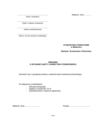 .................................................... Malbork, dnia ............. (Imię i nazwisko) .................................................... (Data i miejsce urodzenia) .................................................... (Adres zameldowania) .................................................... (Seria i numer dowodu osobistego) STAROSTWO POWIATOWE w Malborku Wydział Środowiska i Rolnictwa WNIOSEK O WYDANIE KARTY ŁOWIECTWA PODWODNEGO Zwracam się z uprzejmą prośbą o wydanie karty łowiectwa podwodnego. W załączeniu przedkładam: - Aktualną fotografię, - Opłatę w wysokości 10 zł, - Zaświadczenie o zdanym egzaminie. Malbork, dnia ........................... Podpis ...................................... - verte - Oświadczam, Ŝe zostałem poinformowany(a) o przetwarzaniu danych osobowych przez Wydział Środowiska i Rolnictwa Starostwa Powiatowego w Malborku, PI. Słowiański 17, celem dopełnienia obowiązków, a takŜe o moŜliwości przekazania innym podmiotom – StraŜy Rybackiej. Zapoznałem/am się z prawem wglądu do swoich danych, ich poprawiania oraz sprzeciwu /lub nie/ wobec ich przetwarzania. Podstawa prawna art. 24 ustawy z dnia 29 sierpnia 1997 r. o ochronie danych osobowych (t. j. Dz. U. z 2014 poz. 1182 z późniejszymi zmianami). Data ....................................... Podpis ........................................