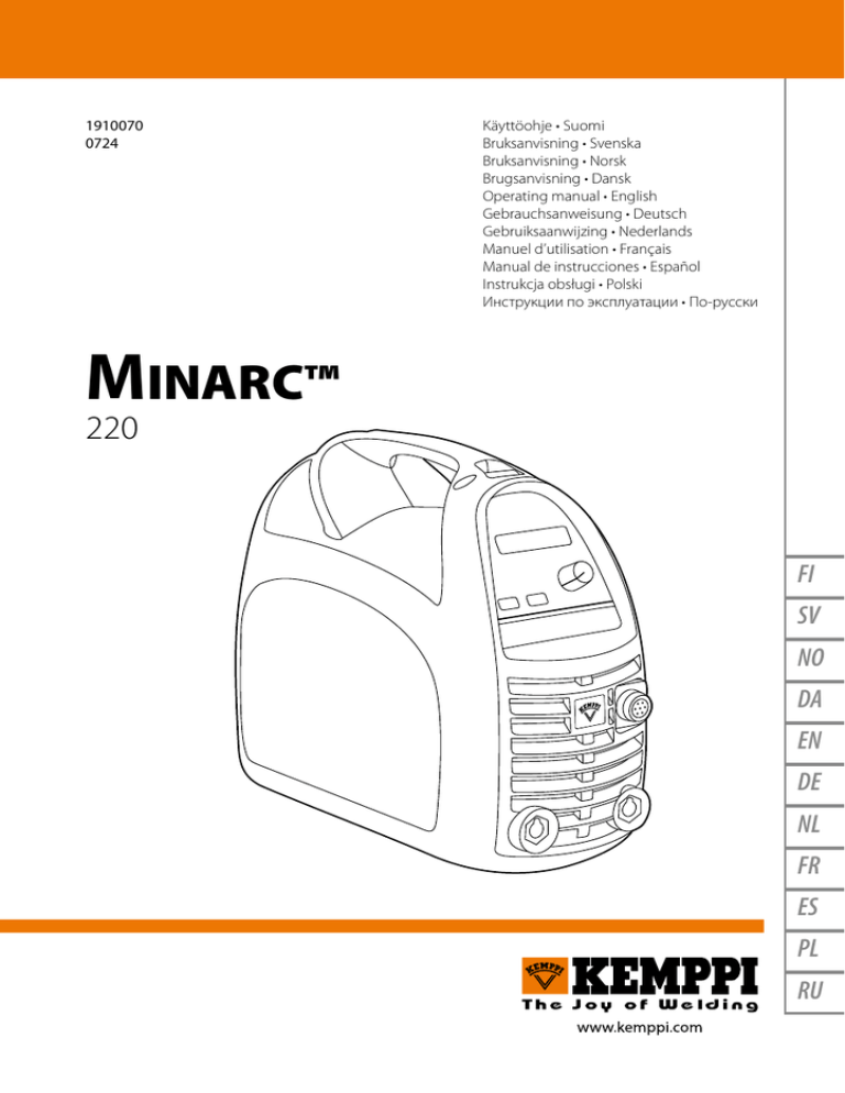 1910070 0724 Käyttöohje • Suomi Bruksanvisning • Svenska Bruksanvisning • Norsk Brugsanvisning • Dansk Operating manual • English Gebrauchsanweisung • Deutsch Gebruiksaanwijzing • Nederlands Manuel d’utilisation • Français Manual de instrucciones • Español Instrukcja obsługi • Polski Инструкции по эксплуатации • По-русски MINARC™ 220 FI SV NO DA EN DE NL FR ES PL RU Instrukcja obsługi Polski PL Minarc™ 220 / © Kemppi Oy / 0724 Minarc™ 220 / © Kemppi Oy / 0724 SPIS TREŚCI 1. 1.1 1.2 1.3 WSTĘP............................................................3 Instrukcje bezpieczeństwa................................................................................. 3 Informacje o produkcie........................................................................................ 7 Metody spawania ................................................................................................... 7 2.Obsługa urządzenia..............................8 2.1 2.2 2.3 2.4 2.5 Przed rozpoczęciem pracy. ................................................................................ 8 Główne elementy urządzenia........................................................................... 8 Podłączanie kabli..................................................................................................... 9 Wybór mocy spawania i elektrod................................................................ 10 Funkcje sterowania i kontrolki. ..................................................................... 11 2.5.1 2.5.2 2.5.3 2.5.4 Zadawanie prądu spawania i zdalne sterowanie............................. 12 Ustawienia spawania metodą MMA..................................................... 12 Funkcje spawania metodą TIG................................................................ 12 Cechy VRD...................................................................................................... 12 5.Konserwacja........................................... 13 5.1 5.2 Codzienna konserwacja ................................................................................... 13 Utylizacja zużytego urządzenia.................................................................... 13 6.Numery do zamówienia ...................... 14 7.Rozwiązywanie problemów.............. 15 8.Dane techniczne.................................... 16 9. Warunki gwarancji.............................. 17 PL WSTĘP Gratulujemy zakupu nowego wyrobu Kemppi Minarc™ 220. Urządzenie Minarc™ 220 jest mocne i wytrzymałe, zaprojektowane specjalnie dla potrzeb profesjonalnego spawania. Jeśli będzie właściwie zainstalowane i używane to powinno się okazać wydajnym i wymagającym minimum konserwacji. UWAGA! Tym symbolem zostały oznaczone fragmenty instrukcji, które należy przeczytać ze szczególną ostrożnością, mając na uwadze bezpieczeństwo pracy i zminimalizowanie ryzyka uszkodzeń ciała. Należy postępować zgodnie ze wszystkimi zawartymi w instrukcji zaleceniami i ostrzeżeniami. 1.1 Instrukcje bezpieczeństwa Urządzenia spawalnicze Kemppi spełniają wymagania międzynarodowych norm bezpieczeństwa. Bezpieczeństwo odgrywa kluczową rolę podczas konstruowania i produkcji sprzętu.Rozwiązania techniczne Kemppi stosowane w zakresie bezpieczeństwa nie mają sobie równych. Należy jednak pamietać, że spawaniu zawsze towarzyszy pewne zagrożenie. Dlatego w trosce o bezpieczeństwo własne i środowiska pracy, należy przestrzegać poniższych instrukcji. Minarc™ 220 / © Kemppi Oy / 0724 1. Korzystanie z indywidualnych środków ochrony • Promieniowanie łuku trwale uszkadza wzrok. Należy odpowiednio osłonić oczy i twarz, przed rozpoczęciem spawania lub obserwacją procesu spawania. Należy również pamiętać o konieczności dostosowania stopnia zaciemnienia filtru w przyłbicy lub masce do prądu spawania. • Promieniowanie i odpryski powodują oparzenia niechronionej skóry. Podczas spawania należy zawsze nosić ochronne rękawice, odzież i obuwie. • Należy zawsze chronić słuch odpowiednimi środkami ochrony wówczas, gdy hałas przekracza dozwolony poziom (np. 85 dB). Ogólne zasady bezpiecznego użytkowania urządzenia • Zachować szczególną ostrożność podczas przenoszenia części rozgrzanych w wyniku spawania. Końcowa część uchwytu spawalniczego, materiał dodatkowy i obrabiany ulegają rozgrzaniu do temperatury wywołującej pożar. • Urządzenia nie nosić na ramieniu, ani nie zawieszać na pasku w trakcie spawania. • Nie wystawiać urządzenia na działanie wysokich temperatur, gdyż może to spowodować uszkodzenie. • Kabel zasilający elektrodę i kabel masy powinny leżeć możliwie blisko siebie na całej długości. Wszelkie pętle powinny być usunięte. Minimalizuje to oddziaływanie pól magnetycznych, które mogą na przykład zakłócać pracę rozrusznika serca. • Nie wolno owijać kabli wokół ciała. PL Minarc™ 220 / © Kemppi Oy / 0724 • Tylko urządzenia oznaczone literą S o bezpiecznym poziomie napięcia biegu jałowego mogą być używane w środowisku niebezpiecznym. Takie warunki pracy występują w pomieszczeniach wilgotnych, gorących i ciasnych, gdzie spawacz szczególnie narażony jest na styczność z materiałami przewodzącymi prąd. Ochrona przed odpryskami i ogniem • Spawanie jest zawsze klasyfikowane jako proces generujący ciepło, dlatego należy przestrzegać odpowiednich przepisów przeciwpożarowych. • Należy pamiętać, że iskry mogą wywołać pożar nawet kilka godzin po zakończeniu spawania. • Należy chronić środowisko przed odpryskami spawalniczymi. Usunąć z miejsca pracy materiały i ciecze łatwopalne, oraz dysponować sprzętem przeciwpożarowym znajdującym się w zasięgu ręki. • Specjalne prace takie jak spawanie zbiorników, wiążą się z ryzykiem powstania pożaru lub wybuchu. • Należy uważać aby snop iskier, albo odpry