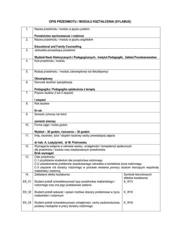 OPIS PRZEDMIOTU / MODUŁU KSZTAŁCENIA (SYLABUS) 1. Nazwa przedmiotu / modułu w języku polskim 2. Poradnictwo wychowawcze i rodzinne Nazwa przedmiotu / modułu w języku angielskim 3. Educational and Family Counselling Jednostka prowadząca przedmiot 4. Wydział Nauk Historycznych i Pedagogicznych, Instytut Pedagogiki, Zakład Poradoznawstwa Kod przedmiotu / modułu 5. Rodzaj przedmiotu / modułu (obowiązkowy lub fakultatywny) 6. Obowiązkowy Kierunek studiów/ specjalizacja 7. Pedagogika / Pedagogika opiekuńcza z terapią Poziom studiów (I lub II stopień) 8. I stopień Rok studiów 9. III rok Semestr (zimowy lub letni) 10. semestr zimowy Forma zajęć i liczba godzin 11. Wykład – 30 godzin, ćwiczenia – 30 godzin Imię, nazwisko, tytuł / stopień naukowy osoby prowadzącej zajęcia dr hab. A. Ładyżyński, dr M. Piotrowska Wymagania wstępne w zakresie wiedzy, umiejętności i kompetencji społecznych dla przedmiotu / modułu oraz zrealizowanych przedmiotów Brak wymagań 13. Cele przedmiotu: C-1 przybliżenie studentom idei poradnictwa rodzinnego, C-2 uświadomienie problemów współczesnego człowieka w kontekście życia rodzinnego, C-3 ukazanie roli doradcy rodzinnego w procesie niesienia pomocy osobom tworzącym wspólnotę małżeńską i rodzinną. 14. Zakładane efekty kształcenia: Symbole kierunkowych efektów kształcenia: EK_01 Student potrafi scharakteryzować typy poradnictwa małżeńskiego i K_W13 rodzinnego oraz zna jego podstawowe zadania 12. EK_02 Student potrafi wskazać i opisać możliwe obszary problemowe w życiu małżeńskim i rodzinnym K_W10 EK_03 Student potrafi scharakteryzować umiejętności, cechy osobowościowe, postawy niezbędne w pracy doradcy rodzinnego K_W16 EK_04 Student potrafi analizować różnorodne sytuacje problemowe występujące w obrębie życia rodzinnego K_U17 EK_05 Student potrafi formułować i prezentować własne propozycje udzielania pomocy w obrębie małżeństwa i rodziny K_U17 EK_06 Student jest świadomy znaczenia i roli poradnictwa w życiu małżeńskim i rodzinnym oraz potrzeby niesienia pomocy zarówno całym rodzinom, jak i poszczególnym jej członkom K_K02 EK_07 Student wykazuje wrażliwość wobec problemów pojawiających się w życiu małżeńskim i rodzinnym K_K03 EK_08 Student postępuje zgodnie z zasadami etyki doradcy rodzinnego K_K05 15. 16. 17. Treści programowe: Rozwój poradnictwa rodzinnego. Potrzeba poradnictwa rodzinnego we współczesności, rola poradnictwa w życiu małżeńskim i rodzinnym. Typy poradnictwa małżeńskiego i rodzinnego. Zadania poradnictwa. Doradca rodzinny w wybranych koncepcjach teoretycznych i w praktyce. Kształtowanie umiejętności interpersonalnych niezbędnych w pracy doradcy, cechy i postawy doradcy wspierające rozwój wspomaganego (klienta). Praca z parą. Trudności młodych ludzi w podejmowaniu decyzji o związku. Małżonkowie w konflikcie. Podstawy terapii małżeństw. Poradnictwo wobec alternatywnych form dla życia małżeńsko-rodzinnego. Rozwód w rodzinie i jego konsekwencje. Poradnictwo rozwodowe. Edukacja i poradnictwo seksualne w domu i w szkole. Rola matki i ojca w wychowaniu i rozwoju dziecka. Nowa matka, nowy ojciec – zmiana układu sił we współczesnych rodzinach. Pomoc rodzinie w przeżywaniu straty i żałoby. Istota systemowej terapii rodzin. Zalecana literatura (podręczniki) G. Corey, Teoria i praktyka poradnictwa i terapii, Poznań 2005. H. Goldenberg, I. Goldenberg, Terapia rodzin, Kraków 2006. I. Namysłowska, Terapia rodzin, Warszawa 2000. V. Satir, Tu powstaje człowiek, Gdańsk 1998. Forma zaliczenia poszczególnych komponentów przedmiotu / modułu, sposób sprawdzenia osiągnięcia zamierzonych efektów kształcenia: wykład: egzamin K_W13 K_W10 K_W16 K_U17 K_K02 K_K03 K_K05 ćwiczenia: kolokwium zaliczeniowe na ocenę K_W13 K_U17 K_K02 K_K03 Kryteria oceny: - ocena bardzo dobra- student ma ugruntowaną wiedzę teoretyczną w obszarze pedagogiki rodziny i teorii poradnictwa. Umiejętnie wykorzystuje wiedzę do rozwiązywania sytuacji problemowych, potrafi refleksyjnie analizować potrzeby rodziny i dostrzega wymagania dotyczące własnej roli doradcy. Identyfikuje problemy w rodzinie na podstawie samodzielnie poszukiwanych informacji w literaturze. Trafnie dostrzega problemy i wymagania w zakresie poradnictwa rodzinnego, wykazuje się dużą wrażliwością na kwestie etyczne, rozumie znaczenie poradnictwa rodzinnego w funkcjonowaniu rodzin. - ocena dobra- student ma dobrą wiedzę teoretyczną w obszarze pedagogiki rodziny i teorii poradnictwa. Poprawnie wykorzystuje wiedzę do rozwiązywania sytuacji problemowych, potrafi refleksyjnie analizować potrzeby rodziny i dostrzega wymagania dotyczące własnej roli doradcy. Identyfikuje problemy w rodzinie na podstawie samodzielnie poszukiwanych informacji w literaturze. Dostrzega elementarne problemy i wymagania w zakresie poradnictwa rodzinnego, wykazuje się wrażliwością na kwestie etyczne. - ocena dostateczna- student ma podstawową wiedzę teoretyczną w obszarze pedagogiki rodziny i teorii poradnictwa. Ma trudności z wykorzystywaniem wiedzy do rozwiązywania sytuacji problemowych, dostrzega elementarne wymagania dotyczące własnej roli doradcy. Nie identyfikuje problemów w rodzinie na podstawie samodzielnie poszukiwanych informacji w literaturze. Dostrzega elementarne problemy i wymagania w zakresie poradnictwa rodzinnego, wykazuje się wrażliwością na kwestie etyczne. - ocena niedostateczna: student nie posiada wiedzy teoretycznej na takim poziomie, aby umiejętnie identyfikował podstawowe problemy rodziny i zadań poradnictwa rodzinnego. Nie angażuje się w zdobywanie wiedzy i próby jej zastosowania w sytuacjach problemowych. Nie potrafi samodzielnie przedstawiać propozycji udzielania pomocy i wsparcia w indywidualnych przypadkach. 18. Język wykładowy 19. Polski Obciążenie pracą studenta Forma aktywności studenta Godziny zajęć (według planu studiów)