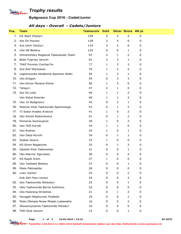 Trophy results Bydgoszcz Cup 2016 - Cadet/Junior All days - Overall - Cadets/Juniors Pos. Team Teamscore Gold Silver Bronz 4th pl. 1. KS Start Olsztyn 159 5 2 4 0 2. Azs Os Poznan 139 3 4 6 0 3. Azs Uwm Olsztyn 134 4 2 6 0 4. Uks G8 Bielany 125 6 0 1 0 5. Khmelnitskiy Regional Taekwondo Team 97 4 1 2 0 6. Biale Tygrysy Jarocin 91 3 3 1 0 7. TKKF Promyk Ciechan?w 77 1 3 3 0 8. Azs-Awf Warszawa 70 1 2 5 0 9. Legionowska Akademia Sportow Walki 55 1 3 1 0 10. Uks Dragon 54 0 3 3 0 11. Uks Koryo Mszana Dolna 50 1 3 0 0 12. Tangun 47 2 1 0 0 13. Azs Os Lodz 46 1 1 2 0 Uks Sokol Koscian 46 1 1 2 0 15. Uks 10 Bydgoszcz 45 0 2 1 0 16. Nidzicki Klub Taekwondo Sportowego 43 0 1 2 0 17. TJ Sokol Hradec Kralove 41 1 0 2 0 18. Uks Smoki Rakoniewice 41 0 1 2 0 19. Pomorze Swinoujscie 39 1 0 2 0 20. Uks TKD Kornik 34 1 1 0 0 21. Uks Andros 34 1 0 1 0 22. Uks Oaza Kornik 34 0 1 1 0 23. Szakal Jezyce 33 1 0 0 0 24. KS Grom Bogatynia 33 0 1 2 0 25. Opolski Klub Taekwondo 31 0 0 1 0 26. Uks Warrior Zgorzelec 30 0 0 4 0 27. KS Rapid Srem 27 1 0 0 0 28. Uks Taebaek Bielany 27 0 0 1 0 29. Muks Pietnastka 26 0 0 0 0 30. Luks 'kantor' 24 0 0 2 0 Kuk-Son Paw Lowice 24 0 0 2 0 32. Uks Taekwondo Wolsztyn 23 0 0 1 0 33. Ulks Taekwondo Borne Sulinowo 22 0 0 0 0 34. Uks Hwarang Września 21 0 1 2 0 35. Huragan Międzyrzec Podlaski 19 0 0 1 0 36. Muks Olimpia Nowe Miasto Lubawskie 16 0 0 2 0 37. Stowarzyszenie Taekwondo Parady? 16 0 0 0 0 38. TKD Klub Jarocin 15 0 0 1 0 Page 1 of 2 10-04-2016 / 14:10 KP OZTO TaekoPlan 2.04.0213 (c) 2002-2015 SenSoft Automation Alphen aan den Rijn, Netherlands (www.taekoplan.nl) Trophy results Bydgoszcz Cup 2016 - Cadet/Junior All days - Overall - Cadets/Juniors Pos. Team Teamscore Gold Uks Bursztyn Gdańsk Silver Bronz 4th pl. 15 0 0 1 0 40. Kętrzyński Klub Taekwondo ,,tygrys' 14 0 0 2 0 41. Tiger Team 14 0 0 0 0 42. Taifun E.V 13 0 0 1 0 13 0 0 1 0 12 0 2 0 0 12 0 0 0 0 46. K.O.Zak Team 7 0 0 1 0 47. Budokwai / Taekwondo Team Turku 6 0 0 0 0 Uks Taekwondo Pleszew 6 0 0 0 0 Uks T.K.D. Hańcza Suwałki 6 0 0 0 0 50. Ku Azs Pwsip Łomża 4 0 0 0 0 Gold-Belt Club 4 0 0 0 0 Klub Sportowy Taekyon 4 0 0 0 0 Uks Victoria Morąg 4 0 0 0 0 Luks Hidori Olecko 4 0 0 0 0 Uks Fighters Mosina 4 0 0 0 0 2 0 0 0 0 Azs Awf Wroclaw 44. Ostrowieckie Stowarzyszenie TKD Olimpijskiego 45. Uks Taekwondo Sroda Wielkopolska 56. Bydgoski Klub Sportowy Centrum Points based on: Gold: 7 Pnts - Silver: 3 Pnts - Bronze: 1 Pnts 4th Place (if not shared 3rd): 2 Participation: 2 Pnts - Win: 2 Pnts - Single: 2 Pnts (...) is a first place as single in category Page 2 of 2 10-04-2016 / 14:10 KP OZTO TaekoPlan 2.04.0213 (c) 2002-2015 SenSoft Automation Alphen aan den Rijn, Netherlands (www.taekoplan.nl)