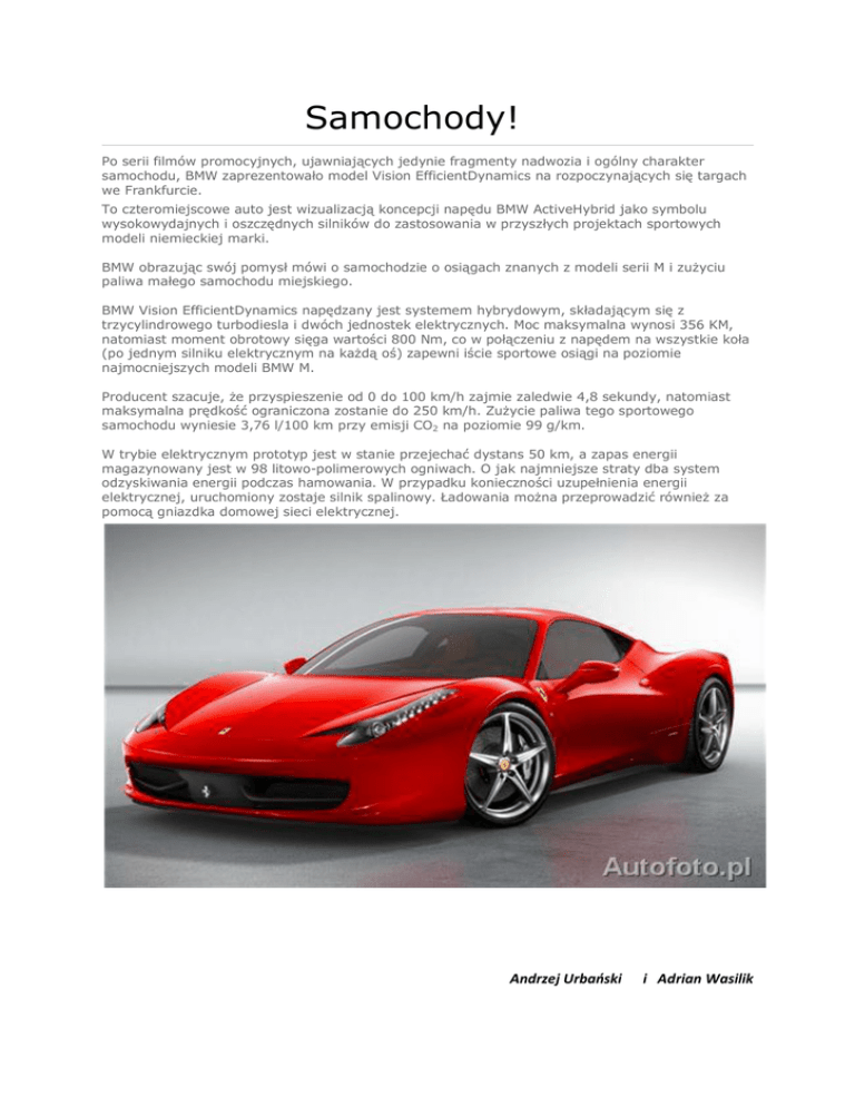 Samochody! Po serii filmów promocyjnych, ujawniających jedynie fragmenty nadwozia i ogólny charakter samochodu, BMW zaprezentowało model Vision EfficientDynamics na rozpoczynających się targach we Frankfurcie. To czteromiejscowe auto jest wizualizacją koncepcji napędu BMW ActiveHybrid jako symbolu wysokowydajnych i oszczędnych silników do zastosowania w przyszłych projektach sportowych modeli niemieckiej marki. BMW obrazując swój pomysł mówi o samochodzie o osiągach znanych z modeli serii M i zużyciu paliwa małego samochodu miejskiego. BMW Vision EfficientDynamics napędzany jest systemem hybrydowym, składającym się z trzycylindrowego turbodiesla i dwóch jednostek elektrycznych. Moc maksymalna wynosi 356 KM, natomiast moment obrotowy sięga wartości 800 Nm, co w połączeniu z napędem na wszystkie koła (po jednym silniku elektrycznym na każdą oś) zapewni iście sportowe osiągi na poziomie najmocniejszych modeli BMW M. Producent szacuje, że przyspieszenie od 0 do 100 km/h zajmie zaledwie 4,8 sekundy, natomiast maksymalna prędkość ograniczona zostanie do 250 km/h. Zużycie paliwa tego sportowego samochodu wyniesie 3,76 l/100 km przy emisji CO2 na poziomie 99 g/km. W trybie elektrycznym prototyp jest w stanie przejechać dystans 50 km, a zapas energii magazynowany jest w 98 litowo-polimerowych ogniwach. O jak najmniejsze straty dba system odzyskiwania energii podczas hamowania. W przypadku konieczności uzupełnienia energii elektrycznej, uruchomiony zostaje silnik spalinowy. Ładowania można przeprowadzić również za pomocą gniazdka domowej sieci elektrycznej. Andrzej Urbański i Adrian Wasilik