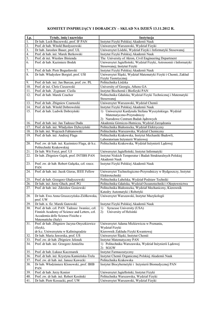 KOMITET INSPIRUJĄCY I DORADCZY – SKŁAD NA DZIEŃ 13.11.2012 R. Lp. 1. 2. 3. 4. 5. 6. Tytuły, imię i nazwisko Dr hab. Lech Baczewski, prof. IF PAN Prof. dr hab. Witold Bardyszewski Dr hab. Jarosław Bauer, prof. UŁ Prof. dr hab. inż. Marek Berkowski Prof. dr inż. Wiesław Binienda Prof. dr hab. Kazimierz Bodek 7. 8. Prof. dr hab. Piotr Bogusławski Dr hab. Władysław Borgieł, prof. UŚl 9. 10. 11. 12. Prof. dr hab. inż. Jan Burcan, prof. zw. PŁ Prof. dr inż. Chris Cieszewski Prof. dr hab. Zygmunt Cieśla Prof. dr hab. Marek Czachor 13. 14. 15. Prof. dr hab. Zbigniew Czarnocki Prof. dr hab. Witold Dobrowolski Prof. dr hab. Ludwik Dobrzyński 16. 17. 18. 19. Prof. dr hab. inż. Jan Tadeusz Duda Prof. dr hab. inż. Władysław Dybczyński Dr hab. inż. Wojciech Fabianowski Prof. dr hab. inż. Andrzej Flaga 20. Prof. zw. dr hab. inż. Kazimierz Flaga, dr h.c. Politechniki Krakowskiej Dr hab. Wit Foryś, prof. UJ Dr hab. Zbigniew Gajek, prof. INTIBS PAN 21. 22. 23. 24. 25. 26. 27. 28. 29. 30. 31. 32. 33. 34. 35. 36. 37. 38. 39. 40. 41. Prof. zw. dr hab. Robert Gałązka, czł. rzecz. PAN Prof. dr hab. inż. Jacek Gieras, IEEE Fellow Instytucja Instytut Fizyki Polskiej Akademii Nauk Uniwersytet Warszawski, Wydział Fizyki Uniwersytet Łódzki, Wydział Fizyki i Informatyki Stosowanej Instytut Fizyki Polskiej Akademii Nauk The University of Akron, Civil Engineering Department Uniwersytet Jagielloński, Wydział Fizyki, Astronomii i Informatyki Stosowanej; Instytut Fizyki Instytut Fizyki Polskiej Akademii Nauk Uniwersytet Śląski, Wydział Matematyki Fizyki i Chemii, Zakład Fizyki Teoretycznej Politechnika Łódzka University of Georgia, Athens GA Instytut Biochemii i Biofizyki PAN Politechnika Gdańska, Wydział Fizyki Technicznej i Matematyki Stosowanej Uniwersytet Warszawski, Wydział Chemii Instytut Fizyki Polskiej Akademii Nauk 1) Uniwersytet Kardynała Stefana Wyszyńskiego. Wydział Matematyczno-Przyrodniczy 2) Narodowe Centrum Badań Jądrowych Akademia Górniczo-Hutnicza, Wydział Zarządzania Politechnika Białostocka, Wydział Elektryczny Politechnika Warszawska, Wydział Chemiczny Politechnika Krakowska, Instytut Mechaniki Budowli, Laboratorium Inżynierii Wiatrowej Politechnika Krakowska, Wydział Inżynierii Lądowej Uniwersytet Jagielloński, Instytut Informatyki Instytut Niskich Temperatur i Badań Strukturalnych Polskiej Akademii Nauk Instytut Fizyki Polskiej Akademii Nauk Uniwersytet Technologiczno-Przyrodniczy w Bydgoszczy, Instytut Elektrotechniki Prof. dr hab. Grzegorz Gładyszewski Politechnika Lubelska, Wydział Podstaw Techniki Dr hab. inż. Jerzy Głuch, prof. PG Politechnika Gdańska, Wydział Oceanotechniki i Okrętownictwa Prof. dr hab. inż. Zdzisław Gosiewski Politechnika Białostocka, Wydział Mechaniczny, Kierownik Katedry Automatyki i Robotyki Dr hab. Ewa Anna Gruszczyńska-Ziółkowska, Uniwersytet Warszawski, Instytut Muzykologii prof. UW Dr hab. n. fiz. Marek Gutowski Instytut Fizyki Polskiej Akademii Nauk Prof. dr hab. czł. PAN Tadeusz Iwaniec, czł. 1) Syracuse University (USA) Finnish Academy of Science and Letters, czł. 2) University of Helsinki Accademia delle Scienze Fisiche e Matematiche (Italy) Prof. dr hab. Zbigniew Jacyna-Onyszkiewicz Uniwersytet Adama Mickiewicza w Poznaniu, (fizyk), Wydział Fizyki dr h.c. Uniwersytetu w Kaliningradzie Kierownik Zakładu Fizyki Kwantowej Dr hab. Maria Jaworska, prof. UŚ Uniwersytet Śląski, Instytut Chemii Prof. zw. dr hab. Zbigniew Jelonek Instytut Matematyczny PAN Prof. dr hab. inż. Grzegorz Jemielita 1) Politechnika Warszawska, Wydział Inżynierii Lądowej 2) SGGW Prof. dr hab. Łukasz Kaczmarek Instytut Farmaceutyczny Prof. dr hab. inż. Krystyna Kamieńska-Trela Instytut Chemii Organicznej Polskiej Akademii Nauk Prof. zw. dr hab. inż. Janusz Kawecki Politechnika Krakowska Dr hab. Włodzimierz Klonowski, prof. IBIB Instytut Biocybernetyki i Inżynierii Biomedycznej PAN PAN Prof. dr hab. Jerzy Konior Uniwersytet Jagielloński, Instytut Fizyki Prof. zw. dr hab. inż. Robert Kosiński Politechnika Warszawska, Wydział Fizyki Dr hab. Piotr Kossacki, prof. UW Uniwersytet Warszawski, Wydział Fizyki 42. 43. Prof. dr hab. dr h.c. Tadeusz Marek Krygowski Dr hab. Tomasz Krzysztoń 44. Prof. nadzw. dr hab. Romuald Lemański 45. 46. 47. Dr hab. inż. Marek Łagoda prof. IBDiM, prof. PL Dr hab. Andrzej Łusakowski prof. IF PAN Prof. dr hab. inż. Jan Maksymiuk 48. Prof. dr hab. Edward Malec 49. Prof. dr hab. inż. Piotr Małoszewski 50. 51. 52. 53. 54. 55. 56. 57. 58. 59. 60. 61. 62. 63. 64. 65. 66. 67. 68. 69. 70. 71. 72. 73. 74. 75. 76. 77. 78. 79. 80. 81. 82. 83. Prof. dr hab. Janina Marciak - Kozłowska Prof. dr hab. Maciej Maśka Dr hab. Mariusz Michta, prof. UO Prof. dr hab. inż. Janina Milewska-Duda Prof. dr hab. inż. arch. Anna Mitkowska Dr hab. Grzegorz Musiał, prof. UAM, prof. WSKSiM Prof. zw. dr hab. Józef Medard Namysłowski Dr hab. inż. Andrzej Niemunis t Prof. zw. dr hab. inż. Jan Obrębski Dr hab. Adam Obtułowicz Prof. zw. dr hab. Andrzej Oleś dr h.c. Akademii Górniczo-Hutniczej Prof. dr hab. Andrzej. M. Oleś Uniwersytet Warszawski, Wydział Chemii Instytut Niskich Temperatur i Badań Strukturalnych Polskiej Akademii Nauk Instytut Niskich Temperatur i Badań Strukturalnych Polskiej Akademii Nauk Instytut Badawczy Dróg i Mostów, Politechnika Lubelska, Wydział Budownictwa i Architektury Instytut Fizyki Polskiej Akademii Nauk Politechnika Warszawska, Wydział Elektryczny, Instytut Elektroenergetyki Uniwersytet Jagielloński, , Wydział Fizyki, Astronomii i Informatyki Stosowanej, Instytut Fizyki Helmholtz Zentrum München Deutsches Forschungszentrum für Gesundheit und Umwelt GmbH Instytut Technologii Elektronowej Uniwersytet Śląski, Instytut Fizyki Uniwersytet Opolski, Instytut Matematyki i Informatyki Akademia Górniczo-Hutnicza, Wydział Energetyki i Paliw Politechnika Krakowska, Wydział Architektury Uniwersytet im. A. Mickiewicza, Wydział Fizyki, Zakład Fizyki Komput