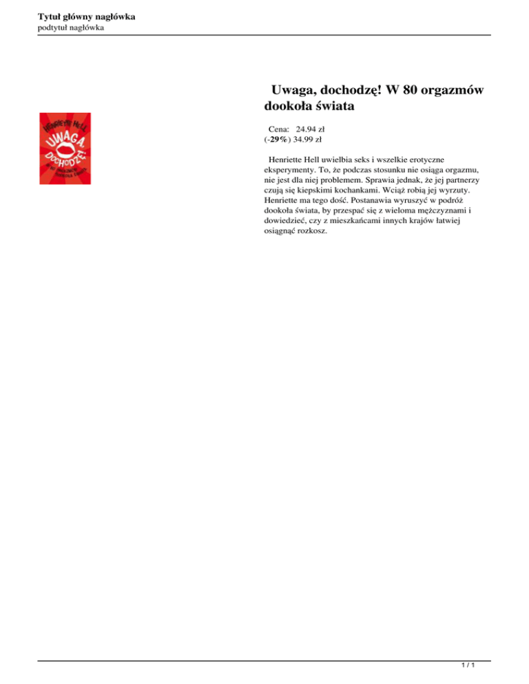 Tytuł główny nagłówka podtytuł nagłówka Uwaga, dochodzę! W 80 orgazmów dookoła świata Cena: 24.94 zł (-29%) 34.99 zł Henriette Hell uwielbia seks i wszelkie erotyczne eksperymenty. To, że podczas stosunku nie osiąga orgazmu, nie jest dla niej problemem. Sprawia jednak, że jej partnerzy czują się kiepskimi kochankami. Wciąż robią jej wyrzuty. Henriette ma tego dość. Postanawia wyruszyć w podróż dookoła świata, by przespać się z wieloma mężczyznami i dowiedzieć, czy z mieszkańcami innych krajów łatwiej osiągnąć rozkosz. 1/1 Powered by TCPDF (www.tcpdf.org)