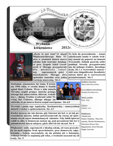 Wydanie kwietniowe 2012r. „Życie to jest teatr”.Z okazji Międzynarodowego Dnia Teatru w ostatnich dniach marca szkolne koło teatralne działające przy Zespole Szkół Licealnych w Morągu przygotowało dla młodzieży szkolnej, zaproszonych gości i mieszkańców Morąga dwa spektakle teatralne oraz jedną wariację muzyczną. Str.2 To było do przewidzenia – temat zakończenia nauki w szkole średniej musiał się pojawić na łamach Trzynastki. Jednak pozwolę sobie pominąć kwestię przygotowania nas do pełnego trudów, dorosłego życia, bo i o wytrwałości nauczycieli oraz kłopotliwości licealistów zawsze mówi się w czerwcowych przemówieniach. Str.3 Redaktor Naczelny: Dokładnie osiemnaście lat temu, 8 kwietnia 1994 roku, w swoim domu w Seattle zginał Kurt Cobain. Wraz z nim umarła Nirvana, zespół grający muzykę grunge, którego był założycielem, liderem, wokalistą i… duszą. Trudno wyobrazić sobie Nirvanę bez Cobaina, dlatego nikogo nie zdziwiło, że po śmierci Kurta zespół rozwiązano. Str.4,5 Marta Julia Ruczyńska Wywiad z panią mgr Agnieszką Kochanowską – nauczycielem historii i wiedzy o społeczeństwie. Str. 6,7 Zdjęcia: Kiedyś (jeszcze nie tak dawno, gdy Internet nie był, w aż tak powszechnym użyciu), ludzie powstrzymywali się raczej od ujawniania swych często domniemanych talentów. Gdy lubili śpiewać robili to albo w domowym zaciszu np. pod prysznicem lub też w jakimkolwiek innym miejscu, gdzie nikt ich nie słyszał. Str 8 Redaktorzy: Większości osób, zapytanych o idealną szkołę, od razu przyszłoby na myśl zupełny brak sprawdzianów, prac domowych, odpytywania… Lekcje zaczynałyby się nie później niż o dziesiątej, wakacje trwały co najmniej pół roku, a weekend zaczynał się od środy. Str. 9 Bogusławska, Anna Pietrzak, Z-ca redaktora naczelnego: Monika Pawlukiewicz Skład i grafika: Piotr Gral Natalia Łoś Natalia Łoś. Hubert Nadolny, Marta Ruczyńska, Monika Pawlukiewicz, Katarzyna Kirsun, Ewa Magda Czerniak Spotkanie z Melpomeną „Życie to jest teatr”.Z okazji Międzynarodowego Dnia Teatru w ostatnich dniach marca szkolne koło teatralne działające przy Zespole Szkół Licealnych w Morągu przygotowało dla młodzieży szkolnej, zaproszonych gości i mieszkańców Morąga dwa spektakle teatralne oraz jedną wariację muzyczną. W wariacji muzycznej zaprezentowano interpretację wiersza Edwarda Stachury pt.” Życie to nie teatr”, w której to udział wzięli uczniowie klas drugich: Teresa Zmaczyńska, Alicja Urban, Piotr Kaczówka i Arkadiusz Królak. W antrakcie można było obejrzeć prezentację multimedialną o historii teatru. Za to dwa spektakle teatralne przygotowali uczniowie klas pierwszych. Pierwszy z nich to”Ogłoszenie”,według scenariusza Pierra Gripari, w którym udział wzięli: Katarzyna Tomczuk, Ewa Oręziak, Anna Pietrzak, Mateusz Matwiejczyk i Marta Romanowska. Ich kostiumy, które nadały wyrazistości komedii ,były miłą niespodzianką dla widzów. Drugi spektakl oparty był również na scenariuszu francuskiego pisarza pt. ”Idiotka.” Na scenie zaprezentowała się Klaudia Przetacka wraz z Kamilem Kaczówką. Następnie mogliśmy wysłuchać recitalu Martyny Kwiatkowskiej, która wykonała trzy utwory muzyczne, w tym jeden własnego autorstwa. Widzowie tego wieczoru mogli nacieszyć uszy muzyką, która była wszechobecna, poruszała duszę od.biorców.. Innymi słowyistna rozkosz dla prawdziwych jej miłośników. W drugiej części wieczoru Z Melpomeną wystąpił aktor STR. 2 Teatru im. S. Jaracza- Cezary Ilczyna, który to zdecydował przedstawić się nam w wybranych tekstach Konstantego Ildefonsa Gałczyńskiego. Zadziwił, zaciekawił i wzbudził w słuchaczach chęć odwiedzenia teatru, do którego serdecznie wszystkich zaprosił na spektakle, w których ma przyjemność grać. Później słodkości i ciepła herbata zachęciły gości do podzielenia się wrażeniami oraz przekazania sobie wzajemnych impresji. Duchem sprawczym i inspiratorką wystąpień artystycznych była Pani Profesor Krystyna Horbacz, która zaraziła swym entuzjazmem młodzież szkolną, pobudziła ją do kreatywnego działania artystycznego. Zgromadzona publiczność gorącymi brawami/a może owacjami/ podziękowała artystom za doznania estetyczne. Kto wie, może Melpomena, mitologiczna postać grecka, patronka tragedii, była tego dnia obecna? W każdym bądź razie teatralny wieczorek można uznać za udany. Anna Pietrzak GAZETKA TRZYNASTKA Kilka słów na temat eksploatowany To było do przewidzenia – temat zakończenia nauki w szkole średniej musiał się pojawić na łamach Trzynastki. Jednak pozwolę sobie pominąć kwestię przygotowania nas do pełnego trudów, dorosłego życia, bo i o wytrwałości nauczycieli oraz kłopotliwości licealistów zawsze mówi się w czerwcowych przemówieniach. Pierwszy września, dzień choć słoneczny i przyjemny, to pełen stresu i nerwów. Bo, nie oszukujmy się, nowa szkoła, nowi ludzie i ta czysta karta, którą by zapełnić, musimy nieźle się natrudzić, aby pokazać na co nas stać – są niezbyt zachęcające. Potem drugi września, trzeci, czwarty, dni wolne, święta i ferie, aż w końcu dziesięć miesięcy mamy już za sobą; rozpoczyna się odliczanie do wakacji, a po dwóch kolejnych znów powracamy do murów szkoły. W trzeciej klasie okazuje się, jak zwykle zresztą, że diabeł nie taki straszny jak go malowali, a o ucieczkach z lekcji w ciepłe dni i o klasowych wycieczkach nieraz będzie się wspominać. Nie da się więc nie zauważyć, że okres nauki w liceum/ technikum to czas, do którego pamięcią powraca się najchętniej. Głównie ze względu na liczne przyjaźnie, często zawierane zupełnie przypadkiem, bo oto koleżanka z kółka teatralnego słucha tej samej muzyki, a kolega z niemieckiego też szczególnie upodobał sobie filmy Tima Burtona. Nie trzeba podkreślać, że takie więzi twor