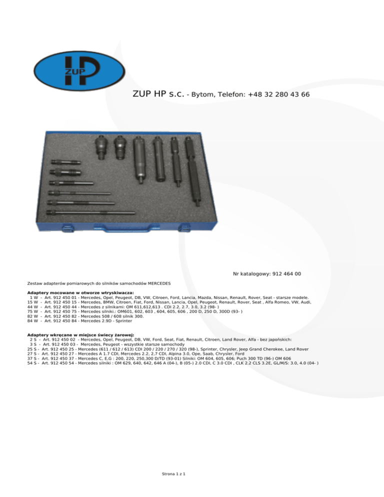 ZUP HP s.c. - Bytom, Telefon: +48 32 280 43 66 Nr katalogowy: 912 464 00 Zestaw adapterów pomiarowych do silników samochodów MERCEDES Adaptery mocowane w otworze wtryskiwacza: 1 W - Art. 912 450 01 - Mercedes, Opel, Peugeot, DB, VW, Citroen, Ford, Lancia, Mazda, Nissan, Renault, Rover, Seat - starsze modele. 15 W - Art. 912 450 15 - Mercedes, BMW, Citroen, Fiat, Ford, Nissan, Lancia, Opel, Peugeot, Renault, Rover, Seat , Alfa Romeo, VW, Audi, 44 W - Art. 912 450 44 - Mercedes z silnikami: OM 611,612,613 . CDI 2.2, 2.7, 3.0, 3.2 (98- ) 75 W - Art. 912 450 75 - Mercedes silniki.: OM601, 602, 603 , 604, 605, 606 , 200 D, 250 D, 300D (93- ) 82 W - Art. 912 450 82 - Mercedes 508 / 608 silnik 300. 84 W - Art. 912 450 84 - Mercedes 2.9D - Sprinter Adaptery wkręcane w miejsce świecy żarowej: 2 S - Art. 912 450 02 - Mercedes, Opel, Peugeot, DB, VW, Ford, Seat, Fiat, Renault, Citroen, Land Rover, Alfa - bez japońskich: 3 S - Art. 912 450 03 - Mercedes, Peugeot - wszystkie starsze samochody 25 S - Art. 912 450 25 - Mercedes (611 / 612 / 613) CDI 200 / 220 / 270 / 320 (98-), Sprinter, Chrysler, Jeep Grand Cherokee, Land Rover 27 S - Art. 912 450 27 - Mercedes A 1.7 CDI, Mercedes 2.2, 2,7 CDI, Alpina 3.0, Ope, Saab, Chrysler, Ford 37 S - Art. 912 450 37 - Mercedes C, E,G : 200, 220, 250,300 D/TD (93-01) Silniki: OM 604, 605, 606; Puch 300 TD (96-) OM 606 54 S - Art. 912 450 54 - Mercedes silniki : OM 629, 640, 642, 646 A (04-), B (05-) 2.0 CDI, C 3.0 CDI , CLK 2.2 CLS 3.2E, GL/M/S: 3.0, 4.0 (04- ) Strona 1 z 1