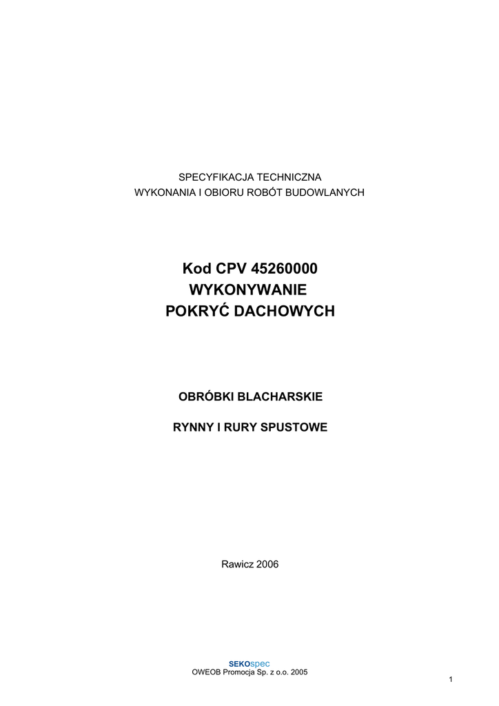 SPECYFIKACJA TECHNICZNA WYKONANIA I OBIORU ROBÓT BUDOWLANYCH Kod CPV 45260000 WYKONYWANIE POKRYĆ DACHOWYCH OBRÓBKI BLACHARSKIE RYNNY I RURY SPUSTOWE Rawicz 2006 SEKOspec OWEOB Promocja Sp. z o.o. 2005 1 SPIS TREŚCI 1. WSTĘP .............................................................................................................. 3 1.1. Przedmiot ST ................................................................................................. 3 1.2. Zakres stosowania ST .................................................................................... 3 1.3. Zakres robót objętych ST ............................................................................... 3 1.4. Podstawowe określenia .................................................................................. 3 1.5. Ogólne wymagania dotyczące robót .............................................................. 3 2. MATERIAŁY ....................................................................................................... 3 3. SPRZĘT ............................................................................................................. 4 4. TRANSPORT ..................................................................................................... 4 5. WYKONANIE ROBÓT ....................................................................................... 4 6. KONTROLA JAKOŚCI ROBÓT ......................................................................... 5 7. OBMIAR ROBÓT ............................................................................................... 5 8. ODBIÓR ROBÓT ............................................................................................... 5 9. PODSTAWA PŁATNOŚCI ................................................................................. 6 10. PRZEPISY ZWIĄZANE ................................................................................... 7 Najważniejsze oznaczenia i skróty: ST – Specyfikacja Techniczna SST – Szczegółowa Specyfikacja Techniczna ITB – Instytut Techniki Budowlanej Jednostka autorska, opracowanie edytorskie i rozpowszechnianie: Ośrodek Wdrożeń Ekonomiczno-Organizacyjnych Budownictwa „Promocja” Sp. z o.o. 02-548 Warszawa, ul. Grażyny 15, tel. (22) 440-84-00, fax (22) 440-84-01 www.sekocenbud.pl e-mail: [email protected] ISBN 83-89756-61-7 Copyright by OWEOB PROMOCJA Sp. z o.o. Warszawa, 2005 Wszelkie prawa zastrzeżone! Wykorzystanie treści niniejszej specyfikacji technicznej dozwolone jest wyłącznie do przygotowania dokumentacji budowlanej. Kopiowanie, przedrukowywanie i rozpowszechnianie całości lub fragmentów niniejszej publikacji w celach komercyjnych bez pisemnej zgody wydawcy zabronione. SEKOspec OWEOB Promocja Sp. z o.o. 2005 2 1. WSTĘP 1.1. Przedmiot ST Przedmiotem niniejszej specyfikacji technicznej (ST) są wymagania dotyczące wykonania i odbioru obróbek blacharskich oraz rynien i rur spustowych. 1.2. Zakres stosowania ST Specyfikacja techniczna (ST) stanowi obowiązującą podstawę opracowania szczegółowej specyfikacji technicznej (SST) i jest stosowana jako dokument przetargowy i kontraktowy przy zlecaniu i realizacji robót wymienionych w pkt. 1.1. 1.3. Zakres robót objętych ST Roboty, których dotyczy specyfikacja, obejmują wszystkie czynności umożliwiające i mające na celu wykonanie obróbek blacharskich, rynien i rur spustowych oraz elementów wystających ponad dach budynku: 1.4. Określenia podstawowe Określenia podane w niniejszej ST są zgodne z obowiązującymi odpowiednimi normami oraz określeniami podanymi w Kod CPV 45000000-7 „Wymagania ogólne” pkt 1.4. 1.5. Ogólne wymagania dotyczące robót Wykonawca robót jest odpowiedzialny za jakość ich wykonania oraz za zgodność z dokumentacją projektową, ST i poleceniami Inspektora nadzoru. Ogólne wymagania dotyczące robót podano w ST Kod CPV 45000000-7 „Wymagania ogólne” pkt 1.5. 2. MATERIAŁY 2.1. Ogólne wymagania dotyczące materiałów, ich pozyskiwania i składowania podano w ST Kod CPV 45000000-7 „Wymagania ogólne” pkt 2 Ponadto materiały stosowane do wykonywania pokryć dachowych powinny mieć m.in.: – Aprobaty Techniczne lub być produkowane zgodnie z obowiązującymi normami, – Certyfikat lub Deklarację Zgodności z Aprobatą Techniczną lub z PN, – Certyfikat na znak bezpieczeństwa, – Certyfikat zgodności ze zharmonizowaną normą europejską wprowadzoną do zbioru norm polskich, – na opakowaniach powinien znajdować się termin przydatności do stosowania. Sposób transportu i składowania powinien być zgodny z warunkami i wymaganiami podanymi przez producenta. Wykonawca obowiązany jest posiadać na budowie pełną dokumentację dotyczącą składowanych na budowie materiałów przeznaczonych do wykonania pokryć dachowych. 2.2. Rodzaje materiałów 2.2.1. Wszelkie materiały do wykonania pokryć dachowych powinny odpowiadać wymaganiom zawartym w normach polskich lub aprobatach technicznych ITB dopuszczających dany materiał do powszechnego stosowania w budownictwie. 2.2.2. Blacha stalowa ocynkowana płaska powinna odpowiadać normom PN-61/B-10245 i PN-73/H-92122. Grubość blachy 0,5 mm 2 do 0,55 mm, obustronnie ocynkowane metodą ogniową – równą warstwą cynku (275 g/m ) oraz pokryta warstwą pasywacyjną mającą działanie antykorozyjne i zabezpieczające. 2.2.3. Inne blachy płaskie: Występuje w arkuszach o wym. 1000x2000 mm lub 1250x2000 mm. a) blacha stalowa powlekana powłokami poliestrowymi, grubości 0,5-0,55 mm, arkusze o wym. 1000x2000 mm lub 1250x2000 mm. b) blacha tytanowo-cynkowa, grubości 0,5-0,55 mm, arkusze o wym. 1000x2000 mm. c) blacha miedziana, grubości 0,5-0,55 mm, taśma szerokości 670 mm. 2.2.4. Blachy profilowe, grubości 0,5-0,7 mm powlekane, na stronie licowej powłokami poliestrowymi 25 mikrometrów lub 35 mikrometrów, na stronie spodniej powłoką epoksydową 10 mikrometrów. 2.2.5. Rynny i rury spustowe systemowe. 2.2.6. P