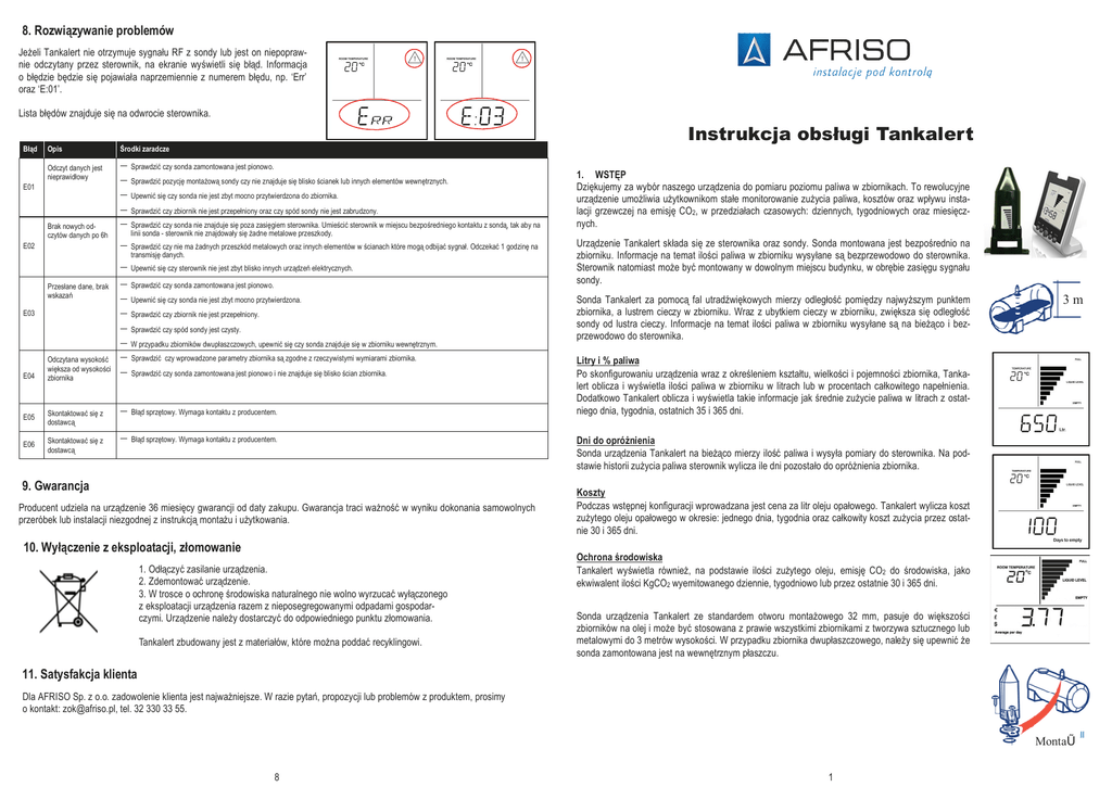 8. Rozwiązywanie problemów Jeżeli Tankalert nie otrzymuje sygnału RF z sondy lub jest on niepoprawnie odczytany przez sterownik, na ekranie wyświetli się błąd. Informacja o błędzie będzie się pojawiała naprzemiennie z numerem błędu, np. ‘Err’ oraz ‘E:01’. Lista błędów znajduje się na odwrocie sterownika. Błąd Opis Odczyt danych jest nieprawidłowy E01 Brak nowych odczytów danych po 6h E02 - Sprawdzić czy sonda zamontowana jest pionowo. - Sprawdzić pozycję montażową sondy czy nie znajduje się blisko ścianek lub innych elementów wewnętrznych. - Upewnić się czy sonda nie jest zbyt mocno przytwierdzona do zbiornika. - Sprawdzić czy zbiornik nie jest przepełniony oraz czy spód sondy nie jest zabrudzony. - Sprawdzić czy sonda nie znajduje się poza zasięgiem sterownika. Umieścić sterownik w miejscu bezpośredniego kontaktu z sondą, tak aby na linii sonda - sterownik nie znajdowały się żadne metalowe przeszkody. - Sprawdzić czy nie ma żadnych przeszkód metalowych oraz innych elementów w ścianach które mogą odbijać sygnał. Odczekać 1 godzinę na transmisję danych. Przesłane dane, brak wskazań E03 E04 Instrukcja obsługi Tankalert Środki zaradcze Odczytana wysokość większa od wysokości zbiornika E05 Skontaktować się z dostawcą E06 Skontaktować się z dostawcą - Upewnić się czy sterownik nie jest zbyt blisko innych urządzeń elektrycznych. - Sprawdzić czy sonda zamontowana jest pionowo. - Upewnić się czy sonda nie jest zbyt mocno przytwierdzona. - Sprawdzić czy zbiornik nie jest przepełniony. - Sprawdzić czy spód sondy jest czysty. - W przypadku zbiorników dwupłaszczowych, upewnić się czy sonda znajduje się w zbiorniku wewnętrznym. - Sprawdzić czy wprowadzone parametry zbiornika są zgodne z rzeczywistymi wymiarami zbiornika. - Sprawdzić czy sonda zamontowana jest pionowo i nie znajduje się blisko ścian zbiornika. - Błąd sprzętowy. Wymaga kontaktu z producentem. - Błąd sprzętowy. Wymaga kontaktu z producentem. 9. Gwarancja Producent udziela na urządzenie 36 miesięcy gwarancji od daty zakupu. Gwarancja traci ważność w wyniku dokonania samowolnych przeróbek lub instalacji niezgodnej z instrukcją montażu i użytkowania. 10. Wyłączenie z eksploatacji, złomowanie 1. Odłączyć zasilanie urządzenia. 2. Zdemontować urządzenie. 3. W trosce o ochronę środowiska naturalnego nie wolno wyrzucać wyłączonego z eksploatacji urządzenia razem z nieposegregowanymi odpadami gospodarczymi. Urządzenie należy dostarczyć do odpowiedniego punktu złomowania. Tankalert zbudowany jest z materiałów, które można poddać recyklingowi. 1. WSTĘP Dziękujemy za wybór naszego urządzenia do pomiaru poziomu paliwa w zbiornikach. To rewolucyjne urządzenie umożliwia użytkownikom stałe monitorowanie zużycia paliwa, kosztów oraz wpływu instalacji grzewczej na emisję CO2, w przedziałach czasowych: dziennych, tygodniowych oraz miesięcznych. Urządzenie Tankalert składa się ze sterownika oraz sondy. Sonda montowana jest bezpośrednio na zbiorniku. Informacje na temat ilości paliwa w zbiorniku wysyłane są bezprzewodowo do sterownika. Sterownik natomiast może być montowany w dowolnym miejscu budynku, w obrębie zasięgu sygnału sondy. Sonda Tankalert za pomocą fal utradźwiękowych mierzy odległość pomiędzy najwyższym punktem zbiornika, a lustrem cieczy w zbiorniku. Wraz z ubytkiem cieczy w zbiorniku, zwiększa się odległość sondy od lustra cieczy. Informacje na temat ilości paliwa w zbiorniku wysyłane są na bieżąco i bezprzewodowo do sterownika. 3m Litry i % paliwa Po skonfigurowaniu urządzenia wraz z określeniem kształtu, wielkości i pojemności zbiornika, Tankalert oblicza i wyświetla ilości paliwa w zbiorniku w litrach lub w procentach całkowitego napełnienia. Dodatkowo Tankalert oblicza i wyświetla takie informacje jak średnie zużycie paliwa w litrach z ostatniego dnia, tygodnia, ostatnich 35 i 365 dni. Dni do opróżnienia Sonda urządzenia Tankalert na bieżąco mierzy ilość paliwa i wysyła pomiary do sterownika. Na podstawie historii zużycia paliwa sterownik wylicza ile dni pozostało do opróżnienia zbiornika. Koszty Podczas wstępnej konfiguracji wprowadzana jest cena za litr oleju opałowego. Tankalert wylicza koszt zużytego oleju opałowego w okresie: jednego dnia, tygodnia oraz całkowity koszt zużycia przez ostatnie 30 i 365 dni. Ochrona środowiska Tankalert wyświetla również, na podstawie ilości zużytego oleju, emisję CO2 do środowiska, jako ekwiwalent ilości KgCO2 wyemitowanego dziennie, tygodniowo lub przez ostatnie 30 i 365 dni. Sonda urządzenia Tankalert ze standardem otworu montażowego 32 mm, pasuje do większości zbiorników na olej i może być stosowana z prawie wszystkimi zbiornikami z tworzywa sztucznego lub metalowymi do 3 metrów wysokości. W przypadku zbiornika dwupłaszczowego, należy się upewnić że sonda zamontowana jest na wewnętrznym płaszczu. 11. Satysfakcja klienta Dla AFRISO Sp. z o.o. zadowolenie klienta jest najważniejsze. W razie pytań, propozycji lub problemów z produktem, prosimy o kontakt: [email protected], tel. 32 330 33 55. Montaż 8 1 2. Tankalert – Elementy i funkcje Pojemność (litry) 5. Tankalert - parametry zbiornika Do wykonania obliczeń ilości paliwa w zbiorniku, sterownik Tankalert wymaga dokładnych wymiarów zbiornika. Występują 3 kluczowe kształty, pokazane w tabeli. W pierwszym kroku, należy wybrać kształt zbiornika, najbardziej zbliżony do rzeczywistego. Urządzenie Tankalert dostarczane jest z wprowadzonymi wartościami fabrycznymi. Wartości te należy wprowadzić w oparciu o własny zbiornik. Wszystkie wymiary posiadają wartość minimalną i maksymalną, zgodnie z danymi z tabeli. Max Wysokość (cm) Szerokość (cm) Min Fabr. Min Fabr. Max Miin Fabr. Max 300 1000 19.999 50 100 300 N/A N/A N/A 300 1000 19.999 Szer. 100 300 50 50 Wys. 300 1000 19.999 50 50 Szer. Wys. 