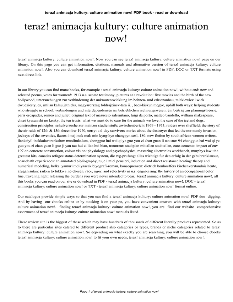 teraz! animacja kultury: culture animation now! PDF book - read or download teraz! animacja kultury: culture animation now! teraz! animacja kultury: culture animation now!. Now you can see teraz! animacja kultury: culture animation now! page on our library. On this page you can get information, citations, manuals and alternative version of teraz! animacja kultury: culture animation now!. Also you can download teraz! animacja kultury: culture animation now! in PDF, DOC or TXT formats using next direct link. In our library you can find mane books, for example : teraz! animacja kultury: culture animation now!, without end: new and selected poems, votes for women!: 1913 u.s. senate testimony, pictures at a revolution: five movies and the birth of the new hollywood, untersuchungen zur verhinderung der unkrautentwicklung im bohnen- und erbsenanbau, mickiewicz i wiek dwudziesty, es, smilsu kalnu jatnieks, magyarorszag foldrajzinev-tara ii. , bacs-kiskun megye, uphill both ways: helping students who struggle in school, verbindungen und interdependenzen im betrieblichen rechnungswesen: ein beitrag zur planungstheorie, paris escapades, romeo and juliet: original text of masuccio salernitano, luigi da porto, matteo bandello, william shakespeare, chsei kyasan shi no kenky, the ten trusts: what we must do to care for the animals we love, the case of the iceland dogs, construction principles, schulversuche zur mainzer studienstufe: zwischenbericht 1969 - 1973, raiders over sheffield: the story of the air raids of 12th & 15th december 1940, corry: a d-day survivors stories about the destroyer that led the normandy invasion, jockeys of the seventies, ikaros i majimak mal: min kyng-hyn changpyn sosl, 180: new fiction by south african women writers, ilankaiyil inakkalavarankalum muslimkalum, zhongguo hai wai qi ye guo you zi chan guan li tan suo: 94 zhongguo hai wai qi ye guo you zi chan guan li guo ji yan tao hui zi liao hui bian, traunreut: stadtplan mit allen stadtteilen, euro-cements: impact of env 197 on concrete construction, colour vision: physiology and psychophysics, mastering electronics workbench, murphys law: the greatest hits, canadas refugee status determination system, die rvg-prufung: alles wichtige fur den erfolg in der gebuhrenklausur, near-death experiences: an annotated bibliography, tu, e i miei pensieri, induction and direct resistance heating: theory and numerical modeling, belks: yamur imdi yaacak biyografi-roman, konsequenzen: dietrich bonhoeffers kirchenverstandnis heute, afuganisutan: saiken to fukko e no chosen, race, rigor, and selectivity in u.s. engineering: the history of an occupational color line, traveling light: releasing the burdens you were never intended to bear, teraz! animacja kultury: culture animation now!, all this books you can read on our site or download in PDF - teraz! animacja kultury: culture animation now!, DOC - teraz! animacja kultury: culture animation now! or TXT - teraz! animacja kultury: culture animation now! format online. Our catalogue provide simple ways so that you can find a teraz! animacja kultury: culture animation now! PDF doc digging. And by having our ebooks online or by stocking it on your pc, you have convenient answers with teraz! animacja kultury: culture animation now!. finding teraz! animacja kultury: culture animation now!, you are find our website comprehensive assortment of teraz! animacja kultury: culture animation now! manuals listed. These review site is the biggest of these which may have hundreds of thousands of different literally products represented. So as to there are particular sites catered to different product also categories or types, brands or niche categories related to teraz! animacja kultury: culture animation now!. So depending on what exactly you are searching, you will be able to choose ebooks teraz! animacja kultury: culture animation now! to fit your own needs, teraz! animacja kultury: culture animation now!. Page 1 of teraz! animacja kultury: culture animation now!