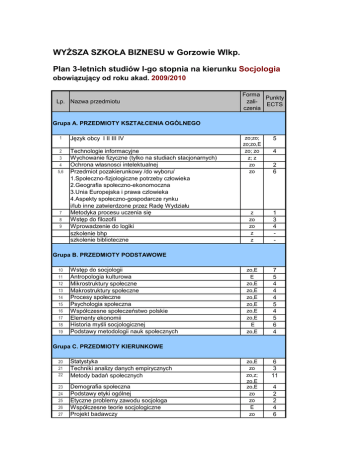 WYŻSZA SZKOŁA BIZNESU w Gorzowie Wlkp. Plan 3-letnich studiów I-go stopnia na kierunku Socjologia obowiązujący od roku akad. 2009/2010 Lp. Nazwa przedmiotu Forma Punkty zaliECTS czenia Grupa A. PRZEDMIOTY KSZTAŁCENIA OGÓLNEGO 1 Język obcy I II III IV 2 Technologie informacyjne Wychowanie fizyczne (tylko na studiach stacjonarnych) Ochrona własnosci intelektualnej Przedmiot pozakierunkowy /do wyboru/ 1.Społeczno-fizjologiczne potrzeby człowieka 2.Geografia społeczno-ekonomoczna 3.Unia Europejska i prawa czlowieka 4.Aspekty społeczno-gospodarcze rynku i/lub inne zatwierdzone przez Radę Wydziału Metodyka procesu uczenia się Wstęp do filozofii Wprowadzenie do logiki szkolenie bhp szkolenie biblioteczne 3 4 5,6 7 8 9 zo;zo; zo;zo,E zo; zo z; z zo zo 5 z zo zo z z 1 3 4 - zo,E E zo,E zo,E zo,E zo,E zo,E zo,E E zo,E 7 5 4 4 4 5 4 5 6 4 zo,E zo zo,z; zo,E zo,E zo zo E zo 6 3 11 4 2 6 Grupa B. PRZEDMIOTY PODSTAWOWE 10 11 12 13 14 15 16 17 18 19 Wstęp do socjologii Antropologia kulturowa Mikrostruktury społeczne Makrostruktury społeczne Procesy społeczne Psychologia społeczna Współczesne społeczeństwo polskie Elementy ekonomii Historia myśli socjologicznej Podstawy metodologii nauk społecznych Grupa C. PRZEDMIOTY KIERUNKOWE 20 21 22 23 24 25 26 27 Statystyka Techniki analizy danych empirycznych Metody badań społecznych Demografia społeczna Podstawy etyki ogólnej Etyczne problemy zawodu socjologa Współczesne teorie socjologiczne Projekt badawczy 4 2 2 4 6 Grupa D. BLOK SPECJALNOŚCIOWY D1. Przedmioty wspólne obowiązkowe 28 29 30 31 32 33 34 35 36 37 38 39 Integracja i komunikacja interpersonalna Encykolpedia prawa Socjologia rodziny Patologie społeczne Organizacja i zarządzanie placówkami pomocy społecznej Socjologia kultury Język obcy zawodowy Rozwiązywanie konfliktów Socjologia bezrobocia Seminarium dyplomowe Przygotowanie i obrona pracy dyplomowej Praktyki po 4 semestrze - 120 godzin z zo zo zo,zo zo,zo zo zo z zo z;z;zo z z 1 2 2 2 2 2 3 1 2 6 10 - zo 1 zo 1 zo 1 z 1 z 2 zo 5 zo 6 D2. Przedmioty wspólne do wyboru Warsztaty do wyboru (5 warsztatów do realizacji) 40 1.Działania twórcze lub 2.Twórcze rozwiązywanie problemów w organizacji 41 1. Negocjacje lub 2. Kontakt w sytuacji pomagania 42 1. Projekt własnego przedsięwzięcia lub 2. Biznes plan 43 1. Proces grupowy lub 2. Komunikacja grupowa 44 1.Techniki aktywizacji zawodowej lub 2.Techniki autoprezentacji Konwersatoria do wyboru (5 konwersatoriów do realizacji) 45-49 1.Psychologia rozwojowa i osobowości 2.Społeczne problemy globalizacji 3.Społeczno-ekonomiczne zagadnienia regionalizmu 4.Programy UE 5.Zarządzanie funduszami europejskimi 6.Społeczeństwo obywatelskie 7.Współczesne teorie i koncepcje demokracji i/lub inne - po zatwierdzeniu przez Radę Wydziału Wykłady monograficzne do wyboru (6 wykładów do realizacji) 50-55 1.Społeczno-polityczne zagadnienia transformacji w Polsce 2.Socjologia wizualna 3.Socjologia codzienności 3.Globalizacja i współczesne ruchy społeczne 4.Społeczny wymiar służby zdrowia 5.Socjologia pogranicza 6.Społeczności lokalne 7.Socjologia ciała 8.Społeczne aspekty rynku 9.Socjologia mediów 10.Procesy regulacji zachowań 11.Reklama społeczna 12.Zastosowanie marketingu w socjologii i/lub inne - zatwierdzone przez Radę Wydziału SPECJALNOŚCI DO WYBORU D3.1. Socjologia służb społecznych z elementami pedagogiki resocjalizacyjnej Socjologia pracy socjalnej 56 Diagnozowanie problemów społecznych 57 Metody i techniki pracy w służbach społecznych 58 59 Socjologiczne aspekty resocjalizacji Metodyka pracy resocjalizacyjnej 60 Kryminologia 61 62 Prawne podstawy działalności resocjalizacyjnej, penitencjarnej, postpenitencjarnej 63 Socjologiczny wymiar pracy z osobami starszymi i chorymi 64 Wybrane aspekty socjologii młodzieży - praca projektowa zo,E zo zo,E zo,zo zo,E zo zo 4 2 2 2 3 1 1 zo,zo zo,zo 2 2 zo,E zo zo,zo zo,E zo,E zo,zo zo zo,zo zo 4 2 2 2 3 1 1 2 2 zo,E zo zo zo zo,E zo,E zo,zo 4 2 1 1 2 3 2 1 3 D3.2. Socjologia reklamy i zachowań rynkowych 56 57 58 59 60 61 62 63 64 Socjologiczne aspekty gospodarki Podstawy marketingu Komunikacja społeczna Społeczne zachowania nabywców Badania rynkowe i marketingowe Promocja Psychologiczne aspekty reklamy i mass mediów Warsztat reklamy społecznej - praca projektowa Socjologia rynku i reklamy D3.3. Doradztwo zawodowe i personalne 56 57 58 59 60 61 62 63 64 Socjologiczne aspekty zarządzania zasobami ludzkimi Elementy prawa pracy Teorie emocji i motywacji Socjologia pracy Charakterystyka doradztwa zawodowego Podstawy doradztwa personalnego Zawodoznawstwo w PL i UE Doradztwo zawodowe dla niepełnosprawnych Warsztat pracy doradcy - praca projektowa Razem punktów ECTS: zo zo,zo 180 RAZEM godzin: na studiach stacjonarnych na studiach niestacjonarnych Forma zaliczenia: E - egzamin zo - zaliczenie z oceną z - zaliczenie (bez oceny) 2212 1543