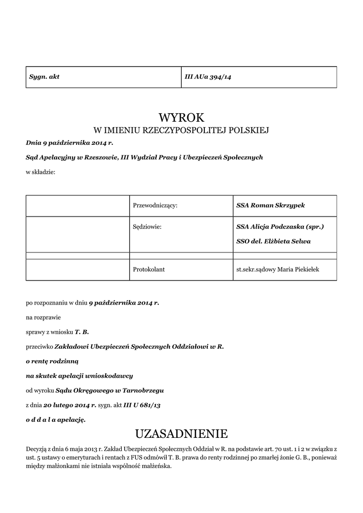 Sygn. akt III AUa 394/14 WYROK W IMIENIU RZECZYPOSPOLITEJ POLSKIEJ Dnia 9 października 2014 r. Sąd Apelacyjny w Rzeszowie, III Wydział Pracy i Ubezpieczeń Społecznych w składzie: Przewodniczący: SSA Roman Skrzypek Sędziowie: SSA Alicja Podczaska (spr.) SSO del. Elżbieta Selwa Protokolant st.sekr.sądowy Maria Piekiełek po rozpoznaniu w dniu 9 października 2014 r. na rozprawie sprawy z wniosku T. B. przeciwko Zakładowi Ubezpieczeń Społecznych Oddziałowi w R. o rentę rodzinną na skutek apelacji wnioskodawcy od wyroku Sądu Okręgowego w Tarnobrzegu z dnia 20 lutego 2014 r. sygn. akt III U 681/13 o d d a l a apelację. UZASADNIENIE Decyzją z dnia 6 maja 2013 r. Zakład Ubezpieczeń Społecznych Oddział w R. na podstawie art. 70 ust. 1 i 2 w związku z ust. 5 ustawy o emeryturach i rentach z FUS odmówił T. B. prawa do renty rodzinnej po zmarłej żonie G. B., ponieważ między małżonkami nie istniała wspólność małżeńska. W odwołaniu od powyższej decyzji wnioskodawca domagał się jej zmiany i przyznania dochodzonego świadczenia, podnosząc że spełnia warunki do uzyskania renty rodzinnej, ponieważ pozostawał z G. B. w związku małżeńskim i wspólności małżeńskiej do dnia jej śmierci. Odpowiadając na odwołanie, organ rentowy wniósł o jego oddalenie, wskazując że wspólność małżeńska polega na rzeczywistych więzach łączących małżonków, a ponadto obejmuje wspólne zamieszkanie, gospodarowanie i pomoc we współdziałaniu dla dobra rodziny. Wnioskodawca nie mieszkał z żoną od 15 lat, nie utrzymywał z nią kontaktów, mimo braku formalnego rozwiązania małżeństwa, prowadził gospodarstwo domowe z inną kobietą. Wyrokiem z dnia 20 lutego 2014 r., sygn. akt III U 681/13, Sąd Okręgowy w Tarnobrzegu, Sąd Pracy i Ubezpieczeń Społecznych oddalił odwołanie. W pisemnych motywach powyższego rozstrzygnięcia Sąd Okręgowy wskazał, że wnioskodawca T. B., ur. (...), pozostawał w związku małżeńskim z G. B. od 11 marca 1978 r. i ma z nią troje dzieci, na które na mocy ugody sądowej z dnia 30.03.1990 r. zobowiązany był płacić alimenty. Dalej Sąd ustalił, że małżonkowie mieszkali wspólnie w mieszkaniu w M., przy ul. (...) do 1990 r., później wnioskodawca zamieszkał ze swoją konkubiną L. W. we wspólnie z nią zakupionym domu. Ze związku z L. W. wnioskodawca ma jedną córkę – J. B., ur. (...) Ponadto Sąd ustalił, że z oświadczeń składanych przez G. B. do ZUS wynika, że wnioskodawca nie pozostawał z nią i dziećmi w jednym gospodarstwie domowym, z kolei wnioskodawca w swoich oświadczeniach do ZUS jako członków rodziny, korzystających ze wspólnych dochodów wskazywał konkubinę i wspólną córkę J.. W dniu 16.06.2004 r. wnioskodawca został zgłoszony przez G. B. do ubezpieczenia zdrowotnego jako członek rodziny. W okresie od 1.04.2001 r. do 1.12.2013 r. wnioskodawca miał przyznane prawo do emerytury z tytułu opieki nad chorym dzieckiem, J. B., we wniosku o to świadczenie wnioskodawca podawał adres zameldowania i pobytu w M., przy ul. (...). Przechodząc do oceny prawnej, Sąd I instancji wskazał, że określenie ,,wspólność małżeńska” użyte w art. 70 ustawy o emeryturach i rentach z FUS oznacza więź osobistą, emocjonalną i uczuciową między małżonkami. Zgromadzony materiał dowodowy przekonuje, że więź taka nie istniała pomiędzy wnioskodawcą, a zmarłą żoną, wobec czego nie spełnia przesłanek do ustalenia prawa do renty rodzinnej. W apelacji od powyższego wyroku wnioskodawca domagał się jego zmiany i przyznania dochodzonego świadczenia, zarzucając naruszenie przepisów postępowania, tj. art. 233 § 1 kpc, poprzez niewłaściwe zastosowanie, polegające na błędnej ocenie zebranego w sprawie materiału dowodowego i błędne przyjęcie, że wnioskodawca nie pozostawał z żoną w chwili jej śmierci we wspólności małżeńskiej, co doprowadziło do błędnego zastosowania art. 70 i art. 65 ustawy o emeryturach i rentach z FUS. Sąd Apelacyjny w Rzeszowie zważył, co następuje: Apelacja wnioskodawcy jest nieuzasadniona i podlega oddaleniu, ponieważ zaskarżony wyrok Sądu Okręgowego w Tarnobrzegu jest trafny i nie narusza prawa. Spór w sprawie dotyczył uprawnienia T. B. do renty rodzinnej po zmarłej żonie G. B., a w szczególności wystąpienia przesłanki wspólności małżeńskiej, o której mowa w art. 70 ust. 3 ustawy z dnia 17 grudnia 1998 r. o emeryturach i rentach z Funduszu Ubezpieczeń Społecznych (t. jedn. 2013. 1440). Sąd I instancji zgromadził obszerny materiał dowodowy w sprawie i na jego podstawie przyjął, że T. i G. B. pozostających w formalnym związku małżeńskim, w dacie śmierci małżonki wnioskodawcy nie łączyła wspólność małżeńska. Wnioski, które Sąd I instancji wywiódł ze zgromadzonego materiału dowodowego były uzasadnione i w niczym nie naruszały zasady swobodnej oceny dowodów. Nie może zatem stanowić uzasadnionej podstawy apelacyjnej polemika wnioskodawcy z wynikiem postępowania dowodowego i jego oceną. Ocena ta, w przekonaniu Sądu Apelacyjnego jest swobodna, ale nie dowolna i nie narusza granic zakreślonych treścią przepisu art. 233 § 1 kpc. Przypomnieć w tym miejscu należy, że wspólność małżeńska oznacza rzeczywisty związek łączący małżeństwo, obejmujący wspólne zamieszkiwanie i prowadzenie wspólnego gospodarstwa domowego, wspólne pożycie, wierność i pomoc we współdziałaniu dla dobra założonej przez siebie rodziny (wyrok SN z dnia 6 marca 1997 r., II UKN 17/97, OSNAPiUS 1997, nr 23, poz. 477). Natomiast brak wspólności małżeńskiej to trwały rozkład pożycia małżeńskiego, który można przyjąć wówczas, gdy zamiar zerwania tej wspólności wynika wyraźnie z postępowania obojga małżonków. Orzecznictwo jako okoliczności, mogące świadczyć o braku wspólności małżeńskiej wskazuje: osobne zamieszkiwanie małżonków przy braku obiektyw