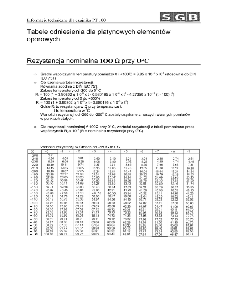 Informacje techniczne dla czujnika PT 100 Tabele odniesienia dla platynowych elementów oporowych Rezystancja nominalna 1OO Ω przy O°C • -3 -1 Średni współczynnik temperatury pomiędzy 0 i +100°C = 3.85 x 10 x K (stosownie do DIN IEC 751) • Obliczenia wartości rezystancji: Równania zgodnie z DIN IEC 751: 0 Zakres temperatury od -200 do 0 C -3 -6 2 -12 3 Rt = 100 [1 + 3.90802 q 1 0 x t - 0.580195 x 1 0 x t - 4.27350 x 10 (t - 100) t ] Zakres temperatury od 0 do +850% -3 -6 2 Rt = 100 (1 + 3.90802 q 1 0 x t - 0.580195 x 1 0 x t ) Gdzie Rt to rezystancja w Ω przy temperaturze t. 0 t to temperatura w C 0 Wartości rezystancji od -200 do -250 C zostały uzyskane z naszych własnych pomiarów w punktach stałych. • 0 Dla rezystancji nominalnej ≠ 100Ω przy 0 C, wartości rezystancji z tabeli pomnożono przez -2 0 współczynnik R0 x 10 (R = nominalna rezystancja przy 0 C) Wartości rezystancji w Omach od -250°C to 0°C Informacje techniczne dla czujnika PT 100 Platynowe elementy oporowe Dopuszczalne odchylenia od tabel odniesienia Dopuszczalne odchylenia dla platynowych elementów oporowych ustala się na podstawie następujących równań (stosownie do DIN IEC 751) 0 Dopuszczalne odchylenie w C = ± (0.15 + 0.002 [t]) dla klasy A 0 Dopuszczalne odchylenie w C = ± (0.3 + 0.005 [t]) dla klasy B 0 Gdzie [t] jest wartością temperatury (w C). O Odchylenia w C mają zastosowanie dla wszystkich rezystancji nominalnych; odchylenia w Ω jedynie dla 100 Ω Dla wartości rezystancji nominalnych innych aniżeli 100 Ω Wartości odchyleń w Ω należy pomnożyć przez współczynnik -2 R0 x l0 Wartości tolerancji Ω Na specjalne zamówienie dostarczymy tolerancji bardziej restrykcyjnych lub szerszych (zob. strona 2). Temperatura w 0 C Measuring temp – temperatura pomiaru Permissible deviations – dopuszczalne odchylenia Class - klasa