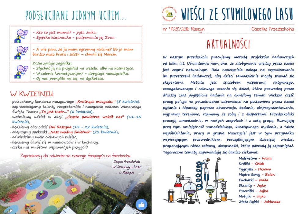 WIEŚCI ZE STUMILOWEGO LASU PODSŁUCHANE JEDNYM UCHEM... nr 4(25)/2016 Raszyn - Kto to jest mumia? - pyta Julka. - Egipska księżniczka - podpowiada jej Zosia. Gazetka Przedszkolna AKTUALNOŚCI - A wie pani, że ja mam ogromną rodzinę? Bo ja mam bardzo dużo brata i sióstr – chwali się Marcin. W naszym przedszkolu pracujemy metodą projektów badawczych Zosia zadaje zagadkę: - Słychać ją na przykład na weselu, albo na kosmetyce. - W salonie kosmetycznym? - dopytuje nauczycielka. - Oj nie, pomyliło mi się, na dyskotece. od kilku lat. Uświadamia nam ona, że zdobywanie wiedzy przez dzieci jest czymś naturalnym. Rola nauczyciela polega na organizowaniu im przestrzeni badawczej, aby dzieci samodzielnie mogły stawać się ekspertami. Metoda jest sposobem wspierania aktywnego, zaangażowanego i celowego uczenia się dzieci, które prowadzą przez W KWIETNIU: dłuższy czas pogłębione badania na określony temat. Większa część - posłuchamy koncertu muzycznego „Kwitnąca muzyczka” (5 kwietnia), - zaprezentujemy talenty recytatorskie i muzyczne podczas Wiosennego Święta Teatru „To jest teatr...” (6 kwietnia), - weźmiemy udział w akcji „Czyste powietrze wokół nas” (11-15 kwietnia), - będziemy obchodzić Dni Raszyna (19 - 22 kwietnia), - obejrzymy spektakl „Nasz modny śmietnik” (22 kwietnia), - odwiedzimy wiele ciekawych miejsc, - będziemy bawić się w naukowców i w kucharzy, - czeka nas mnóstwo wspaniałych przygód! Zapraszamy do odwiedzenia naszego fanpage’a na facebooku. Zespół Przedszkola... „W Stumilowym Lesie” w Raszynie _. pracy polega na poszukiwaniu odpowiedzi na postawione przez dzieci pytania i hipotezy poprzez obserwacje, badanie, eksperymentowanie, wyprawy terenowe, rozmowy ze sobą i z ekspertami. Przedszkolaki pracują samodzielnie, w małych zespołach i z całą grupą. Rozwijają przy tym umiejętność samodzielnego, kreatywnego myślenia, a także współdziałania, pracy w grupie. Nauczyciel jest w tym przypadku wspierającym przewodnikiem, porządkującym dziecięcą wiedzę, proponującym różne zabawy, aktywności, które pozwolą ją zapamiętać. Tegoroczne tematy zapowiadają się bardzo ciekawie: Maleństwa - Woda Króliki - Chleb Tygryski - Drzewo Mądre Sowy - Balon Puchatki - Woda Skrzaty - Jajko Pszczółki - Jajko Motylki - Jajko Złote Rybki - Jabłuszko TO BYŁ MIESIĄC... Listki Marzec upłynął nam pod znakiem sztuki. Jakże mogłoby być inaczej w miesiącu, w którym obchodzimy Dzień Poezji i Dzień Teatru! Zaczęło się od poezji właśnie, gdy w ramach akcji Akademia Zdrowego Przedszkolaka poznawaliśmy świat emocji dzięki utworom Marii Konopnickiej. Z kolei akcent muzyczny miał miejsce podczas koncertu ”Wiosenny uśmiech”. Dzieci uzdolnione manualnie miały natomiast pole do popisu podczas Dnia Biżuterii, kiedy to samodzielnie stworzyły przepiękne ozdoby. Nie zabrakło też ważnych wydarzeń teatralnych. Spektakl teatru Bon Ton przypomniał dzieciakom o dobrych Festiwalu Teatrów manierach. Nie zabrakło też scenicznych sukcesów. Grupa Mądre Sowy zdobyła trzecie miejsce na V Warszawskim Przedszkolnych „Ogrzać zimę”. Reprezentanci naszego przedszkola zabłysnęli także podczas organizowanego po raz drugi w naszej Młode listki cieszą się wszystkim: wiatrem - że je huśta i kolebie, obłokami - że tańczą po niebie, szpakiem - co gałązki w locie trąca i zielonym cieniem i promieniem słońca. Młode listki cieszą się razem z nami, że są młodymi listkami. Maria Terlikowska_ Tak było podczas II Przeglądu Artystycznego ”Niech się przenika teatr i plastyka” placówce Przeglądu Artystycznego „Niech się przenika teatr i plastyka”. Jakież to były emocje i doznania artystyczne! Z kolei wszystkie nasze przedszkolaki zdolności przepięknie powitały wokalno-taneczne. W wiosnę, tym prezentując bardzo twórczym niezwykłe miesiącu nie zabrakło też eksperymentów kulinarnych i naukowych, zajęć matematycznych i przyrodniczych. Udało nam się również nawiązać współpracę ze schroniskiem na Paluchu, a wszystko w ramach akcji ”Syty Dzień Kota”. Dziękujemy wszystkim Państwu, którzy się w nią zaangażowali wraz z dziećmi. To był niezwykły miesiąc! V Warszawski Festiwal Teatrów Przedszkolnych „Ogrzać zimę” Dzień Biżuterii „Rupaki” grupa Mądre Sowy „Moja siostra królewna” Przedszkole nr 1 „Pod Topolą” „A jak będę dorosła” grupa Puchatki Nasi jurorzy – przyjaciele „Stumilowego Lasu”