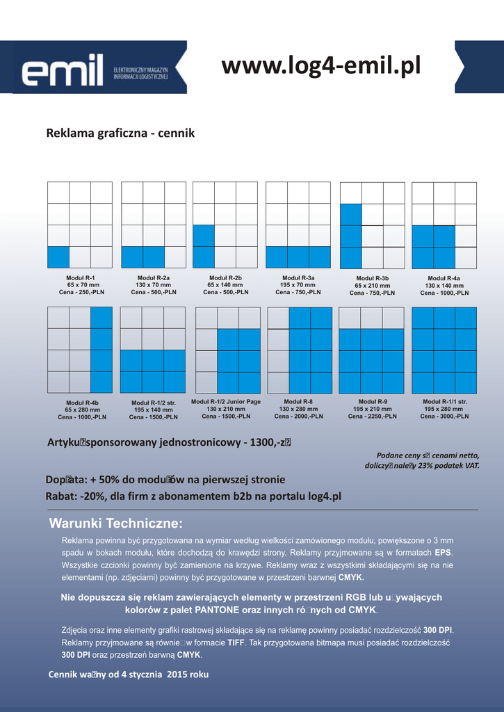 www.log4-emil.pl Reklama graficzna - cennik Moduł R-1 65 x 70 mm Cena - 250,-PLN Moduł R-2a 130 x 70 mm Cena - 500,-PLN Moduł R-2b 65 x 140 mm Cena - 500,-PLN Moduł R-3a 195 x 70 mm Cena - 750,-PLN Moduł R-3b 65 x 210 mm Cena - 750,-PLN Moduł R-4a 130 x 140 mm Cena - 1000,-PLN Moduł R-4b 65 x 280 mm Cena - 1000,-PLN Moduł R-1/2 str. 195 x 140 mm Cena - 1500,-PLN Moduł R-1/2 Junior Page 130 x 210 mm Cena - 1500,-PLN Moduł R-8 130 x 280 mm Cena - 2000,-PLN Moduł R-9 195 x 210 mm Cena - 2250,-PLN Moduł R-1/1 str. 195 x 280 mm Cena - 3000,-PLN Artykuł sponsorowany jednostronicowy - 1300,-zł. Podane ceny są cenami netto, doliczyć należy 23% podatek VAT. Dopłata: + 50% do modułów na pierwszej stronie Rabat: -20%, dla firm z abonamentem b2b na portalu log4.pl Warunki Techniczne: Reklama powinna być przygotowana na wymiar według wielkości zamówionego modułu, powiększone o 3 mm spadu w bokach modułu, które dochodzą do krawędzi strony. Reklamy przyjmowane są w formatach EPS. Wszystkie czcionki powinny być zamienione na krzywe. Reklamy wraz z wszystkimi składającymi się na nie elementami (np. zdjęciami) powinny być przygotowane w przestrzeni barwnej CMYK. Nie dopuszcza się reklam zawierających elementy w przestrzeni RGB lub używających kolorów z palet PANTONE oraz innych różnych od CMYK. Zdjęcia oraz inne elementy grafiki rastrowej składające się na reklamę powinny posiadać rozdzielczość 300 DPI. Reklamy przyjmowane są również w formacie TIFF. Tak przygotowana bitmapa musi posiadać rozdzielczość 300 DPI oraz przestrzeń barwną CMYK. Cennik ważny od 4 stycznia 2015 roku LOG4.PL Ul. Szarych Szeregów 27 lok 28. 60-462 Poznań Tel: 61 847 49 08; Fax: 61 847 45 67 E-mail: [email protected] ; Website: www.log4-emil.pl EMIL - zamówienie Nazwa firmy: Ulica: Telefon: Kod pocztowy: Fax Miejscowość: Adres E-mail: :NIP: Branża: Zamawiam: Moduł reklamowy Wielkość Cena jednostkowa Ilość emisji Cena emisji Rabat Razem wartość zamówienia netto: Inne: Wartość zamówienia: Wartość zamówienia słownie: PLN netto+VAT Termin płatności: 7 dni od daty otrzymania faktury Pieczątka zamawiającego: Pieczątka firmowa: Data i podpis Data i podpis Wydawca: LOG4.PL Andrzej Szymkiewicz, ul. Szarych Szeregów 27/28, 60-462 Poznań NIP: 9720481162; REGON: 634238765; Wartość