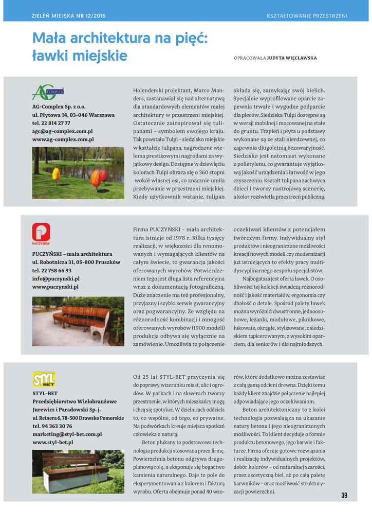 ZIELEŃ MIEJSK A NR 12/2016 KSZTAŁTOWANIE PRZESTRZENI Mała architektura na pięć: ławki miejskie OPRACOWAŁA JUDYTA WIĘCŁAWSKA Holenderski projektant, Marco Man- składa się, zamykając swój kielich. ders, zastanawiał się nad alternatywą Specjalnie wyprofilowane oparcie za- AG-Complex Sp. z o.o. dla standardowych elementów małej pewnia trwałe i wygodne podparcie ul. Płytowa 14, 03-046 Warszawa architektury w przestrzeni miejskiej. dla pleców. Siedziska Tulpi dostępne są tel. 22 814 27 77 Ostatecznie zainspirował się tuli- w wersji mobilnej i mocowanej na stałe [email protected] panami – symbolem swojego kraju. do gruntu. Trzpień i płyta u podstawy www.ag-complex.com.pl Tak powstało Tulpi – siedzisko miejskie wykonane są ze stali nierdzewnej, co w kształcie tulipana, nagrodzone wie- zapewnia długoletnią bezawaryjność. loma prestiżowymi nagrodami za wy- Siedzisko jest natomiast wykonane jątkowy design. Dostępne w dziewięciu z polietylenu, co gwarantuje wyjątko- kolorach Tulpi obraca się o 360 stopni wą jakość urządzenia i łatwość w jego wokół własnej osi, co znacznie umila czyszczeniu. Kształt tulipana zachwyca przebywanie w przestrzeni miejskiej. dzieci i tworzy nastrojową scenerię, Kiedy użytkownik wstanie, tulipan a kolor rozświetla przestrzeń publiczną. Firma PUCZYŃSKI – mała architek- oczekiwań klientów z potencjałem tura istnieje od 1978 r. Kilka tysięcy twórczym firmy. Indywidualny styl realizacji, w większości dla renomo- produktów i nieograniczone możliwości PUCZYŃSKI – mała architektura wanych i wymagających klientów na kreacji nowych modeli czy modernizacji ul. Robotnicza 31, 05-800 Pruszków całym świecie, to gwarancja jakości już istniejących to efekty pracy multi- tel. 22 758 66 93 oferowanych wyrobów. Potwierdze- dyscyplinarnego zespołu specjalistów. [email protected] niem tego jest długa lista referencyjna Najbogatsza jest oferta ławek. O oso- www.puczynski.pl wraz z dokumentacją fotograficzną. bliwości tej kolekcji świadczą różnorod- Duże znaczenie ma też profesjonalny, ność i jakość materiałów, ergonomia czy przyjazny i szybki serwis gwarancyjny dbałość o detale. Spośród palety ławek oraz pogwarancyjny. Ze względu na można wyróżnić: dwustronne, jednooso- różnorodność kombinacji i mnogość bowe, leżanki, modułowe, piknikowe, oferowanych wyrobów (1900 modeli) łukowate, okrągłe, stylizowane, z siedzi- produkcja odbywa się wyłącznie na skiem tapicerowanym, z wysokim opar- zamówienie. Umożliwia to połączenie ciem, dla seniorów i dla najmłodszych. Od 25 lat STYL-BET przyczynia się rów, które dodatkowo można zestawiać do poprawy wizerunku miast, ulic i ogro- z całą gamą odcieni drewna. Dzięki temu STYL-BET dów. W parkach i na skwerach tworzy każdy klient znajdzie połączenie najlepiej Przedsiębiorstwo Wielobranżowe przestrzenie, w których mieszkańcy mogą odpowiadające jego oczekiwaniom. Jurewicz i Paradowski Sp. j. i chcą się spotykać. W dzielnicach oddziela Beton architektoniczny to z kolei ul. Reinera 6, 78-500 Drawsko Pomorskie to, co wspólne, od tego, co prywatne. technologia pozwalająca na ukazanie tel. 94 363 30 76 Na podwórkach kreuje miejsca spotkań natury betonu i jego nieograniczonych [email protected] człowieka z naturą. możliwości. To klient decyduje o formie www.styl-bet.pl Beton płukany to podstawowa tech- produktu betonowego, jego barwie i fak- nologia produkcji stosowana przez firmę. turze. Firma oferuje gotowe rozwiązania Powierzchnia betonu odgrywa drugo- i realizację indywidualnych projektów, planową rolę, a eksponuje się bogactwo dobór kolorów – od naturalnej szarości, kamienia naturalnego. Daje to pole do przez ascetyczną biel, aż po całą paletę eksperymentowania z kolorem i fakturą barwników – oraz możliwość struktury- wyrobu. Oferta obejmuje ponad 40 wzo- zacji powierzchni. 39 ZIELEŃ MIEJSK A NR 12/2016 KSZTAŁTOWANIE PRZESTRZENI zwykłej oraz nierdzewnej, ławki gięte, 25 lat, w Polsce pojawiła się w 2007 r. zestawy plenerowe, ławki z elemen- Ziegler Studio Sp. z o.o. jako spółka pod nazwą Ziegler Polska, tami betonowymi, ławki w stylu retro ul. Usługowa 2, 55-330 Błonie która na skutek zmian udziałowców czy leżaki. Asortyment firmy obejmuje tel. 71 349 40 34 została z kolei przekształcona w spółkę również szeroki wybór koszy na śmieci, [email protected] Ziegler Studio. Nad wysoką jakością stojaków rowerowych, słupków parkin- www.ziegler-studio.pl oferowanych przez firmę produktów gowych i ulicznych oraz donic ze stali czuwa wysoce wykwalifikowana kadra, czy z betonu architektonicznego. pracująca przy użyciu bardzo nowocze- Oprócz tego firma świadczy usługi snego parku maszynowego. Działalność z zakresu produkcji lekkich konstruk- przedsiębiorstwa obejmuje zarówno cji stalowych, pawilonów dla palących małą architekturę miejską, jak i ele- oraz różnego rodzaju zadaszeń, w tym menty zagospodarowania przestrzeni. zadaszeń rowerowych, osłon śmiet- W swojej ofercie posiada: ławki ze stali nikowych oraz wiat przystankowych. REKLAMA Marka Ziegler działa w Europie od ponad NOWOCZESNOŚĆ, FUNKCJONALNOŚĆ, STYL DLA KAŻDEGO MIASTA G483$*$74$*J;'/t3*$A*Ÿ $'&,>$ŷŵ#ŲŲŶŃ>$è$",> T:0ŵŹŷŶŶųźźŲźŲF:0ŵŹŷŶŶųźŸŹŹŹ E:48;$,483$*$#4$*/.' >>>/483$*$#4$*/.' REKLAMA ʅŒ>&$$('($%4&$ ʅ48,%&$3,>3,> ʅ4Œ;.,Œ,4A*$,>,#3&'(,> ʅ3$&4A XI Konferencja Nowe prawo ochrony środowiska 18-19 stycznia 2017 r., Warszawa Więcej informacji: Bogna Fengier, tel.: 61 655 81 26, e-mail: [email protected] www.abrys.pl www.abrys.pl