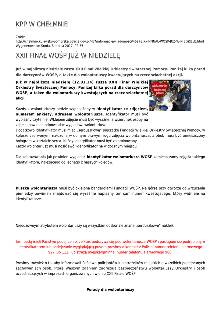KPP W CHEŁMNIE Źródło: http://chelmno.kujawsko-pomorska.policja.gov.pl/kb7/informacje/wiadomosci/46278,XXII-FINAL-WOSP-JUZ-W-NIEDZIELE.html Wygenerowano: Środa, 8 marca 2017, 02:35 XXII FINAŁ WOŚP JUŻ W NIEDZIELĘ Już w najbliższą niedzielę rusza XXII Finał Wielkiej Orkiestry Świątecznej Pomocy. Poniżej kilka porad dla darczyńców WOŚP, a także dla wolontariuszy kwestujących na rzecz szlachetnej akcji. Już w najbliższą niedzielę (12.01.14) rusza XXII Finał Wielkiej Orkiestry Świątecznej Pomocy. Poniżej kilka porad dla darczyńców WOŚP, a także dla wolontariuszy kwestujących na rzecz szlachetnej akcji. Każdy z wolontariuszy będzie wyposażony w identyfikator ze zdjęciem, numerem ankiety, adresem wolontariusza. Identyfikator musi być wypisany czytelnie. Wklejone zdjęcie musi być wyraźne, a wizerunek osoby na zdjęciu powinien odpowiadać wyglądowi wolontariusza. Dodatkowo identyfikator musi mieć „serduszkową” pieczątkę Fundacji Wielkiej Orkiestry Świątecznej Pomocy, w kolorze czerwonym, nałożoną w dolnym prawym rogu zdjęcia wolontariusza, a obok musi być umieszczony hologram w kształcie serca. Każdy identyfikator musi być zalaminowany. Każdy wolontariusz musi nosić swój identyfikator na widocznym miejscu. Dla zobrazowania jak powinien wyglądać identyfikator wolontariusza WOŚP zamieszczamy zdjęcia takiego identyfikatora, należącego do jednego z naszych kolegów. Puszka wolontariusza musi być oklejona banderolami Fundacji WOŚP. Na górze przy otworze do wrzucania pieniędzy powinien znajdować się wyraźnie napisany ten sam numer kwestującego, który widnieje na identyfikatorze. Nieodzownym atrybutem wolontariuszy są wszystkim doskonale znane „serduszkowe” naklejki. Jeśli będą mieli Państwo podejrzenie, że ktoś podszywa się pod wolontariusza WOŚP i posługuje się podrobionym identyfikatorem lub podejrzanie wyglądającą puszką prosimy o kontakt z Policją, numer telefonu alarmowego 997 lub 112, lub strażą miejską/gminną, numer telefonu alarmowego 986. Prosimy również o to, aby informowali Państwo policjantów lub strażników miejskich o wszelkich podejrzanych zachowaniach osób, które Waszym zdaniem zagrażają bezpieczeństwu wolontariuszy Orkiestry i osób uczestniczących w imprezach organizowanych w dniu XXII Finału WOŚP. Porady dla wolontariuszy Prowadźcie zbiórkę pieniędzy w bezpiecznych miejscach: - centrach handlowych, w których zatrudnieni są pracownicy ochrony, - głównych ciągach komunikacyjnych, - miejscach dobrze oświetlonych, - miejscach, w których występuje duże natężenie ruchu pieszych, - miejscach objętych monitoringiem kamer, itp. - nie prowadźcie zbiórek w miejscach słabo uczęszczanych, na źle oświetlonych ulicach, miejscach, które na Waszym osiedlu uznawane są za niebezpieczne! - unikajcie prowadzenia zbiórek pieniędzy samodzielnie. W grupie jest zawsze bezpieczniej! Starajcie zapewnić sobie towarzystwo innych wolontariuszy, a jeżeli to możliwe opiekę osób dorosłych! - unikajcie prowadzenia zbiórki pieniędzy w środkach komunikacji publicznej! Szczególnie ważne jest, abyście wracając do Waszego sztabu, po zakończeniu zbiórki pieniędzy poruszali się w grupie, korzystajcie z pomocy Waszych znajomych, bliskich. Jeżeli zaistnieje potrzeba zwracajcie się o pomoc do Policji, numer telefonu alarmowego 997 lub 112, lub straży miejskich/gminnych, numer telefonu alarmowego 986. W czasie przebiegu XXII Finału WOŚP na ulicach będzie więcej policjantów i strażników miejskich niż zazwyczaj. Możecie im bezpośrednio zgłaszać swoje uwagi na temat Waszego bezpieczeństwa podczas prowadzenia zbiórki pieniędzy. Możecie zostać zapytani przez policjantów/strażników o to jak przebiega Wasza kwesta. Nie obawiajcie się ich, oni są Waszymi sprzymierzeńcami. Wszystkim wolontariuszom życzymy pełnych puszek, życzliwości przechodniów i bezpiecznego powrotu do swoich sztabów WOŚP i wielkiej satysfakcji z udziału w tym pięknym dziele pomocy dzieciom i osobom w starszym wieku!!! Zapraszamy do odwiedzania naszych licytacji na Allegro przygotowanych na XXII Finał WOŚP!!! Przygotowane specjalnie dla Państwa niespodzianki, dzięki zakupowi których można wesprzeć Wielką Orkiestrę Świątecznej Pomocy, można obejrzeć odwiedzając stronę Sztabu WOŚP w Bydgoszczy: http://www.wosp.bydgoszcz.com/aukcje.html st. asp. Adam Kumkowski Wydział Prewencji KWP w Bydgoszczy Autor: red1.kppc Publikacja: red1.kppc Ocena: 0/5 (0) Tweetnij