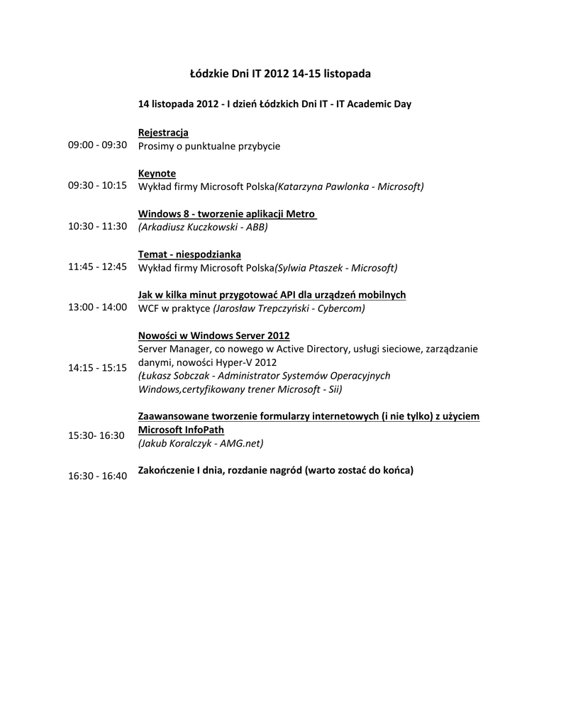 Łódzkie Dni IT 2012 14-15 listopada 14 listopada 2012 - I dzień Łódzkich Dni IT - IT Academic Day 09:00 - 09:30 Rejestracja Prosimy o punktualne przybycie 09:30 - 10:15 Keynote Wykład firmy Microsoft Polska(Katarzyna Pawlonka - Microsoft) 10:30 - 11:30 Windows 8 - tworzenie aplikacji Metro (Arkadiusz Kuczkowski - ABB) 11:45 - 12:45 Temat - niespodzianka Wykład firmy Microsoft Polska(Sylwia Ptaszek - Microsoft) 13:00 - 14:00 Jak w kilka minut przygotować API dla urządzeń mobilnych WCF w praktyce (Jarosław Trepczyński - Cybercom) 14:15 - 15:15 15:30- 16:30 16:30 - 16:40 Nowości w Windows Server 2012 Server Manager, co nowego w Active Directory, usługi sieciowe, zarządzanie danymi, nowości Hyper-V 2012 (Łukasz Sobczak - Administrator Systemów Operacyjnych Windows,certyfikowany trener Microsoft - Sii) Zaawansowane tworzenie formularzy internetowych (i nie tylko) z użyciem Microsoft InfoPath (Jakub Koralczyk - AMG.net) Zakończenie I dnia, rozdanie nagród (warto zostać do końca) 15 listopada 2012 - II dzień Łódzkich Dni IT 09:00 - 09:30 09:30 - 10:30 Rejestracja Wiesz co i gdzie? Dowiedz się jak - sprawdź Agile Agile na przykładzie pracy nad produktami dla sieci szkieletowych technologii mobilnych (Radosław Lont - Software Developer - Ericpol) 10:45 - 11:45 Dlaczego projekty umierają, czy najlepszym wyjściem jest je dobić? (Marek Defeciński, Mariusz Saramak - Mobica) 12:00 - 13:00 Duży projekt IT – duże wyzwania. Jak to wygląda od środka? (Marek Kunkel - Manager - Accenture) 13:15 - 14:15 Android - projekt o otwartych źródłach (Krystian Lewandowski - Mobica) 14:30 - 15:00 Sprężynka, FPGA i algorytmy- czyli o zastosowaniach informatyki w nanotechnologii (Sławomir Pawłowski - Wydział Fizyki i Informatyki Stosowanej UŁ) 15:10 - 15:30 15:40 - 16:10 16:10 - 16:30 Zimowe praktyki pod patronatem Microsoft Studia, a rzeczywistość (Marcin Franc) Projektowanie aplikacji sieciowych przy użyciu technologii .NET Celem wykładu jest omówienie różnych podeść do projektowania oraz implementacji złożonych systemów informatycznych z uwzględnieniem wymienionych aspektów (Leszek Kantorek .NET Senior Developer - Rule Financial) Zakończenie konferencji, rozdanie nagród