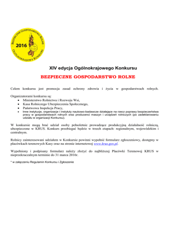 XIV edycja Ogólnokrajowego Konkursu BEZPIECZNE GOSPODARSTWO ROLNE Celem konkursu jest promocja zasad ochrony zdrowia i życia w gospodarstwach rolnych. Organizatorami konkursu są: Ministerstwo Rolnictwa i Rozwoju Wsi, Kasa Rolniczego Ubezpieczenia Społecznego, Państwowa Inspekcja Pracy, Inne instytucje, organizacje i instytuty naukowo-badawcze działające na rzecz poprawy bezpieczeństwa pracy w gospodarstwach rolnych oraz producenci maszyn i urządzeń rolniczych (po zadeklarowaniu udziału w organizacji Konkursu). W konkursie mogą brać udział osoby pełnoletnie prowadzące produkcyjną działalność rolniczą, ubezpieczone w KRUS. Konkurs przebiegać będzie w trzech etapach: regionalnym, wojewódzkim i centralnym. Rolnicy zainteresowani udziałem w Konkursie powinni wypełnić formularz zgłoszeniowy, dostępny w placówkach terenowych Kasy oraz na stronie internetowej www.krus.gov.pl. Wypełniony i podpisany formularz należy złożyć do najbliższej Placówki Terenowej KRUS w nieprzekraczalnym terminie do 31 marca 2016r. * w załączeniu Regulamin Konkursu i Zgłoszenie XIV OGÓLNOKRAJOWY KONKURS BEZPIECZNE GOSPODARSTWO ROLNE Kategoria: gospodarstwa indywidualne REGULAMIN I. Cel Konkursu: Promocja zasad ochrony zdrowia i życia w gospodarstwach rolnych. II. Organizatorzy: 1. Ministerstwo Rolnictwa i Rozwoju Wsi 2. Kasa Rolniczego Ubezpieczenia Społecznego 3. Państwowa Inspekcja Pracy 4. Inne instytucje, organizacje i instytuty naukowo-badawcze działające na rzecz poprawy bezpieczeństwa pracy w gospodarstwach rolnych oraz producenci maszyn i urządzeń rolniczych (po zadeklarowaniu udziału w organizacji Konkursu). III. Uczestnicy i zgłoszenie udziału w Konkursie. Udział w Konkursie mogą brać osoby pełnoletnie prowadzące produkcyjną działalność 1. rolniczą, ubezpieczone w KRUS (przynajmniej jeden z właścicieli). Właściciele trzech najbezpieczniejszych gospodarstw wyłonieni w etapach regionalnych 2. i wojewódzkich Konkursu nie mogą brać udziału w Konkursie przez okres trzech kolejnych lat, zdobywcy II i III miejsca finału krajowego przez okres pięciu lat, a zdobywcy I miejsca w finale krajowym nie mogą uczestniczyć w kolejnych edycjach Konkursu BGR. 3. Zgłoszenia dokonuje się na formularzu, który stanowi załącznik nr 1 do Regulaminu. Wypełniony i podpisany formularz należy złożyć w najbliższej Placówce Terenowej lub Oddziale Regionalnym KRUS w nieprzekraczalnym terminie do 31 marca 2016 r. 4. Formularze zgłoszeniowe dostępne są w PT i OR KRUS, w prasie, na stronie internetowej KRUS oraz w przedstawicielstwach współorganizatorów i patronów medialnych. 2 IV. Kryteria oceny. Podstawą oceny gospodarstw są stwierdzone w nich zagrożenia. Komisje regionalna i wojewódzka odnotowują zagrożenia w “Arkuszu oceny gospodarstwa” (załącznik nr 2 Regulaminu). Przy ocenie brane są pod uwagę: ład i porządek w obrębie podwórza, zabudowań i stanowisk pracy, stan budynków inwentarskich i gospodarczych, w tym: schodów i używanych drabin oraz instalacji i urządzeń elektrycznych, wyposażenie maszyn i urządzeń używanych w gospodarstwie w osłony ruchomych części, podpory i inne zabezpieczenia przed wypadkami, stan techniczny maszyn i urządzeń stosowanych w gospodarstwie, warunki obsługi i bytowania zwierząt gospodarskich, stosowanie, stan i jakość środków ochrony osobistej, rozwiązania organizacyjne, technologiczne i techniczne wpływające na bezpieczeństwo osób pracujących i przebywających w gospodarstwie rolnym, estetyka gospodarstw. V. Organizacja Konkursu. 1. Postanowienia ogólne. Konkurs ma charakter ogólnokrajowy, przebiega co najmniej w trzech etapach. Jego ogłoszenie następuje w styczniu 2016 roku. Za przebieg poszczególnych etapów odpowiedzialne są komisje konkursowe. Komisję regionalną i wojewódzką powołuje dyrektor OR KRUS w porozumieniu z kierownikami PT i współorganizatorami. Centralną Komisję Konkursową w porozumieniu z organizatorami powołuje Prezes KRUS. Komisja ta nadzoruje przebieg Konkursu, odpowiada za przeprowadzenie etapu krajowego i organizację finału. Komisje konkursowe etapu regionalnego i wojewódzkiego wizytują gospodarstwa, sporządzają protokóły z posiedzenia Komisji i przesyłają kopie do komisji konkursowej wyższego szczebla wraz z „Arkuszami oceny gospodarstw” i dokumentacją zdjęciową gospodarstw zwycięzców etapu. 3 Organizatorzy poszczególnych etapów Konkursu współuczestniczą w pokrywaniu kosztów organizacyjnych i zakupu nagród na zasadach uzgodnionych ze sobą. Organizatorzy mogą pozyskiwać środki finansowe i nagrody od sponsorów. Placówki Terenowe / Oddziały Regionalne KRUS oraz Biuro Prewencji i Rehabilitacji Centrali Kasy pełnią odpowiednio rolę sekretariatów komisji konkursowych i udostępniają swoje adresy do korespondencji związanej z Konkursem. 2. Rozstrzygnięcie Konkursu. Etap regionalny Konkursu trwa od dnia jego ogłoszenia do 20 maja 2016 roku. Obejmuje zasięgiem obszar działania wyznaczony przez Dyrektora Oddziału Regionalnego. Liczba uczestników jest nieograniczona. Komisja Regionalna wyłania 3. laureatów i do 27 maja przekazuje dokumentację ich gospodarstw do Komisji Wojewódzkiej. Etap wojewódzki Konkursu trwa do 24 czerwca 2016 roku. Uczestniczą w nim laureaci etapów regionalnych. Komisja wojewódzka zapoznaje się z nadesłanymi “Arkuszami ocen gospodarstw” i dokumentacją zdjęciową. Przeprowadza wizytacje gospodarstw i ponownie ocenia gospodarstwa wg “Arkusza oceny gospodarstwa”. Wyłania zwycięzcę etapu wojewódzkiego Konkursu i przesyła do 30 czerwca br. do Centralnej Komisji Konkursowej “Arkusze oceny gospodarstwa” wraz z dokumentacją zdjęciową z etapu regionalnego i wojewódzkiego. Centralna Komisja Konkursowa zapoznaje się z dokumentacją z etapu regionalnego i wojewódzkiego, w lipcu 2016 roku przeprowadza wizytacje 16. gospodarstw zwycięzców etapów wojewódzkich 