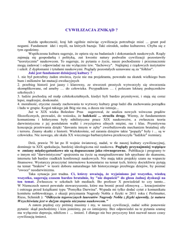 CYWILIZACJA ZNIKĄD ? Każda społeczność, kraj lub ogólnie mówiąc cywilizacja potrzebuje mieć ... grunt pod nogami. Fundament idei i myśli, na których bazuje. Taki ośrodek, sedno kulturowe. Chyba się z tym zgodzimy. Współczesna kultura sugeruje, że opiera się na badaniach i dokonaniach naukowych. Rządy zajmują się gospodarką i polityką, zaś kwestie natury podwalin cywilizacji pozostawiły "teoretycznie" naukowcom. To sugeruje, że pytania o życie, nasze pochodzenie i przeznaczenie mogą zadawać i odpowiadać na nie wyłącznie tzw. "fachowcy". Najlepiej z rządowych instytutów i szkół. Z dyplomami i tytułami naukowymi. Poglądy pozostałych uznawane są za "folklor". Jaki jest fundament dzisiejszej kultury ? 1. nie był potrzebny żaden stwórca, życie nie ma projektanta, powstało na skutek wielkiego bum bum i milionów lat mutacji ewolucyjnych 2. przebieg historii jest jasny i klarowny, ze stworzeń prostych wytworzyły się stworzenia skomplikowane, od ameby … do człowieka. Przypadkiem … ( polecam lekturę podręczników szkolnych ) 3. ludzie pochodzą od małp człekokształtnych, kiedyś byli bardzo prymitywni, i stają się coraz lepsi, mądrzejsi, doskonalsi. 4. moralność, etyczne zasady zachowania to wytwory kultury grup ludzi dla zachowania porządku i ładu w grupie. Kogoś takiego jak Bóg nie ma, a dusza nie istnieje... Już w XIX wieku Bolesław Prus sugerował, że analiza nowych wówczas prądów filozoficznych, prowadzi, do wniosku, że ludzkość ... straciła drogę. Wiemy, że fundamentem komunizmu i hitleryzmu były nihilistyczne prace XIX naukowców, a zwłaszcza teoria darwinistyczna z jej postulatem walki i zwycięstwa silnych mięśni, ras i klas. Prymitywna koncepcja przetrwania dzięki "dawaniu innym w zęby" zwerbalizowała mechanizm brutalnej siły i terroru. Znamy skutki z historii. Wielokrotnie, od zarania dziejów takie "popędy" były i ... są w człowieku. Nic nowego, ale skala XX wiecznego barbarzyństwa przekroczyła "ludzkie" rozmiary. Dziś, prawie 70 lat po II wojnie światowej, nadal, w tle naszej kultury cywilizacyjnej, dominuje ta XIX spekulacja, bardziej ideologiczna niż naukowa. Poglądy przynajmniej wątpiące w zmiany międzygatunkowe nie są dopuszczane jako równoprawne. Publikacje i programy tv o innym niż "darwinistyczne" spojrzeniu na życie są marginalizowane lub spychane do skansenu, internetu lub bardzo rzadkich konferencji naukowych. Nie mają takie projekty szans na wsparcie finansowe. Wystarczy przeczytać internetowe komentarze na temat tych, którzy dociekliwie pytają na temat "braków" w teorii doboru naturalnego lub historycznego przebiegu dziejów, by poznać "owoce" neodarwinizmu. Taka sytuacja jest trudna. Ci, którzy uważają, że wyjaśniono już wszystko, wiedzą wszystko, sugerują czasem bardzo brutalnie, by "nie dopuścić" do głosu żadnej dyskusji na ten temat. Zwłaszcza w szkołach lub mediach. Bo profesor X powiedział to czy tamto... W Niemczech nawet powstało stowarzyszenie, które ma bronić przed ofensywą ... kreacjonistów i ostrzega przed książkami typu "Pomyłka Darwina". Wypada mi tylko dodać cytat z komunikatu komitetu noblowskiego, z okazji przyznania Nagrody Nobla z fizyki w 2011 roku ( Perlmutter, Riess, Schmidt ): "Odkrycia tegorocznych laureatów Nagrody Nobla z fizyki ujawniły, że natura Wszechświata jest w dużym stopniu nieznana naukowcom." A zatem prędzej czy później musimy i my, w naszej cywilizacji, zadać sobie ponownie pytanie: skąd pochodzimy i kim jesteśmy, po co istniejemy. Bez odpowiedzi na te pytania szansę ma wyłącznie depresja, nihilizm i ... śmierć. I dlatego nie bez przyczyny ktoś nazwał nasze czasy cywilizacją śmierci. W lepszej sytuacji w tym zakresie ( w innym niekoniecznie ) byli nasi przodkowie. Krócej i bardziej niepewnie żyli, jednak nie opuszczała ich perspektywa tego... co dalej. Nasi przodkowie, których tak łatwo oceniamy z XXI-wiecznej perspektywy jako gorszych, byli często bardziej sensowni niż my. Nie gloryfikuję religii, zwłaszcza tych z przerażającymi, okrutnymi rytuałami, albo ohydnych wynaturzeń uzasadnianych religijnie, jednak religijność jest w nas wpisana. Mamy niespokojne serca, nie mieścimy się w sobie i zawsze szukamy czegoś lub Kogoś więcej... Już samo to może rodzić pytania o naszą "jakościową" odmienność mentalną i ... właśnie ... duszę! A dziś ? Pozostaje relacja w tv i tzw. eksperci, w tym "tele-wróżki". Podobno w samym Neapolu zarejestrowano już kilka tysięcy wróżek. Kopia Babilonu, w takich "nowoczesnych" czasach. Aż się prosi zacytować szanowną królową brytyjską, która spytała: dlaczego tak bardzo wykształceni ludzie nie przewidzieli obecnego kryzysu ? Historia się jednak nie skończyła. Wolałbym nie sprawdzać do czego jesteśmy zdolni, gdy runie społeczeństwo materialnego dobrobytu. ZSRR miał trwać do końca świata, USA dla niektórych także są przedmiotem swoistego kultu. Ale i ich czas może przeminąć. Zwłaszcza wobec globalnego propagowania zachowań wbrew naturze, wbrew ... samemu człowiekowi. Nie dziwmy się więc, że i Natura może być wbrew nam... Cywilizacja bez fundamentu, odrzucająca Człowieka „nie z tego świata”, który podzielił nasz los, aż do haniebnej śmierci na krzyżu, który zmartwychwstał byśmy i my mogli być prawdziwymi ludźmi, taka cywilizacja może nosić miano cywilizacji postchrześcijańskiej. I to już jest fakt. Niektórzy mówią nawet, że tak jest "klarowniej", bo jak mówił kard. Ratzinger, chrześcijaństwo zawsze traciło na zbytniej bliskości ... z władzą świecką. Być może, jak sugerował prof. Leszek Kołakowski, odrodzi się gdy wróci do swych korzeni, do ducha pierwszych chrześcijan. Dziś "widać" to w Afryce i Azji. Cywilizacja postchrześcijańska zmierza donikąd. Bo i twierdzi, że jest znikąd. Dlatego banalne, dla wielu głupie i "obrazoburcze" pytania np. o 