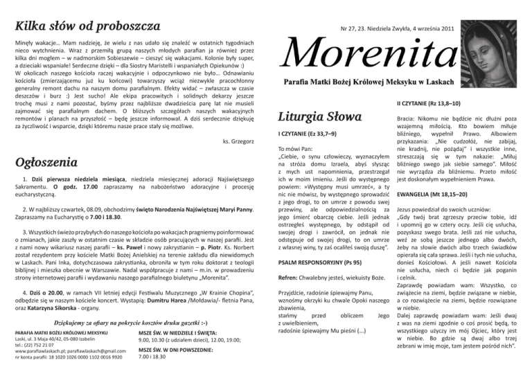 Kilka słów od proboszcza Nr 27, 23. Niedziela Zwykła, 4 września 2011 Minęły wakacje… Mam nadzieję, że wielu z nas udało się znaleźć w ostatnich tygodniach nieco wytchnienia. Wraz z przemiłą grupą naszych młodych parafian ja również przez kilka dni mogłem – w nadmorskim Sobieszewie – cieszyć się wakacjami. Kolonie były super, a dzieciaki wspaniałe! Serdeczne dzięki – dla Siostry Maristelli i wspaniałych Opiekunów :) W okolicach naszego kościoła raczej wakacyjnie i odpoczynkowo nie było… Odnawianiu kościoła (zmierzającemu już ku końcowi) towarzyszy wciąż niezwykle pracochłonny generalny remont dachu na naszym domu parafialnym. Efekty widać – zwłaszcza w czasie deszczów i burz :) Jest sucho! Ale ekipa pracowitych i solidnych dekarzy jeszcze trochę musi z nami pozostać, byśmy przez najbliższe dwadzieścia parę lat nie musieli zajmować się parafialnym dachem. O bliższych szczegółach naszych wakacyjnych remontów i planach na przyszłość – będę jeszcze informował. A dziś serdecznie dziękuję za życzliwość i wsparcie, dzięki któremu nasze prace stały się możliwe. Liturgia Słowa I CZYTANIE (Ez 33,7–9) ks. Grzegorz Ogłoszenia 1. Dziś pierwsza niedziela miesiąca, niedziela miesięcznej adoracji Najświętszego Sakramentu. O godz. 17.00 zapraszamy na nabożeństwo adoracyjne i procesję eucharystyczną. 2. W najbliższy czwartek, 08.09, obchodzimy święto Narodzenia Najświętszej Maryi Panny. Zapraszamy na Eucharystię o 7.00 i 18.30. 3. Wszystkich świeżo przybyłych do naszego kościoła po wakacjach pragniemy poinformować o zmianach, jakie zaszły w ostatnim czasie w składzie osób pracujących w naszej parafii. Jest z nami nowy wikariusz naszej parafii – ks. Paweł i nowy zakrystianin – p. Piotr. Ks. Norbert został rezydentem przy kościele Matki Bożej Anielskiej na terenie zakładu dla niewidomych w Laskach. Pani Inka, dotychczasowa zakrystianka, obroniła w tym roku doktorat z teologii biblijnej i mieszka obecnie w Warszawie. Nadal współpracuje z nami – m.in. w prowadzeniu strony internetowej parafii i wydawaniu naszego parafialnego biuletynu „Morenita”. 4. Dziś o 20.00, w ramach VII letniej edycji Festiwalu Muzycznego „W Krainie Chopina”, odbędzie się w naszym kościele koncert. Wystapią: Dumitru Harea /Mołdawia/- fletnia Pana, oraz Katarzyna Sikorska - organy. Dziękujemy za ofiary na pokrycie kosztów druku gazetki :-) PARAFIA MATKI BOŻEJ KRÓLOWEJ MEKSYKU Laski, ul. 3 Maja 40/42, 05-080 Izabelin tel.: (22) 752 21 07 www.parafiawlaskach.pl; [email protected] nr konta parafii: 18 1020 1026 0000 1102 0016 9920 MSZE ŚW. W NIEDZIELE I ŚWIĘTA: 9.00, 10.30 (z udziałem dzieci), 12.00, 19.00; MSZE ŚW. W DNI POWSZEDNIE: 7.00 i 18.30 To mówi Pan: „Ciebie, o synu człowieczy, wyznaczyłem na stróża domu Izraela, abyś słysząc z mych ust napomnienia, przestrzegał ich w moim imieniu. Jeśli do występnego powiem: »Występny musi umrzeć«, a ty nic nie mówisz, by występnego sprowadzić z jego drogi, to on umrze z powodu swej przewiny, ale odpowiedzialnością za jego śmierć obarczę ciebie. Jeśli jednak ostrzegłeś występnego, by odstąpił od swojej drogi i zawrócił, on jednak nie odstępuje od swojej drogi, to on umrze z własnej winy, ty zaś ocaliłeś swoją duszę”. PSALM RESPONSORYJNY (Ps 95) Refren: Chwalebny jesteś, wiekuisty Boże. Przyjdźcie, radośnie śpiewajmy Panu, wznośmy okrzyki ku chwale Opoki naszego zbawienia, stańmy przed obliczem Jego z uwielbieniem, radośnie śpiewajmy Mu pieśni (...) II CZYTANIE (Rz 13,8–10) Bracia: Nikomu nie bądźcie nic dłużni poza wzajemną miłością. Kto bowiem miłuje bliźniego, wypełnił Prawo. Albowiem przykazania: „Nie cudzołóż, nie zabijaj, nie kradnij, nie pożądaj” i wszystkie inne, streszczają się w tym nakazie: „Miłuj bliźniego swego jak siebie samego”. Miłość nie wyrządza zła bliźniemu. Przeto miłość jest doskonałym wypełnieniem Prawa. EWANGELIA (Mt 18,15–20) Jezus powiedział do swoich uczniów: „Gdy twój brat zgrzeszy przeciw tobie, idź i upomnij go w cztery oczy. Jeśli cię usłucha, pozyskasz swego brata. Jeśli zaś nie usłucha, weź ze sobą jeszcze jednego albo dwóch, żeby na słowie dwóch albo trzech świadków opierała się cała sprawa. Jeśli i tych nie usłucha, donieś Kościołowi. A jeśli nawet Kościoła nie usłucha, niech ci będzie jak poganin i celnik. Zaprawdę powiadam wam: Wszystko, co zwiążecie na ziemi, będzie związane w niebie, a co rozwiążecie na ziemi, będzie rozwiązane w niebie. Dalej zaprawdę powiadam wam: Jeśli dwaj z was na ziemi zgodnie o coś prosić będą, to wszystkiego użyczy im mój Ojciec, który jest w niebie. Bo gdzie są dwaj albo trzej zebrani w imię moje, tam jestem pośród nich”. Słowo o Słowie Inny „Kto miłuje bliźniego, wypełnił Prawo” – słyszymy w dzisiejszym 2. czytaniu. Ale św. Paweł zapisał to trochę inaczej: Kochający innego wypełnił Prawo. Innego – a zatem tego, który się ode mnie w znaczący sposób różni; który w odmienny sposób myśli, czuje, postępuje, który być może wykracza przeciwko mnie, wyrządzając mi krzywdę, albo po prostu – popełnia niegodne, złe czyny, występując przeciw Bożemu prawu. Ale „inny” w języku Biblii to również… święty. Oddzielony od tego, co ziemskie, przeznaczony na wyłączną służbę Bogu, całkowicie z Nim zjednoczony. I dlatego Ten, o którym możemy powiedzieć, że był najbardziej w dziejach ludzkości inny od nas - będąc jednocześnie jednym z nas, z krwi i kości człowiekiem – do końca nas ukochał, dając wzór najdoskonalszej troski o grzesznika. Bo pełnią Prawa jest miłość. A pełnią miłości jest Krzyż. Szkoła liturgiczna Nawiązujemy do tematu kiczu religijnego, poruszonego w jednym z wakacyjnych numerów „Gościa Niedzielnego”. Dziś w szkole liturgicznej fragmenty wypowiedzi
