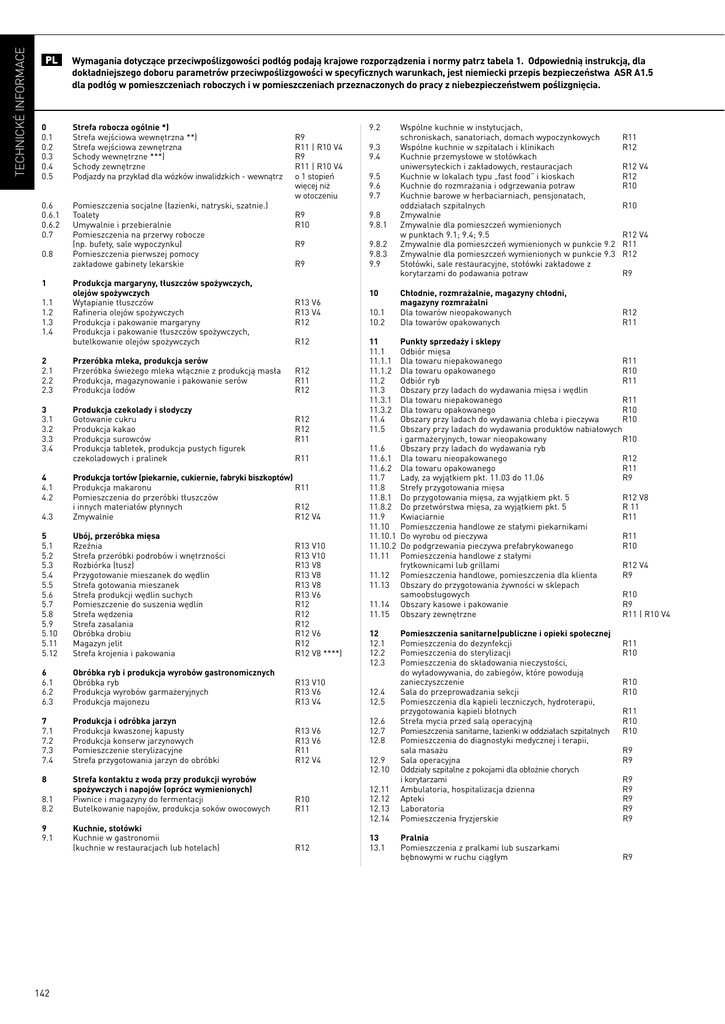TECHNICKÉ INFORMACE PL Wymagania dotyczące przeciwpoślizgowości podłóg podają krajowe rozporządzenia i normy patrz tabela 1. Odpowiednią instrukcją, dla dokładniejszego doboru parametrów przeciwpoślizgowości w specyficznych warunkach, jest niemiecki przepis bezpieczeństwa ASR A1.5 dla podłóg w pomieszczeniach roboczych i w pomieszczeniach przeznaczonych do pracy z niebezpieczeństwem poślizgnięcia. 0 Strefa robocza ogólnie *) 0.1 Strefa wejściowa wewnętrzna **) 0.2 Strefa wejściowa zewnętrzna 0.3 Schody wewnętrzne ***) 0.4 Schody zewnętrzne 0.5 Podjazdy na przykład dla wózków inwalidzkich - wewnątrz 0.6 Pomieszczenia socjalne (łazienki, natryski, szatnie.) 0.6.1 Toalety 0.6.2 Umywalnie i przebieralnie 0.7 Pomieszczenia na przerwy robocze (np. bufety, sale wypoczynku) 0.8 Pomieszczenia pierwszej pomocy zakładowe gabinety lekarskie 1 Produkcja margaryny, tłuszczów spożywczych, olejów spożywczych 1.1 Wytapianie tłuszczów 1.2 Rafineria olejów spożywczych 1.3 Produkcja i pakowanie margaryny 1.4 Produkcja i pakowanie tłuszczów spożywczych, butelkowanie olejów spożywczych R9 R11 | R10 V4 R9 R11 | R10 V4 o 1 stopień więcej niż w otoczeniu R9 R10 R9 R9 R13 V6 R13 V4 R12 R12 2 2.1 2.2 2.3 Przeróbka mleka, produkcja serów Przeróbka świeżego mleka włącznie z produkcją masła Produkcja, magazynowanie i pakowanie serów Produkcja lodów 3 3.1 3.2 3.3 3.4 Produkcja czekolady i słodyczy Gotowanie cukru Produkcja kakao Produkcja surowców Produkcja tabletek, produkcja pustych figurek czekoladowych i pralinek 4 4.1 4.2 4.3 Produkcja tortów (piekarnie, cukiernie, fabryki biszkoptów) Produkcja makaronu R11 Pomieszczenia do przeróbki tłuszczów i innych materiałów płynnych R12 Zmywalnie R12 V4 5 5.1 5.2 5.3 5.4 5.5 5.6 5.7 5.8 5.9 5.10 5.11 5.12 Ubój, przeróbka mięsa Rzeźnia Strefa przeróbki podrobów i wnętrzności Rozbiórka (tusz) Przygotowanie mieszanek do wędlin Strefa gotowania mieszanek Strefa produkcji wędlin suchych Pomieszczenie do suszenia wędlin Strefa wędzenia Strefa zasalania Obróbka drobiu Magazyn jelit Strefa krojenia i pakowania R13 V10 R13 V10 R13 V8 R13 V8 R13 V8 R13 V6 R12 R12 R12 R12 V6 R12 R12 V8 ****) 6 6.1 6.2 6.3 Obróbka ryb i produkcja wyrobów gastronomicznych Obróbka ryb Produkcja wyrobów garmażeryjnych Produkcja majonezu R13 V10 R13 V6 R13 V4 7 7.1 7.2 7.3 7.4 Produkcja i odróbka jarzyn Produkcja kwaszonej kapusty Produkcja konserw jarzynowych Pomieszczenie sterylizacyjne Strefa przygotowania jarzyn do obróbki R13 V6 R13 V6 R11 R12 V4 8 8.1 8.2 Strefa kontaktu z wodą przy produkcji wyrobów spożywczych i napojów (oprócz wymienionych) Piwnice i magazyny do fermentacji Butelkowanie napojów, produkcja soków owocowych R10 R11 9 9.1 Kuchnie, stołówki Kuchnie w gastronomii (kuchnie w restauracjach lub hotelach) R12 142 R12 R11 R12 R12 R12 R11 R11 9.2 9.3 9.4 9.5 9.6 9.7 9.8 9.8.1 9.8.2 9.8.3 9.9 Wspólne kuchnie w instytucjach, schroniskach, sanatoriach, domach wypoczynkowych R11 Wspólne kuchnie w szpitalach i klinikach R12 Kuchnie przemysłowe w stołówkach uniwersyteckich i zakładowych, restauracjach R12 V4 Kuchnie w lokalach typu „fast food” i kioskach R12 Kuchnie do rozmrażania i odgrzewania potraw R10 Kuchnie barowe w herbaciarniach, pensjonatach, oddziałach szpitalnych R10 Zmywalnie Zmywalnie dla pomieszczeń wymienionych w punktach 9.1; 9.4; 9.5 R12 V4 Zmywalnie dla pomieszczeń wymienionych w punkcie 9.2 R11 Zmywalnie dla pomieszczeń wymienionych w punkcie 9.3 R12 Stołówki, sale restauracyjne, stołówki zakładowe z korytarzami do podawania potraw R9 10 10.1 10.2 Chłodnie, rozmrażalnie, magazyny chłodni, magazyny rozmrażalni Dla towarów nieopakowanych Dla towarów opakowanych R12 R11 11 Punkty sprzedaży i sklepy 11.1 Odbiór mięsa 11.1.1 Dla towaru niepakowanego R11 11.1.2 Dla towaru opakowanego R10 11.2 Odbiór ryb R11 11.3 Obszary przy ladach do wydawania mięsa i wędlin 11.3.1 Dla towaru niepakowanego R11 11.3.2 Dla towaru opakowanego R10 11.4 Obszary przy ladach do wydawania chleba i pieczywa R10 11.5 Obszary przy ladach do wydawania produktów nabiałowych i garmażeryjnych, towar nieopakowany R10 11.6 Obszary przy ladach do wydawania ryb 11.6.1 Dla towaru nieopakowanego R12 11.6.2 Dla towaru opakowanego R11 11.7 Lady, za wyjątkiem pkt. 11.03 do 11.06 R9 11.8 Strefy przygotowania mięsa 11.8.1 Do przygotowania mięsa, za wyjątkiem pkt. 5 R12 V8 11.8.2 Do przetwórstwa mięsa, za wyjątkiem pkt. 5 R 11 11.9 Kwiaciarnie R11 11.10 Pomieszczenia handlowe ze stałymi piekarnikami 11.10.1 Do wyrobu od pieczywa R11 11.10.2 Do podgrzewania pieczywa prefabrykowanego R10 11.11 Pomieszczenia handlowe z stałymi frytkownicami lub grillami R12 V4 11.12 Pomieszczenia handlowe, pomieszczenia dla klienta R9 11.13 Obszary do przygotowania żywności w sklepach samoobsługowych R10 11.14 Obszary kasowe i pakowanie R9 11.15 Obszary zewnętrzne R11 | R10 V4 12 12.1 12.2 12.3 12.4 12.5 12.6 12.7 12.8 12.9 12.10 12.11 12.12 12.13 12.14 Pomieszczenia sanitarne|publiczne i opieki społecznej Pomieszczenia do dezynfekcji Pomieszczenia do sterylizacji Pomieszczenia do składowania nieczystości, do wyładowywania, do zabiegów, które powodują zanieczyszczenie Sala do przeprowadzania sekcji Pomieszczenia dla kąpieli leczniczych, hydroterapii, przygotowania kąpieli błotnych Strefa mycia przed salą operacyjną Pomieszczenia sanitarne, łazienki w oddziałach szpitalnych Pomieszczenia do diagnostyki medycznej i terapii, sala masażu Sala operacyjna Oddziały szpitalne z pokojami dla obłożnie chorych i korytarzami Ambulatoria, hospitalizacja dzienna Apteki Laboratoria Pomieszczenia fryzjerskie 13 13.1 Pralnia Pomieszczenia z pralkami lub suszarkami bębnowymi w ruchu ciągłym R11 R10 R10 R10 R11 R10 R10 R9 R9 R9 R9 R9 R9 R9 R9