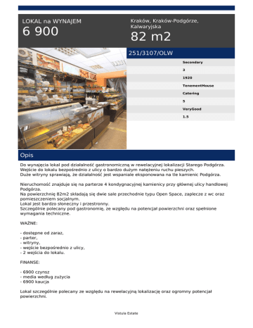 LOKAL na WYNAJEM 6 900 Kraków, Kraków-Podgórze, Kalwaryjska 82 m2 251/3107/OLW Secondary 3 1920 TenementHouse Catering 5 VeryGood 1.5 Opis Do wynajęcia lokal pod działalność gastronomiczną w rewelacyjnej lokalizacji Starego Podgórza. Wejście do lokalu bezpośrednio z ulicy o bardzo dużym natężeniu ruchu pieszych. Duże witryny sprawiają, że działalność jest wspaniale eksponowana na tle kamienic Podgórza. Nieruchomość znajduje się na parterze 4 kondygnacyjnej kamienicy przy głównej ulicy handlowej Podgórza. Na powierzchnię 82m2 składają się dwie sale przechodnie typu Open Space, zaplecze z wc oraz pomieszczeniem socjalnym. Lokal jest bardzo słoneczny i przestronny. Szczególnie polecany pod gastronomię, ze względu na potencjał powierzchni oraz spełnione wymagania techniczne. WAŻNE: - dostępne od zaraz, parter, witryny, wejście bezpośrednio z ulicy, 2 wejścia do lokalu. FINANSE: - 6900 czynsz - media według zużycia - 6900 kaucja Lokal szczególnie polecany ze względu na rewelacyjną lokalizację oraz ogromny potencjał powierzchni. Vistula Estate Zapraszam do kontaktu w celu osobistej wizyty w oferowanym obiekcie. Aleksandra Weryńska doradca ds. najmu komercyjnego 731 706 011 [email protected] To rent the catering business in a superb location of the Old Podgórze. The entrance to the premises directly from the street with very high pedestrian traffic. Large sites make the business is exposed to great background tenements foothills. The property is located on the ground floor of 4 storey building on the main shopping street foothills. On the surface of 82m2 consists of two rooms passers Open Space, Meeting with toilet and social room. The restaurant is very bright and spacious. Especially recommended in gastronomy, because of the potential of the area and met the technical requirements. IMPORTANT: - available immediately the ground floor the site the entrance directly from the street, 2 entrances to the premises. FINANCE: - 6900 rent - according to media consumption - 6900 deposit Lokal especially recommended due to the superior location and great potential surface. Feel free to contact for a personal visit to the facility offered. Aleksandra Weryńska Commercial lease 731 706 011 [email protected] Aleksandra Weryńska tel. 731706011 email: [email protected] Vistula Estate Powered by TCPDF (www.tcpdf.org)