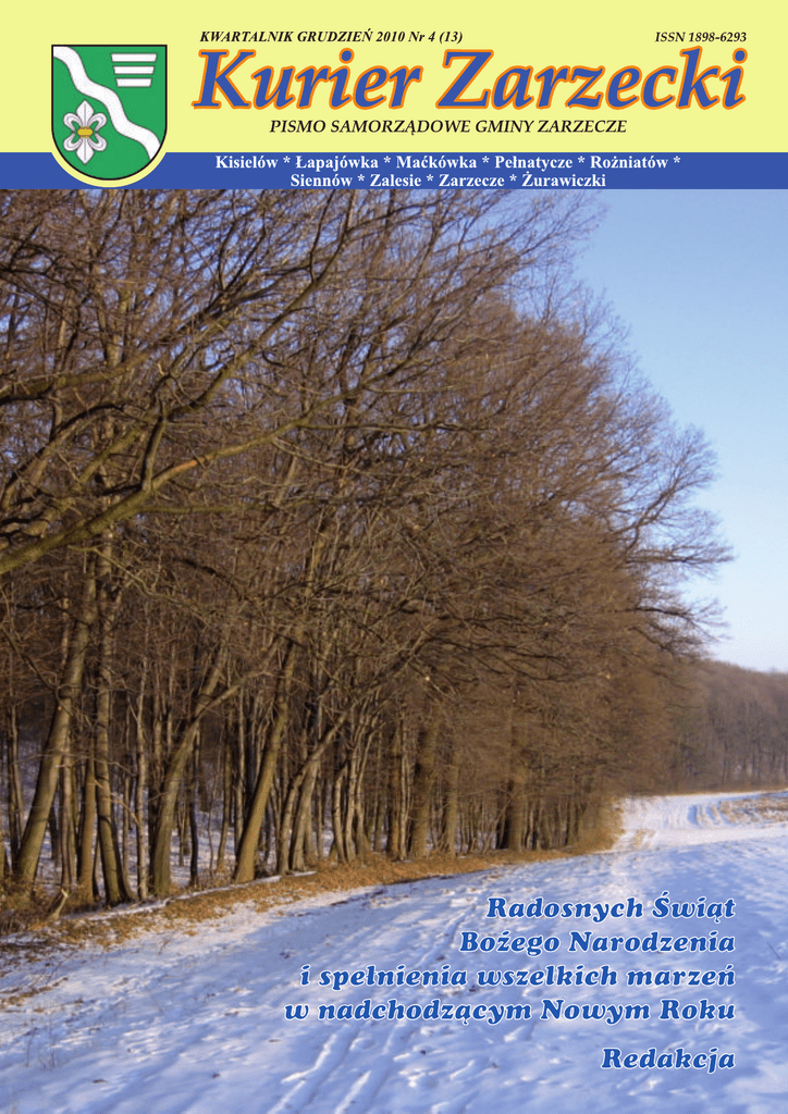 KURIER ZARZECKI WYBORY SAMORZĄDOWE 2010 21 listopada 2010 roku wybraliśmy w okręgu wyborczym nr 9 – Żurawiczki: nowe władze samorządowe. W naszej gminie Chrobak Marian, Pieniążek Izydor, Pieniążek głosowaliśmy Marek. na wójta oraz radnych wojewódzkich. W wyniku wyborów na Wójta Gminy Wybory na terenie gminy Zarzecze przebiegły Zarzecze – wójtem został Wiesław Kubicki spokojnie, uzyskując 72,88 % ważnych głosów. gminnych, powiatowych nie i odnotowano przypadków Dokładne wyniki wyborów i statystyki złamania ciszy wyborczej oraz agitacji w dniu przedstawione są na stronie Państwowej wyborów. Komisji Głosowanie w lokalach wyborczych Wyborczej w rozpoczęło się o godz. 8.00 i przebiegało bez www.pkw.gov.pl zakłóceń do godz. 22.00. W gminie Zarzecze Samorządowe 2010”. najniższa frekwencja wyniosła 45,86 Do % pod Rady adresem zakładce Powiatu „Wybory Przeworskiego w Rożniatowie, z kolei najwyższą frekwencję z okręgu wyborczego, obejmującego swoim odnotowano w Łapajówce i wyniosła 81,55 %. zasięgiem gminę Gać i Zarzecze wszedł Średnia frekwencja w wyborach do Rady Tadeusz Kiełbowicz zdobywając 1396 głosów. W wyborach do Sejmiku Województwa Gminy wyniosła 59,34 %. Podkarpackiego W wyniku wyborów radnymi Rady z Gminy Zarzecze zostali: w okręgu wyborczym najlepszy nr 1 – Kisielów: Machaj Robert; w okręgu zdobywając 4455 głosów. W wyborczym nr 2 – Łapajówka: Drapała wynik terenu dniu uzyskał 2 Tomasz grudnia 2010 Bury roku, w Maćkówka: w Zarzeczu odbyła się I Sesja VI Kadencji Rady Tadeusz, Superson Gminy Pełnatycze: okręgu głosowania Przewodniczącym Rady został wyborczym nr 5 – Rożniatów wyborów nie Izydor Pieniążek, a zastępcą Małgorzata przeprowadzono, Gminy Górska. Wybrano również przewodniczących Małgorzata; komisji, którymi zostali: Marian Chrobak – w okręgu wyborczym nr 6 – Siennów: Boratyn Komisja Rewizyjna; Tadeusz Płocica – Komisja Roman, Buczek Adam; w okręgu wyborczym d/s nr 7 – Zalesie: Jamroży Anna; w okręgu Katarzyna Balawender – Komisja d/s oświaty, wyborczym nr 8 – Zarzecze: Balawender kultury, kultury fizycznej, zdrowia i rodziny. „z urzędu” Tadeusz; radną została w Rady Górska Katarzyna, Boratyn Stanisław, Skałuba Józef; -3- rozwoju W Dzieduszyckich Zygmunt; w okręgu wyborczym nr 4 – Płocica Zarzecze. pałacu gminy Kazimierz; w okręgu wyborczym nr 3 – Karkut zabytkowym naszej wyniku gospodarczego i tajnego rozwoju; KURIER ZARZECKI 30 listopada 2010 roku odbyła się W dniu 29 listopada 2010 r. odbyła się Powiatu I sesja IV kadencji Sejmiku Województwa Przeworskiego. W wyniku tajnego głosowania Podkarpackiego. Na Marszałka Województwa na Przewodniczącego Rady został ponownie wybrany został dotychczasowy Wojewoda – wybrany nasz radny Tadeusz Kiełbowicz, Mirosław ponownie wybrano również Starostę Powiatu w naszym okręgu wyborczym Lucjan Kuźniar Zbigniewa Kiszkę, a funkcję Wicestarosty został członkiem Zarządu Województwa. I sesja IV kadencji Rady Karapyta, natomiast startujący powierzono Krzysztofowi Kłakowi. Paweł Płocica PROJEKT BUDŻETU GMINY ZARZECZE NA ROK 2011 Planowane dochody Gminy Zarzecze na rok 2011 wynoszą 19.353 tys. zł, w tym: 1. Dochody własne 3.539 tys. zł podatek rolny 532 tys. zł podatek od nieruchomości 1.044 tys. zł podatek od środków transportowych 42 tys. zł pozostałe podatki opłaty 393 tys. zł wpływy ze sprzedaży nieruchomości 191 tys. zł podatek od dochodów osobistych 1.337 tys. zł 2. Subwencje 10.304 tys. zł oświatowa 6.256 tys. zł wyrównawcza 3.789 tys. zł równoważąca 259 tys. zł 2.614 tys. zł 3. Dotacje na zadania zlecone i własne ZADANIA Z ZAKRESU OPIEKI SPOŁECZNEJ świadczenia rodzinne 2.400 tys. zł zasiłki i pomoc w naturze 79 tys. zł usługi opiekuńcze i specjalistyczne 7 tys. zł utrzymanie ośrodka pomocy społecznej 82 tys. zł ZADANIA Z ZAKRESU ADMINISTRACJI RZĄDOWEJ administracja publiczna 44 tys. zł prowadzenie rejestru wyborców 2 tys. zł 4. Dotacja z Wojewódzkiego Funduszu Ochrony Środowiska i Gospodarki Wodnej 39 tys. zł wysadzenie drzew i krzewów w parku 39 tys. zł 5. Dotacje ze środków funduszy strukturalnych na realizację projektów w ramach Programu Operacyjnego ,,Kapitał Ludzki” 554 tys. zł „Czas na aktywność w Gminie Zarzecze” realizowany przez Gminny Ośrodek Pomocy Społecznej 134 tys. zł -4- KURIER ZARZECKI „Edukacja wysokiej jakości szansą dla młodzieży gimnazjalnej z Gminy Zarzecze” realizowany przez Publiczne Gimnazjum im. Jana Pawła II w Zarzeczu 346 tys. zł „Edukacja wysokiej jakości szansą dla uczniów ze Szkoły Podstawowej w Siennowie” realizowany przez Szkołę Podstawową im. Marii Konopnickiej w Siennowie 74 tys. zł 6. Dotacje z Europejskiego Funduszu Rozwoju Regionalnego na realizację zadań inwestycyjnych 2.877 tys. zł 611 tys. zł modernizacja oczyszczalni ścieków w Zarzeczu 647 tys. zł rewitalizacja zabytkowego parku w Zarzeczu 404 tys. zł Gminne Centrum Sportu i Rekreacji w Zarzeczu 500 tys. zł Odnowa i rozwój wsi Żurawiczki 217 tys. zł Podkarpacki System e-Administracja Publiczna - PSeAP 498 tys. zł remont drogi w Zalesiu Planowane wydatki Gminy Zarzecze na rok 2011 wynoszą 21.747 tys. zł i obejmują następujące zadania: zadania inwestycyjne przedstawia poniższa tabela: LP Nazwa zadania 1. Modernizacja Ogółem wartość zadania w tys. zł 4.885 tys. zł Wydatki poniesione w 2010 r. Środki Dotacja w własne tys. zł w tys. zł Planowane wydatki w 2011 r. Środki Dotacja własne w tys. zł w tys. zł 3.925 1.078 1.734 502 611 2.191 475 1.117 195 404 3.596 469 2.301 179 647 807 - - 307 500 996 - - 498 498 452 296 - 156 - oczyszczalni ścieków w Zarzeczu 2. Gminne Centrum Sportu 3. i Rekreacji w Zarzeczu Rewitalizacja parku w Zarzeczu 4. Odnowa i rozwój wsi Żurawiczki 5. Remont drogi 6. w Zalesiu Modernizacja Ośrodków Zdrowia w Zarzeczu i Żurawiczkach -5-