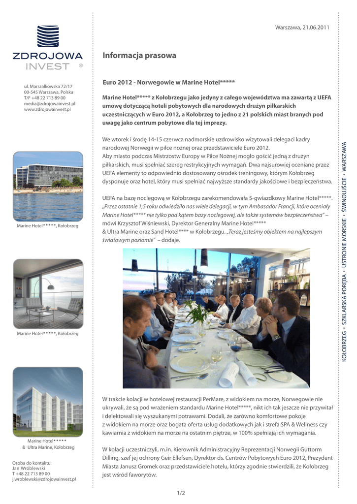 Warszawa, 21.06.2011 Informacja prasowa Euro 2012 - Norwegowie w Marine Hotel***** , Kołobrzeg Marine Hotel , Kołobrzeg KOŁOBRZEG SZKLARSKA PORĘBA Marine Hotel UEFA na bazę noclegową w Kołobrzegu zarekomendowała 5-gwiazdkowy Marine Hotel*****. „Przez ostatnie 1,5 roku odwiedziło nas wiele delegacji, w tym Ambasador Francji, które oceniały Marine Hotel***** nie tylko pod kątem bazy noclegowej, ale także systemów bezpieczeństwa” – mówi Krzysztof Wiśniewski, Dyrektor Generalny Marine Hotel***** & Ultra Marine oraz Sand Hotel**** w Kołobrzegu. „Teraz jesteśmy obiektem na najlepszym światowym poziomie” – dodaje. ŚWINOUJŚCIE We wtorek i środę 14-15 czerwca nadmorskie uzdrowisko wizytowali delegaci kadry narodowej Norwegii w piłce nożnej oraz przedstawiciele Euro 2012. Aby miasto podczas Mistrzostw Europy w Piłce Nożnej mogło gościć jedną z drużyn piłkarskich, musi spełniać szereg restrykcyjnych wymagań. Dwa najsurowiej oceniane przez UEFA elementy to odpowiednio dostosowany ośrodek treningowy, którym Kołobrzeg dysponuje oraz hotel, który musi spełniać najwyższe standardy jakościowe i bezpieczeństwa. WARSZAWA Marine Hotel***** z Kołobrzegu jako jedyny z całego województwa ma zawartą z UEFA umowę dotyczącą hoteli pobytowych dla narodowych drużyn piłkarskich uczestniczących w Euro 2012, a Kołobrzeg to jedno z 21 polskich miast branych pod uwagę jako centrum pobytowe dla tej imprezy. USTRONIE MORSKIE ul. Marszałkowska 72/17 00-545 Warszawa, Polska T/F +48 22 713 89 00 [email protected] www.zdrojowainvest.pl W trakcie kolacji w hotelowej restauracji PerMare, z widokiem na morze, Norwegowie nie ukrywali, że są pod wrażeniem standardu Marine Hotel*****, nikt ich tak jeszcze nie przywitał i delektowali się wyszukanymi potrawami. Dodali, że zarówno komfortowe pokoje z widokiem na morze oraz bogata oferta usług dodatkowych jak i strefa SPA & Wellness czy kawiarnia z widokiem na morze na ostatnim piętrze, w 100% spełniają ich wymagania. Marine Hotel & Ultra Marine, Kołobrzeg Osoba do kontaktu: Jan Wróblewski T +48 22 713 89 00 [email protected] W kolacji uczestniczyli, m.in. Kierownik Administracyjny Reprezentacji Norwegii Guttorm Dilling, szef jej ochrony Geir Ellefsen, Dyrektor ds. Centrów Pobytowych Euro 2012, Prezydent Miasta Janusz Gromek oraz przedstawiciele hotelu, którzy zgodnie stwierdzili, że Kołobrzeg jest wśród faworytów. 1/2 Cristal Resort Szklarska Poręba Zdrojowa Invest to dynamicznie rozwijający się kołobrzeski holding inwestycyjno + -deweloperski i hotelarski w segmencie second home. Naszym głównym produktem są obiekty apartamentowo-hotelowe i usługowe z systemem zarządzania wynajmem, czyli apartamenty na sprzedaż z gwarancją zysku dla Kupującego i możliwością korzystania z apartamentu na własne potrzeby. Większość inwestycji to condo hotele, a więc z jednej strony sprzedajemy apartamenty, a z drugiej prowadzimy na nich działalność hotelarską. Wszystkie inwestycje mają charakter Premium, a realizowane są w najpiękniejszych polskich miejscowościach wypoczynkowych i tylko w topowych lokalizacjach. Więcej informacji na www.zdrojowainvest.pl ŚWINOUJŚCIE KOŁOBRZEG Ściągnij zdjęcia naszych inwestycji w wysokiej rozdzielczości z: www.zdrojowainvest.pl zakładka: Biuro Prasowe / Pobierz multimedia USTRONIE MORSKIE O deweloperze SZKLARSKA PORĘBA Ostateczne decyzje zapadną jednak po eliminacjach do mistrzostw Europy. Jak zapowiada Miasto Kołobrzeg, jeszcze w tym miesiącu materiały promujące ten ośrodek pobytowy trafią do wszystkich drużyn mających szansę na udział w Mistrzostwach Europy w piłce nożnej. WARSZAWA ul. Marszałkowska 72/17 00-545 Warszawa, Polska T/F +48 22 713 89 00 [email protected] www.zdrojowainvest.pl Boulevard Ustronie Morskie Kudowa Towers Osoba do kontaktu: Jan Wróblewski T +48 22 713 89 00 [email protected] 2/2